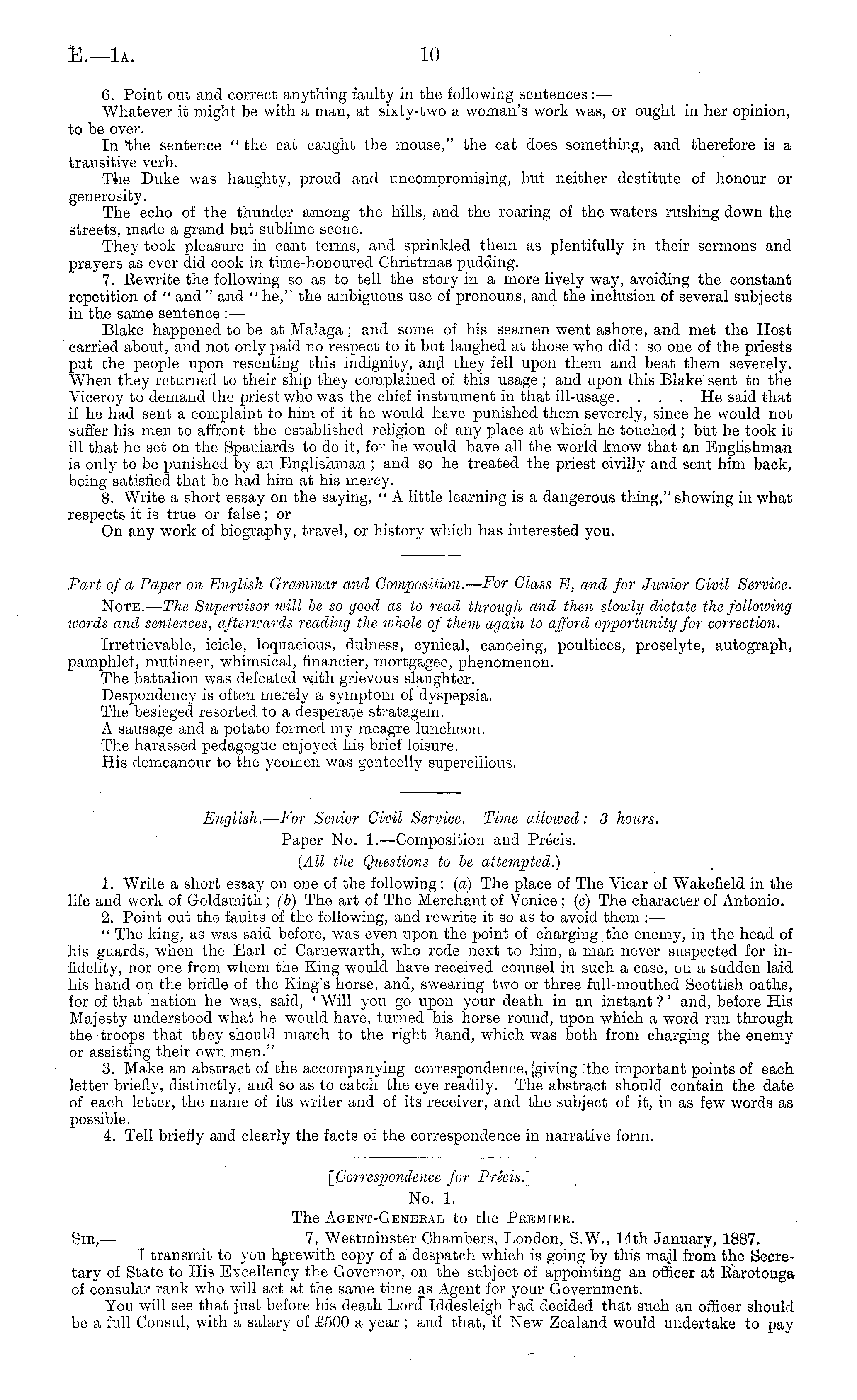 Part of a Paper on English Grammar and Composition. — For Class E, and for Junior Civil Service. Note.— The Supervisor will be so good as to read through and then slowly dictate the following ivords and sentences, afterwards reading the whole of them again to afford opportunity for correction. Irretrievable, icicle, loquacious, dulness, cynical, canoeing, poultices, proselyte, autograph, pamphlet, mutineer, whimsical, financier, mortgagee, phenomenon. The battalion was defeated with grievous slaughter. Despondency is often merely a symptom of dyspepsia. The besieged resorted to a desperate stratagem. A sausage and a potato formed my meagre luncheon. The harassed pedagogue enjoyed his brief leisure. His demeanour to the yeomen was genteelly supercilious.