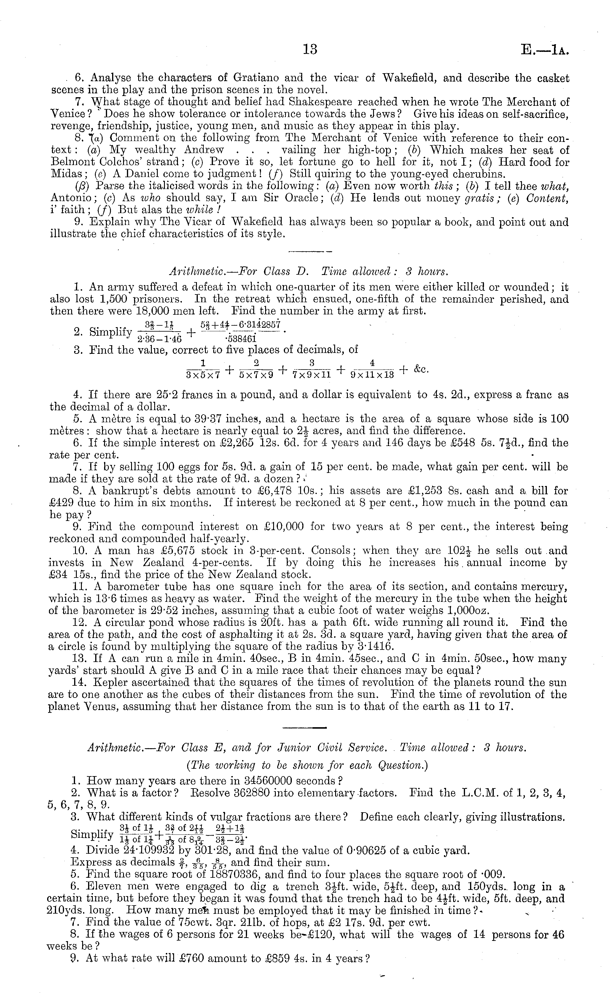 Arithmetic. — For Glass E, and for Junior Civil Service. Time allowed: 3 hours. (The working to be shown for each Question.) 1. How many years are there in 34560000 seconds ? 2. What is a factor? Eesolve 362880 into elementary factors. Find the L.C.M. of 1, 2, 3, 4, 5, 6, 7, 8, 9. 3. What different kinds of vulgar fractions are there? Define each clearly, giving illustrations. „. ... 31 of 11 ,3# of 2*l 21+1* 4. Divide 24-109932 by 301-28, and find the value of 0-90625 of a cubic yard. Express as decimals f, ■£%, ■£■%, and find their sum. 5. Find the square root of 18870336, and find to four places the square root of -009. 6. Eleven men were engaged to dig a trench 3|-ft. wide, sJft. deep, and 150 yds. long in a certain time, but before they began it was found that the trench had to be 4-|ft. wide, sft. deep, and 210 yds. long. How many met must be employed that it may be finished in time ?• 7. Eind the value of 75cwt. 3qr. 211b. of hops, at £2 17s. 9d. per cwt. 8. If the wages of 6 persons for 21 weeks be-£l2O, what will the wages of 14 persons for 46 weeks be ? 9. At what rate will £760 amount to £859 4s. in 4 years ?