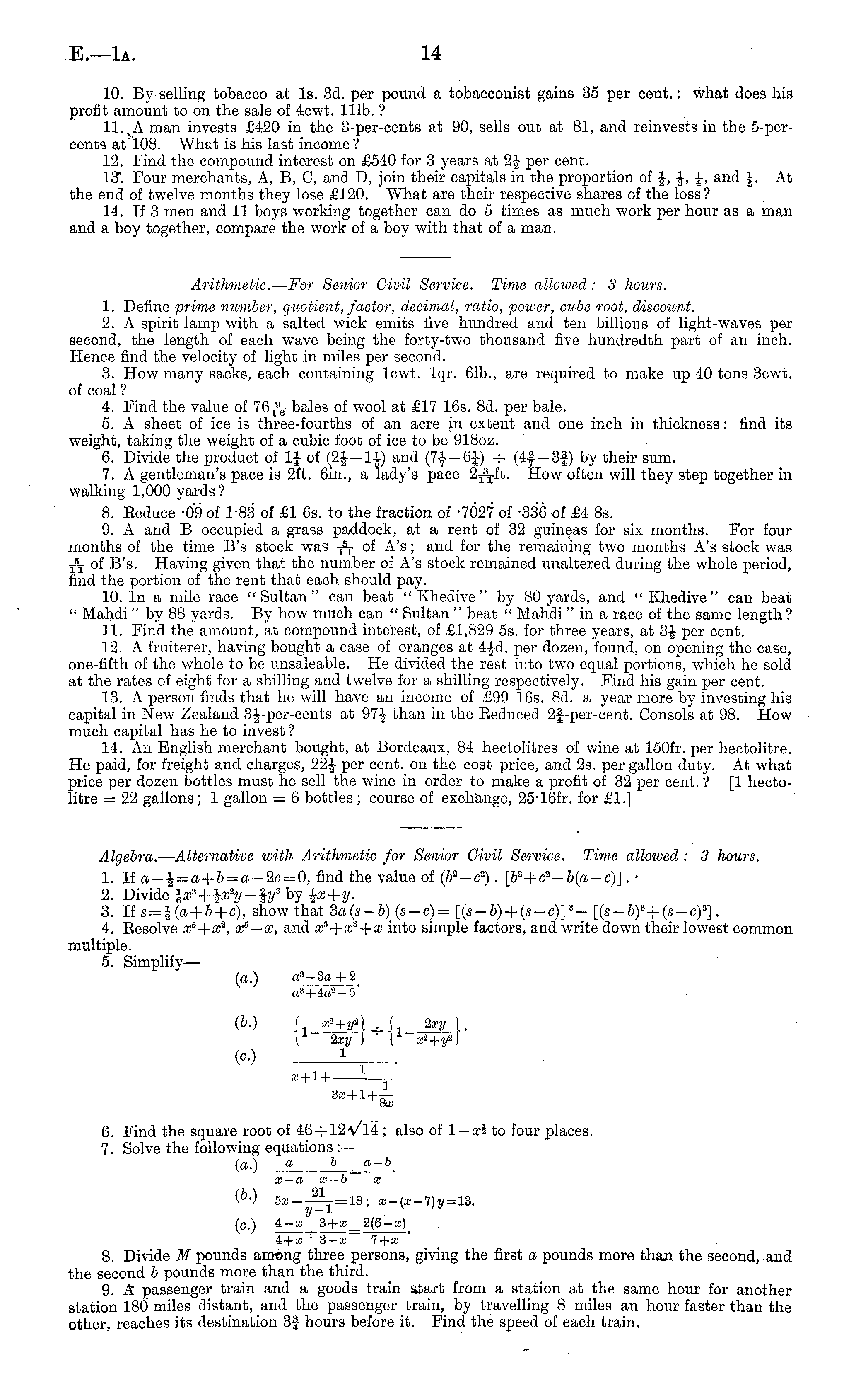 Arithmetic. — For Senior Civil Service. Time allowed: 3 hours. 1. Define prime number, quotient, factor, decimal, ratio, power, cube root, discount. 2. A spirit lamp with a salted wick emits five hundred and ten billions of light-waves per second, the length of each wave being the forty-two thousand five hundredth part of an inch. Hence find the velocity of light in miles per second. 3. How many sacks, each containing lcwt. lqr. 61b., are required to make up 40 tons 3cwt. of coal? 4. Find the value of 76 T 9c- bales of wool at £17 16s. Bd. per bale. 5. A sheet of ice is three-fourths of an acre in extent and one inch in thickness: find its weight, taking the weight of a cubic foot of ice to be 918oz. 6. Divide the product of 1} of (2s-li) and (7f-6J) -±- (4f-3f) by their sum. 7. A gentleman's pace is 2ft. 6in., a lady's pace 2^\ft. How often will they step together in walking 1,000 yards? 8. Seduce -09 of 1-83 of £1 6s. to the fraction of -7027 of -336 of £4 Bs. 9. A and B occupied a grass paddock, at a rent of 32 guineas for six months. For four months of the time B's stock was T S T of A's; and for the remaining two months A's stock was T S T of B's. Having given that the number of A's stock remained unaltered during the whole period, find the portion of the rent that each should pay. 10. In a mile race "Sultan" can beat "Khedive" by 80 yards, and "Khedive" can beat " Mahdi" by 88 yards. By how much can " Sultan " beat " Mahdi" in a race of the same length ? 11. Find the amount, at compound interest, of £1,829 ss. for three years, at 3-J per cent. 12. A fruiterer, having bought a case of oranges at 4-J-d. per dozen, found, on opening the case, one-fifth of the whole to be unsaleable. He divided the rest into two equal portions, which he sold at the rates of eight for a shilling and twelve for a shilling respectively. Find his gain per cent. 13. A person finds that he will have an income of £99 16s. Bd. a year more by investing his capital in New Zealand 3-J-per-cents at 97J than in the Seduced 2f-per-eent. Consols at 98. How much capital has he to invest ? 14. An English merchant bought, at Bordeaux, 84 hectolitres of wine at 150fr. per hectolitre. He paid, for freight and charges, 22J per cent, on the cost price, and 2s. per gallon duty. At what price per dozen bottles must he sell the wine in order to make a profit of 32 per cent. ? [1 hectolitre =22 gallons; 1 gallon = 6 bottles; course of exchange, 25'16fr. for £I.]