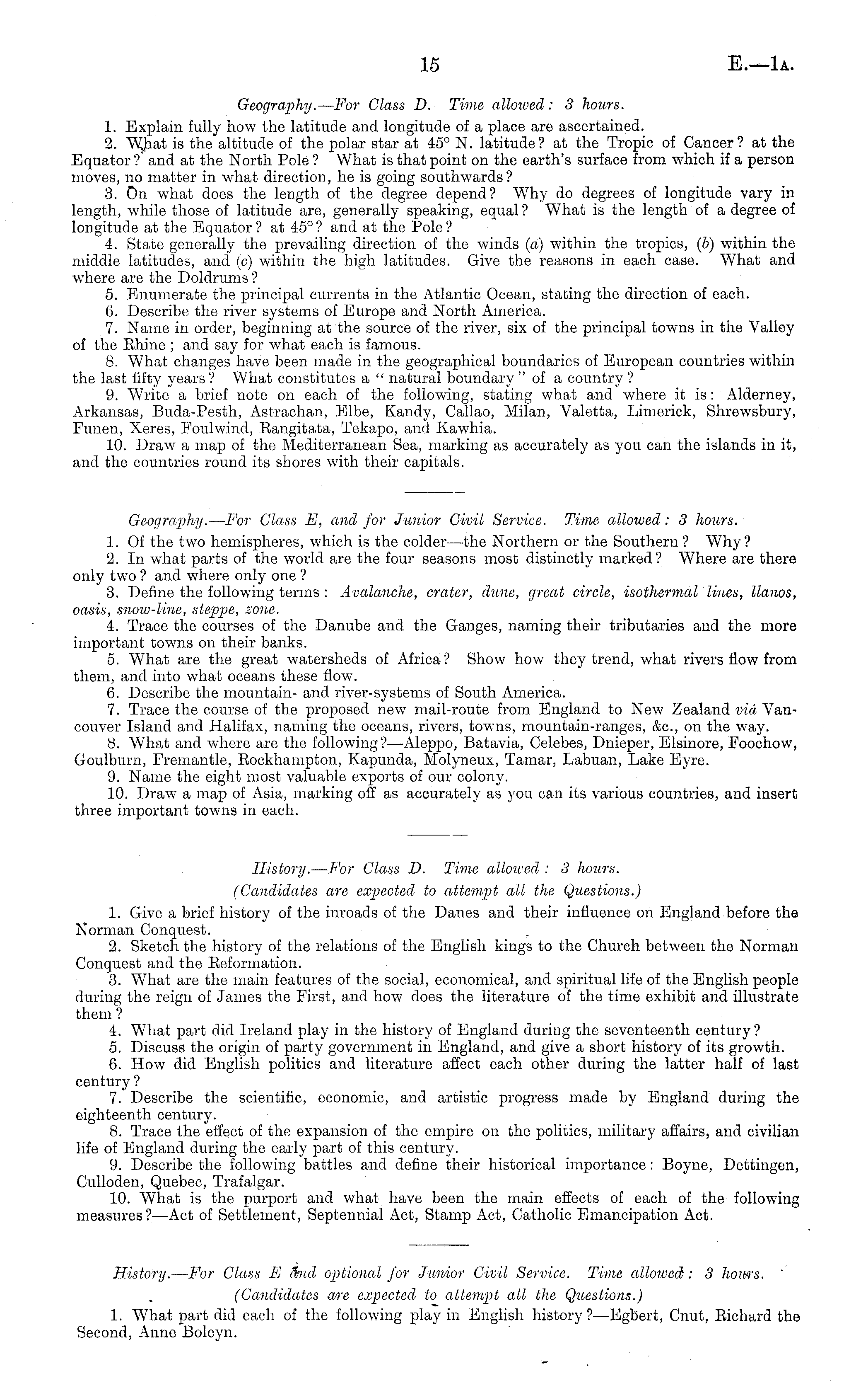 History. — For Class D. Time allowed : 3 hours. (Candidates are expected to attempt all the Questions.) 1. Give a brief history of the inroads of the Danes and their influence on England before the Norman Conquest. 2. Sketch the history of the relations of the English kings to the Church between the Norman Conquest and the Reformation. 3. What are the main features of the social, economical, and spiritual life of the English people during the reign of James the First, and how does the literature of the time exhibit and illustrate them ? 4. What part did Ireland play in the history of England during the seventeenth century ? 5. Discuss the origin of party government in England, and give a short history of its growth. 6. How did English politics and literature affect each other during the latter half of last century ? 7. Describe the scientific, economic, and artistic progress made by England during the eighteenth century. 8. Trace the effect of the expansion of the empire on the politics, military affairs, and civilian life of England during the early part of this century. 9. Describe the following battles and define their historical importance: Boyne, Dettingen, Culloden, Quebec, Trafalgar. 10. What is the purport and what have been the main effects of each of the following measures?— Act of Settlement, Septennial Act, Stamp Act, Catholic Emancipation Act.