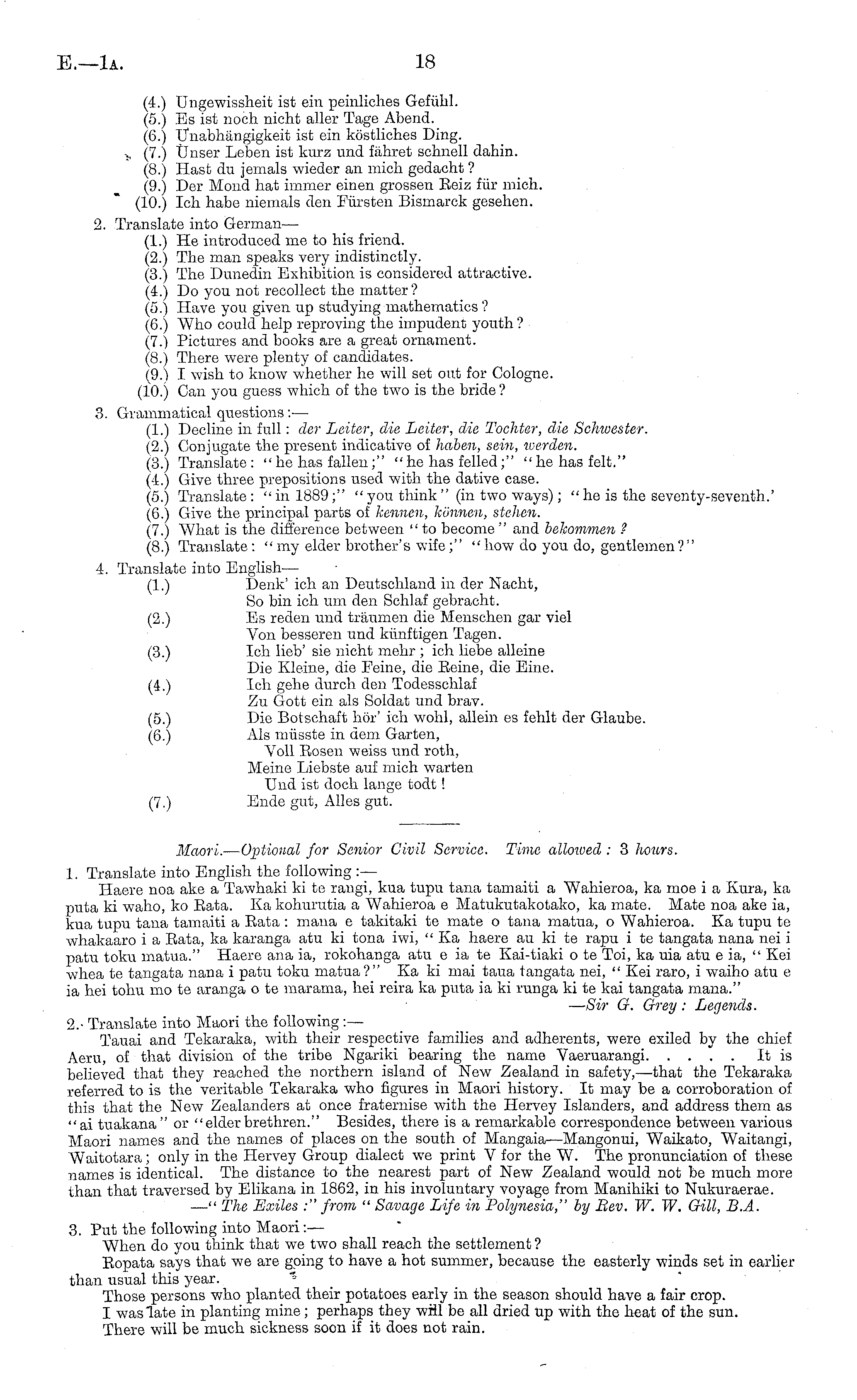 Maori. — Optional for Senior Civil Service. Time allowed : 3 hours. 1. Translate into English the following : — Haere noa ake a Tawhaki kite rangi, kua tupu tana tamaiti a Wahieroa, ka moe i a Kura, ka puta ki waho, ko Eata. Ka kohurutia a Wahieroa c Matukutakotako, ka mate. Mate noa ake ia, kua tupu tana tamaiti a Eata : mana c takitaki te mate o tana matua, o Wahieroa. Ka tupu te whakaaro i a Eata, ka karanga atu ki tona iwi, " Ka haere au kite rapu i te tangata nana nei i patu toku matua." Haere ana ia, rokohanga atu c ia te Kai-tiaki ote Toi, ka via atu c ia, " Kei whea te tangata nana i patu toku matua?" Ka ki mai taua tangata nei, " Kei raro, i waiho atu c ia hei tohu mo te aranga o te marama, hei reira ka puta ia ki runga kite kai tangata mana." — Sir G. Grey: Legends. 2.' Translate into Maori the following : — Tauai and Tekaraka, with their respective families and adherents, were exiled by the chief Aeru, of that division of the tribe Ngariki bearing the name Vaeruarangi It is believed that they reached the northern island of New Zealand in safety,—that the Tekaraka referred to is the veritable Tekaraka who figures in Maori history. It may be a corroboration of this that the New Zealanders at once fraternise with the Hervey Islanders, and address them as "ai tuakana" or "elderbrethren." Besides, there is a remarkable correspondence between various Maori names and the names of places on the south of Mangaia—Mangonui, Waikato, Waitangi, Waitotara; only in the Hervey Group dialect we print V for the W. The pronunciation of these names is identical. The distance to the nearest part of New Zealand would not be much more than that traversed by Elikana in 1862, in his involuntary voyage from Manihiki to Nukuraerae. —" The Exiles :" from " Savage Life in Polynesia," by Bey. W. W. Gill, B.A. 3. Put the following into Maori: — When do you think that we two shall reach the settlement ? Eopata says that we are going to have a hot summer, because the easterly winds set in earlier than usual this year. Those persons who planted their potatoes early in the season should have a fair crop. I was late in planting mine; perhaps they will be all dried up with the heat of the sun. There will be much sickness soon if it does not rain.