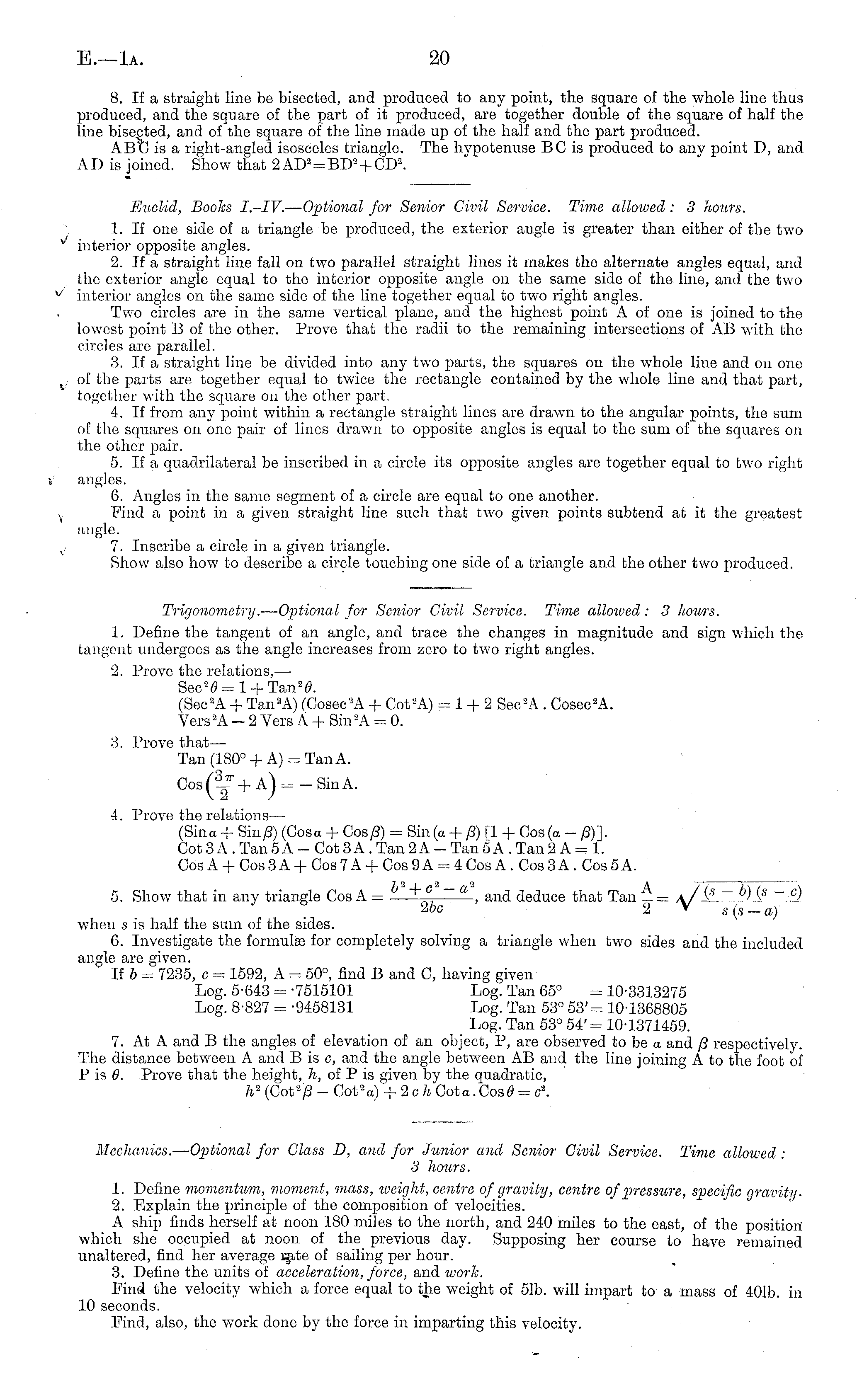 Trigonometry. — Optional for Senior Civil Service. Time alloived : 3 hours. 1. Define the tangent of an angle, and trace the changes in magnitude and sign which the tangent undergoes as the angle increases from zero to two light angles. 2. Prove the relations, — Sec 2f9 = l+Tan 2(9. (Sec aA + Tan 2A) (Cosec 2A + Cot 2A) =1 + 2 Sec' 2A . Cosec 2A. Vers 2A - 2 Yers A + Sin 2A =0. 3. Prove that—■ Tan (180° + A) = Tan A. Cos^+A^=-SmA. 4. Prove the relations— (Sina + Siß/3) (CoSa + Cos/3) = Sill (a + /?) |1 + Cos(a - /3)]. Cot 3 A . Tan 5 A - Cot 3 A . Tan 2 A - Tan 5 A . Tan 2 A = 1. CosA + Cos3A + Cos7A + Cos9A = 4CosA.Cos3A.CosSA. 5. Show that in any triangle Cos A= h * +°*~ a\ and deduce that Tan - = a/1! Zh l (? ~c) 26c ' 2 V s(s-a) when s is half the sum of the sides. 6. Investigate the formulae for completely solving a triangle when two sides and the included angle are given. If b = 7235, c = 1592, A = 50°, find B and C, having given Log. 5-643 = -7515101 Log. Tan 65° = 10-3313275 Log. 8-827 = -9458131 Log. Tan 53° 53'= 10-1368805 Log. Tan 53° 54'= 10-1371459. 7. At A and B the angles of elevation of an object, P, are observed to be a and /? respectively. The distance between A and B is c, and the angle between AB and the line joining A to the foot of Pis 6. Prove that the height, h, of Pis given by the quadratic, /4 2 (Cot' 2/3 - Cot 2a) + 2ch Cota.Costf = c 2.