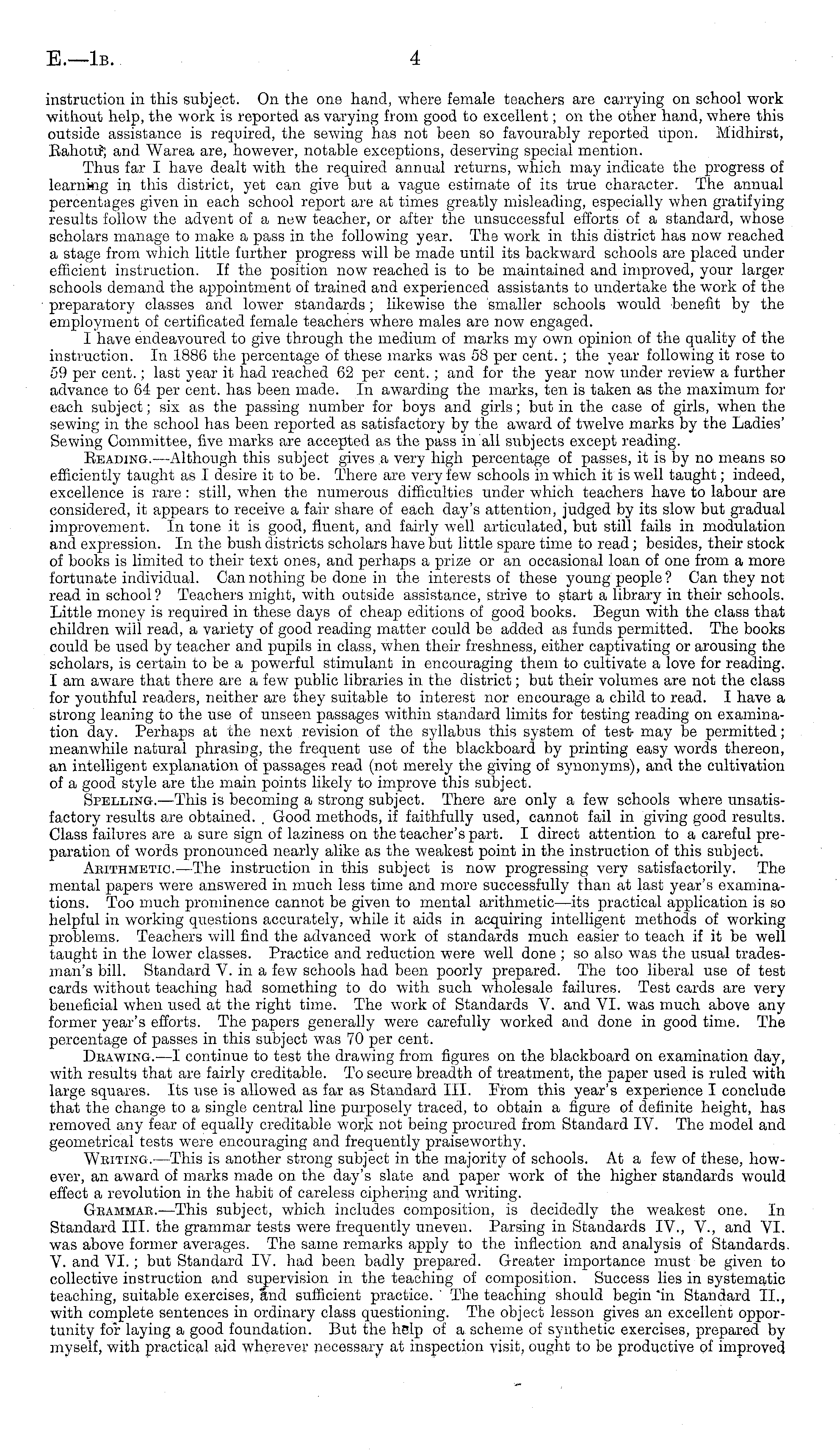 instruction in this subject. On the one hand, where female teachers are carrying on school w 7ork without help, the work is reported as varying from good to excellent; on the other hand, where this outside assistance is required, the sewing has not been so favourably reported upon. Midhirst, Bahotrf; and Warea are, however, notable exceptions, deserving special mention. Thus far I have dealt with the required annual returns, which may indicate the progress of learning in this district, yet can give but a vague estimate of its true character. The annual percentages given in each school report are at times greatly misleading, especially when gratifying results follow the advent of a new teacher, or after the unsuccessful efforts of a standard, whose scholars manage to make a pass in the following year. The work in this district has now reached a stage from which little further progress will be made until its backward schools are placed under efficient instruction. If the position now reached is to be maintained and improved, your larger schools demand the appointment of trained and experienced assistants to undertake the work of the preparatory classes and lower standards; likewise the smaller schools would benefit by the employment of certificated female teachers where males are now engaged. I have endeavoured to give through the medium of marks my own opinion of the quality of the instruction. In 1886 the percentage of these marks was 58 per cent. ; the year following it rose to 59 per cent.; last year it had reached 62 per cent. ; and for the year now under review a further advance to 64 per cent, has been made. In awarding the marks, ten is taken as the maximum for each subject; six as the passing number for boys and girls; but in the case of girls, when the sewing in the school has been reported as satisfactory by the award of twelve marks by the Ladies' Sewing Committee, five marks are accepted as the pass in all subjects except reading. Beading.—Although this subject gives a very high percentage of passes, it is by no means so efficiently taught as I desire it to be. There are very few schools in which it is well taught; indeed, excellence is rare : still, when the numerous difficulties under which teachers have to labour are considered, it appears to receive a fair share of each day's attention, judged by its slow but gradual improvement. In tone it is good, fluent, and fairly well articulated, but still fails in modulation and expression. In the bush districts scholars have but little spare time to read; besides, their stock of books is limited to their text ones, and perhaps a prize or an occasional loan of one from a more fortunate individual. Can nothing be done in the interests of these young people? Can they not read in school ? Teachers might, with outside assistance, strive to start a library in their schools. Little money is required in these days of cheap editions of good books. Begun with the class that children will read, a variety of good reading matter could be added as funds permitted. The books could be used by teacher and pupils in class, when their freshness, either captivating or arousing the scholars, is certain to be a powerful stimulant in encouraging them to cultivate a love for reading. lam aware that there are a few public libraries in the district; but their volumes are not the class for youthful readers, neither are they suitable to interest nor encourage a child to read. I have a strong leaning to the use of unseen passages within standard limits for testing reading on examination day. Perhaps at the next revision of the syllabus this system of test may be permitted; meanwhile natural phrasing, the frequent use of the blackboard by printing easy words thereon, an intelligent explanation of passages read (not merely the giving of synonyms), and the cultivation of a good style are the main points likely to improve this subject. Spelling.—This is becoming a strong subject. There are only a few schools where unsatisfactory results are obtained. . Good methods, if faithfully used, cannot fail in giving good results. Class failures are a sure sign of laziness on the teacher's part. I direct attention to a careful preparation of words pronounced nearly alike as the weakest point in the instruction of this subject. Abithmetic.—The instruction in this subject is now progressing very satisfactorily. The mental papers were answered in much less time and more successfully than at last year's examinations. Too much prominence cannot be given to mental arithmetic—its practical application is so helpful in working questions accurately, while it aids in acquiring intelligent methods of working problems. Teachers will find the advanced work of standards much easier to teach if it be well taught in the lower classes. Practice and reduction were well done ;so also was the usual tradesman's bill. Standard V. in a few schools had been poorly prepared. The too liberal use of test cards without teaching had something to do with such wholesale failures. Test cards are very beneficial when used at the right time. The work of Standards V. and VI. was much above any former year's efforts. The papers generally were carefully worked and done in good time. The percentage of passes in this subject was 70 per cent. Dbawing.—l continue to test the drawing from figures on the blackboard on examination day, with results that are fairly creditable. To secure breadth of treatment, the paper used is ruled with large squares. Its use is allowed as far as Standard 111. From this year's experience I conclude that the change to a single central line purposely traced, to obtain a figure of definite height, has removed any fear of equally creditable work not being procured from Standard IV. The model and geometrical tests were encouraging and frequently praiseworthy. Wbiting.—This is another strong subject in the majority of schools. At a few of these, however, an award of marks made o