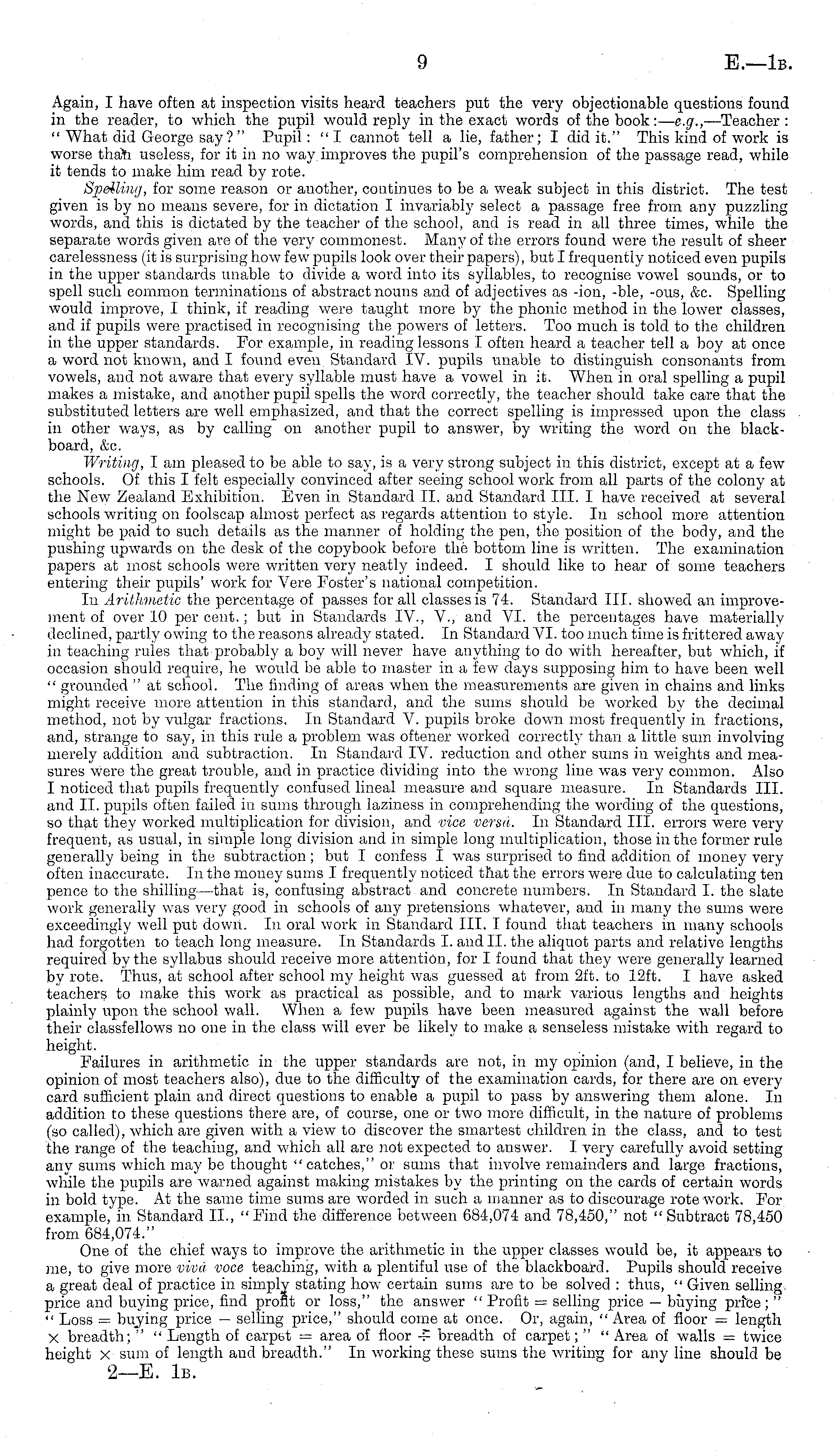 Again, I have often at inspection visits heard teachers put the very objectionable questions found in the reader, to which the pupil would reply in the exact words of the book:— e.g., —Teacher : " What did George say ?" Pupil: "I cannot tell a lie, father; I did it." This kind of work is worse tha^ti useless, for it in no way. improves the pupil's comprehension of the passage read, while it tends to make him read by rote. Spelling, for some reason or another, continues to be a weak subject in this district. The test given is by no means severe, for in dictation I invariably select a passage free from any puzzling words, and. this is dictated by the teacher of the school, and is read in all three times, while the separate words given are of the very commonest. Many of the errors found were the result of sheer carelessness (it is surprising how few pupils look over their papers), but I frequently noticed even pupils in the upper standards unable to divide a word into its syllables, to recognise vowel sounds, or to spell such common terminations of abstract nouns and of adjectives as -ion, -ble, -ous, &c. Spelling would improve, I think, if reading were taught more by the phonic method in the lower classes, and if pupils were practised in recognising the powers of letters. Too much is told to the children in the upper standards. For example, in reading lessons I often heard a teacher tell a boy at once a word not known, and I found even Standard IV. pupils unable to distinguish consonants from vowels, and not aware that every syllable must have a vowel in it. When in oral spelling a pupil makes a mistake, and another pupil spells the word correctly, the teacher should take care that the substituted letters are well emphasized, and that the correct spelling is impressed upon the class in other ways, as by calling on another pupil to answer, by writing the word on the blackboard, &c. Writing, I am pleased to be able to say, is a very strong subject in this district, except at a few schools. Of this I felt especially convinced after seeing school work from all parts of the colony at the New Zealand Exhibition. Even in Standard 11. and Standard 111. I have received at several schools writing on foolscap almost perfect as regards attention to style. In school more attention might be paid to such details as the manner of holding the pen, the position of the body, and the pushing upwards on the desk of the copybook before the bottom line is written. The examination papers at most schools were written very neatly indeed. I should like to hear of some teachers entering their pupils' work for Vere Foster's national competition. In Arithmetic the percentage of passes for all classes is 74. Standard 111. showed an improvement of over 10 per cent.; but in Standards IV., V., and VI. the percentages have materially declined, partly owing to the reasons already stated. In Standard VI. too much time is frittered away in teaching rules that probably a boy will never have anything to do with hereafter, but which, if occasion should require, he would be able to master in a few days supposing him to have been well " grounded "at school. The finding of areas when the measurements are given in chains and links might receive more attention in this standard, and the sums should be worked by the decimal method, not by vulgar fractions. In Standard V. pupils broke down most frequently in fractions, and, strange to say, in this rule a problem was oftener worked correctly than a little sum involving merely addition and subtraction. In Standard IV. reduction and other sums in weights and measures were the great trouble, and in practice dividing into the wrong line was very common. Also I noticed that pupils frequently confused lineal measure and square measure. In Standards 111. and 11. pupils often failed in sums through laziness in comprehending the wording of the questions, so that they worked multiplication for division, and vice versa. In Standard 111. errors were very frequent, as usual, in simple long division and in simple long multiplication, those in the former rule generally being in the subtraction; but I confess I was surprised to find addition of money very often inaccurate. In the money sums I frequently noticed that the errors were due to calculating ten pence to the shilling—that is, confusing abstract and concrete numbers. In Standard I. the slate work generally was very good in schools of any pretensions whatever, and in many the sums were exceedingly well put down. In oral work in Standard 111. I found that teachers m many schools had forgotten to teach long measure. In Standards I. and 11. the aliquot parts and relative lengths required by the syllabus should receive more attention, for I found that they were generally learned by rote. Thus, at school after school my height was guessed at from 2ft. to 12ft. I have asked teachers to make this work as practical as possible, and to mark various lengths and heights plainly upon the school wall. When a few pupils have been measured against the wall before their classfellows no one in the class will ever be likely to make a senseless mistake with regard to height. Failures in arithmetic in the upper standards are not, in my opinion (and, I believe, in the opinion of most teachers also), due to the difficulty of the examination cards, for there are on every card sufficient plain and direct questions to enable a pupil to pass by answering them alone. In addition to these questions there are, of course, one or two more difficult, in the nature of problems (so called), which are given with a view to discover the smartest children in the class, and to test the range of the teaching, and which all are not expected to answer. I very carefully avoid setting any sums which may be thought " catches," or sums that involve remainders and large fractions, while the pupils are warned against making mistakes by the printing on the cards of certain words in bold ty