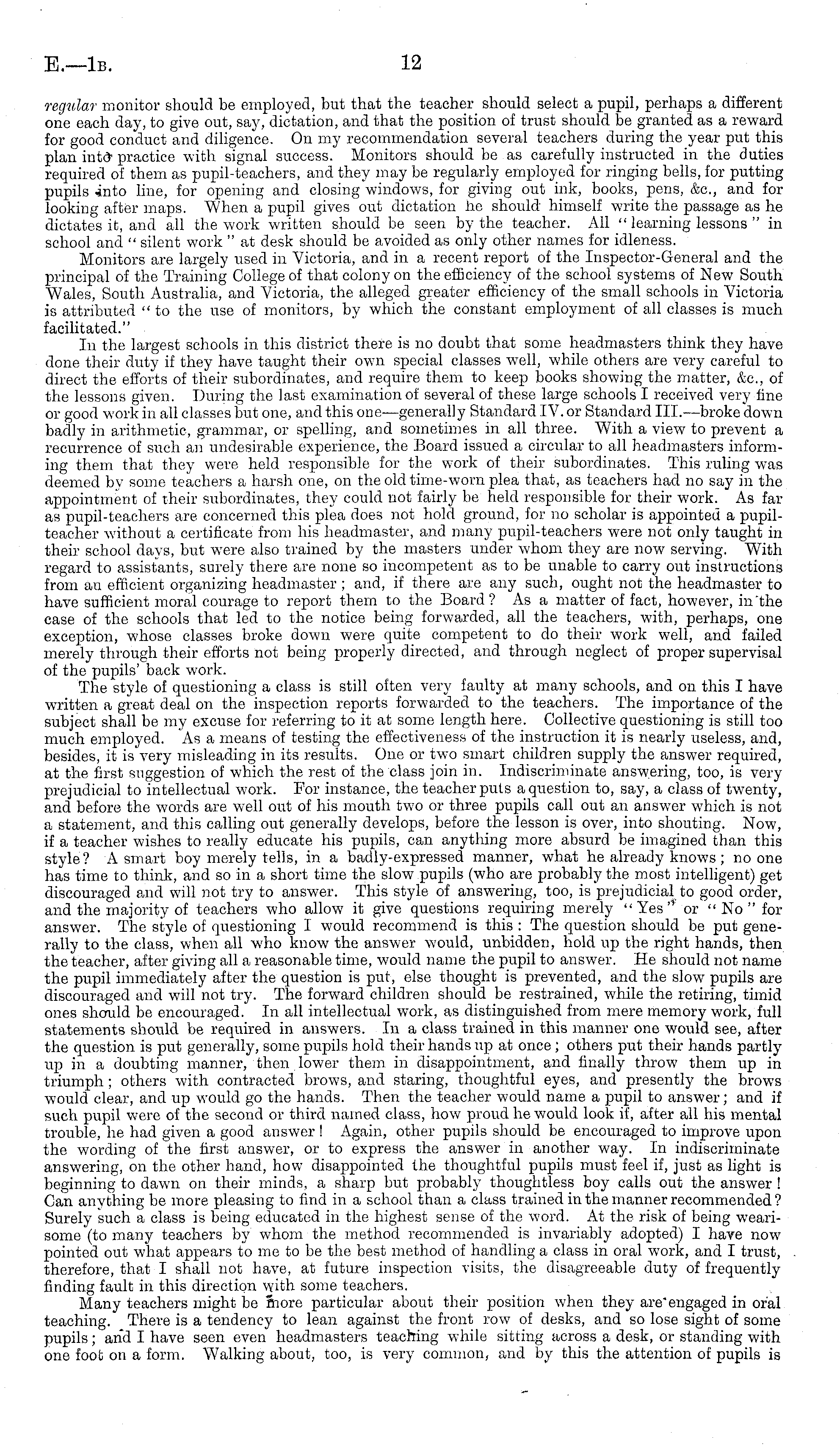 regular monitor should be employed, but that the teacher should select a pupil, perhaps a different one each day, to give out, say, dictation, and that the position of trust should be granted as a reward for good conduct and diligence. On my recommendation several teachers during the year put this plan into- practice with signal success. Monitors should be as carefully instructed in the duties required of them as pupil-teachers, and they may be regularly employed for ringing bells, for putting pupils into line, for opening and closing windows, for giving out ink, books, pens, &c, and for looking after maps. "When a pupil gives out dictation ho should himself write the passage as he dictates it, and all the work written should be seen by the teacher. All " learning lessons "in school and " silent work " at desk should be avoided as only other names for idleness. Monitors are largely used in Victoria, and in a recent report of the Inspector-General and the principal of the Training College of that colony on the efficiency of the school systems of New South "Wales, South Australia, and Victoria, the alleged greater efficiency of the small schools in Victoria is attributed " to the use of monitors, by which the constant employment of all classes is much facilitated." In the largest schools in this district there is no doubt that some headmasters think they have done their duty if they have taught their own special classes well, while others are very careful to direct the efforts of their subordinates, and require them to keep books showing the matter, &c, of the lessons given. During the last examination of several of these large schools I received very fine or good work in all classes but one, and this one—generally Standard IV. or Standard lll.—broke down badly in arithmetic, grammar, or spelling, and sometimes in all three. With a view to prevent a recurrence of such an undesirable experience, the Board issued a circular to all headmasters informing them that they were held responsible for the work of their subordinates. This ruling was deemed by some teachers a harsh one, on the old time-worn plea that, as teachers had no say in the appointment of their subordinates, they could not fairly be held responsible for their work. As far as pupil-teachers are concerned this plea does not hold ground, for no scholar is appointed a pupilteacher without a certificate from his headmaster, and many pupil-teachers were not only taught in their school days, but were also trained by the masters under whom they are now serving. With regard to assistants, surely there are none so incompetent as to be unable to carry out instructions from an efficient organizing headmaster; and, if there are any such, ought not the headmaster to have sufficient moral courage to report them to the Board ? As a matter of fact, however, in the case of the schools that led to the notice being forwarded, all the teachers, with, perhaps, one exception, whose classes broke down were quite competent to do their work well, and failed merely through their efforts not being properly directed, and through neglect of proper supervisal of the pupils' back work. The style of questioning a class is still often very faulty at many schools, and on this I have written a great deal on the inspection reports forwarded to the teachers. The importance of the subject shall be my excuse for referring to it at some length here. Collective questioning is still too much employed. As a means of testing the effectiveness of the instruction it is nearly useless, and, besides, it is very misleading in its results. One or two smart children supply the answer required, at the first suggestion of which the rest of the class join in. Indiscriminate answering, too, is very prejudicial to intellectual work. For instance, the teacher puts a question to, say, a class of twenty, and before the words are well out of his mouth two or three piipils call out an answer which is not a statement, and this calling out generally develops, before the lesson is over, into shouting. Now, if a teacher wishes to really educate his pupils, can anything more absurd be imagined than this style? A smart boy merely tells, in a badly-expressed manner, what he already knows ; no one has time to think, and so in a short time the slow pupils (who are probably the most intelligent) get discouraged and will not try to answer. This style of answering, too, is prejudicial to good order, and the majority of teachers who allow it give questions requiring merely "Yes" or "No " for answer. The style of questioning I would recommend is this : The question should be put generally to the class, when all who know the answer would, unbidden, hold up the right hands, then the teacher, after giving all a reasonable time, would name the pupil to answer. He should not name the pupil immediately after the question is put, else thought is prevented, and the slow pupils are discouraged and will not try. The forward children should be restrained, while the retiring, timid ones should be encouraged. In all intellectual work, as distinguished from mere memory work, full statements should be required in answers. In a class trained in this manner one would see, after the question is put generally, some pupils hold their hands up at once; others put their hands partly up in a doubting manner, then lower them in disappointment, and finally throw them up in triumph ; others with contracted brows, and staring, thoughtful eyes, and presently the brows would clear, and up would go the hands. Then the teacher would name a pupil to answer; and if such pupil were of the second or third named class, how proud he would look if, after all his mental trouble, he had given a good answer ! Again, other pupils should be encouraged to improve upon the wording of the first answer, or to express the answer in another way. In indiscriminate answering, on the other hand, how disappointed the thoughtful pupils must feel if, ju