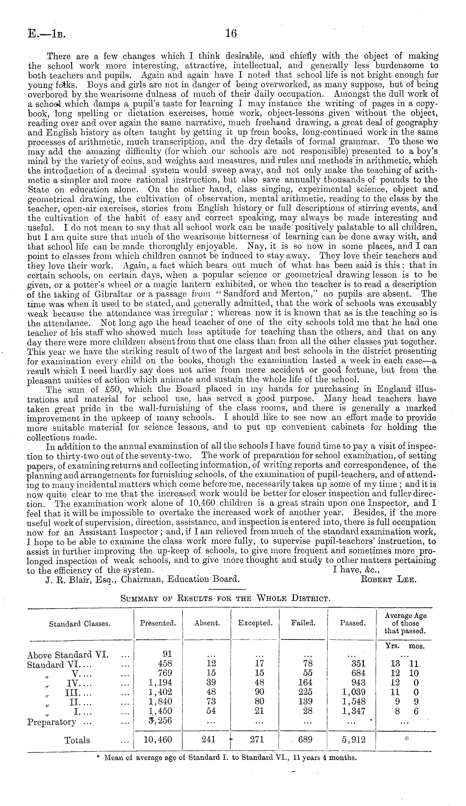 There are a few changes which I think desirable, and chiefly with the object of making the school work more interesting, attractive, intellectual, and generally less burdensome to both teachers and pupils. Again and again have I noted that school life is not bright enough for young folks. Boys and girls are not in danger of being overworked, as many suppose, but of being overbored by the wearisome dulness of much of their daily occupation. Amongst the dull work of a school which damps a pupil's taste for learning I may instance the writing of pages in a copybook, long spelling or dictation exercises, home work, object-lessons given without the object, reading over and over again the same narrative, much freehand drawing, a great deal of geography and English history as often taught by getting it up from books, long-continued work in the same processes of arithmetic, much transcription, and the dry details of formal grammar. To these we may add the amazing difficulty (for which our schools are not responsible) presented to a boy's mind by the variety of coins, and weights and measures, and rules and methods in arithmetic, which the introduction of a decimal system would sweep away, and not only make the teaching of arithmetic a simpler and more rational instruction, but also save annually thousands of pounds to the State on education alone. On the other hand, class singing, experimental science, object and geometrical drawing, the cultivation of observation, mental arithmetic, reading to the class by the teacher, open-air exercises, stories from English history or full descriptions of stirring events, and the cultivation of the habit of easy and correct speaking, may always be made interesting and useful. Ido not mean to say that all school work can be made'positively palatable to all children, but I am quite sure that much of the wearisome bitterness of learning can be done away with, and that school life can be made thoroughly enjoyable. Nay, it is so now in some places, and I can point to classes from which children cannot be induced to stay away. They love their teachers and they love their work. Again, a fact which bears out much of what has been said is this : that in certain schools, on certain days, when a popular science or geometrical drawing lesson is to be given, or a potter's wheel or a magic lantern exhibited, or when the teacher is to read a description of the taking of Gibraltar or a passage from " Sandford and Merton," no pupils are absent. The time was when it used to be stated, and generally admitted, that the work of schools was excusably weak because the attendance was irregular ; whereas now it is known that as is the teaching so is the attendance. Not long ago the head teacher of one of the city schools told me that he had one teacher of his staff who showed much loss aptitude for teaching than the others, and that on any day there were more children absent from that one class than from all the other classes put together. This year we have the striking result of two of the largest and best schools in the district presenting for examination every child on the books, though the examination lasted a week in each case —a result which I need hardly say does not arise from mere accident or good fortune, but from the pleasant unities of action which animate and sustain the whole life of the school. The sum of £50, which the Board placed in my hands for purchasing in England illustrations and material for school use, has served a good purpose. Many head teachers have taken great pride in the wall-furnishing of the class rooms, and there is generally a marked improvement in the upkeep of many schools. I should like to see now an effort made to provide more suitable material for science lessons, and to put up convenient cabinets for holding the collections made. In addition to the annual examination of all the schools I have found time to pay a visit of inspection to thirty-two out of the seventy-two. The work of preparation for school examination, of setting papers, of examining returns and collecting information, of writing reports and correspondence, of the planning and arrangements for furnishing schools, of the examination of pupil-teachers, and of attending to many incidental matters which come before me, necessarily takes up some of my time ; and it is now quite clear to me that the increased work would be better for closer inspection and fuller direction. The examination work alone of 10,460 children is a great strain upon one Inspector, and I feel that it will be impossible to overtake the increased work of another year. Besides, if the more useful work of supervision, direction, assistance, and inspection is entered into, there is full occupation now for an Assistant Inspector ; and, if I am relieved from much of the standard examination work, I hope to be able to examine the class work more fully, to supervise pupil-teachers' instruction, to assist in further improving the up-keep of schools, to give more frequent and sometimes more prolonged inspection of weak schools, and to give more thought and study to other matters pertaining to the efficiency of the system. I have, &c, J. E. Blair, Esq., Chairman, Education Board. Eobeet Lee.