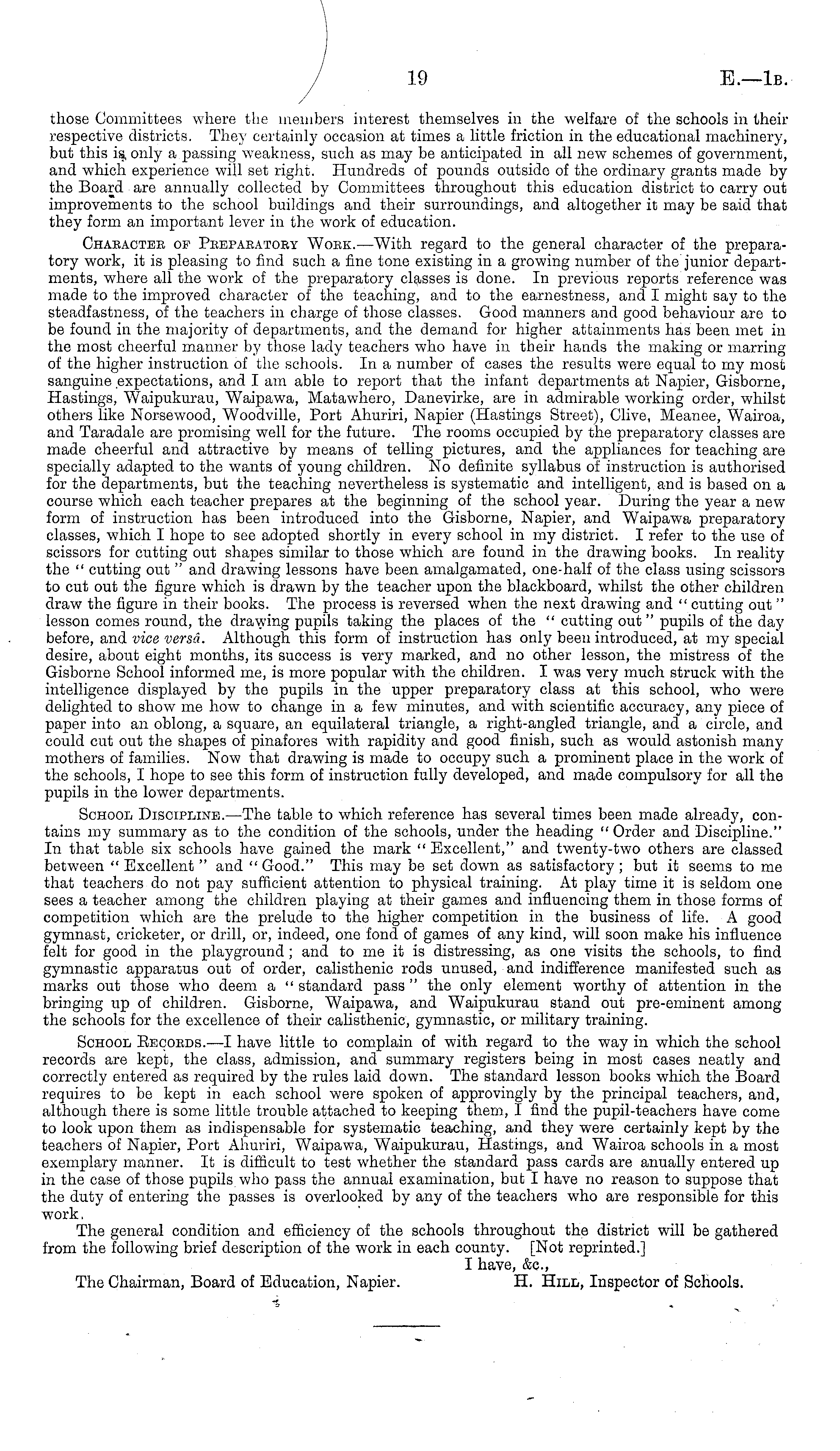 those Committees where the members interest themselves in the welfare of the schools in their respective districts. The)' certainly occasion at times a little friction in the educational machinery, but this is, only a passing weakness, such as may be anticipated in all new schemes of government, and which experience will set right. Hundreds of pounds outside of the ordinary grants made by the Board are annually collected by Committees throughout this education district to carry out improvements to the school buildings and their surroundings, and altogether it may be said that they form an important lever in the work of education. Chaeactee op Pbepabatoey Woek. —With regard to the general character of the preparatory work, it is pleasing to find such a fine tone existing in a growing number of the junior departments, where all the work of the preparatory classes is done. In previous reports reference was made to the improved character of the teaching, and to the earnestness, and I might say to the steadfastness, of the teachers in charge of those classes. Good manners and good behaviour are to be found in the majority of departments, and the demand for higher attainments has been met in the most cheerful manner by those lady teachers who have in their hands the making or marring of the higher instruction of the schools. In a number of cases the results were equal to my most sanguine expectations, and I am able to report that the infant departments at Napier, Gisborne, Hastings, Waipukurau, Waipawa, Matawhero, Danevirke, are in admirable working order, whilst others like Norsewood, Woodville, Port Ahuriri, Napier (Hastings Street), Clive, Meanee, Wairoa, and Taradale are promising well for the future. The rooms occupied by the preparatory classes are made cheerful and attractive by means of telling pictures, and the appliances for teaching are specially adapted to the wants of young children. No definite syllabus of instruction is authorised for the departments, but the teaching nevertheless is systematic and intelligent, and is based on a course which each teacher prepares at the beginning of the school year. During the year a new form of instruction has been introduced into the Gisborne, Napier, and Waipawa preparatory classes, which I hope to see adopted shortly in every school in my district. I refer to the use of scissors for cutting out shapes similar to those which are found in the drawing books. In reality the " cutting out " and drawing lessons have been amalgamated, one-half of the class using scissors to cut out the figure which is drawn by the teacher upon the blackboard, whilst the other children draw the figure in their books. The process is reversed when the next drawing and " cutting out" lesson comes round, the drawing pupils taking the places of the " cutting out " pupils of the day before, and vice versa. Although this form of instruction has only been introduced, at my special desire, about eight months, its success is very marked, and no other lesson, the mistress of the Gisborne School informed me, is more popular with the children. I was very much struck with the intelligence displayed by the pupils in the upper preparatory class at this school, who were delighted to show me how to change in a few minutes, and with scientific accuracy, any piece of paper into an oblong, a square, an equilateral triangle, a right-angled triangle, and a circle, and could cut out the shapes of pinafores with rapidity and good finish, such as would astonish many mothers of families. Now that drawing is made to occupy such a prominent place in the work of the schools, I hope to see this form of instruction fully developed, and made compulsory for all the pupils in the lower departments. School Discipline.—The table to which reference has several times been made already, contains my summary as to the condition of the schools, under the heading " Order and Discipline." In that table six schools have gained the mark " Excellent," and twenty-two others are classed between " Excellent " and " Good." This may be set down as satisfactory; but it seems to me that teachers do not pay sufficient attention to physical training. At play time it is seldom one sees a teacher among the children playing at their games and influencing them in those forms of competition which are the prelude to the higher competition in the business of life. A good gymnast, cricketer, or drill, or, indeed, one fond of games of any kind, will soon make his influence felt for good in the playground; and to me it is distressing, as one visits the schools, to find gymnastic apparatus out of order, calisthenic rods unused, and indifference manifested such as marks out those who deem a "standard pass" the only element worthy of attention in the bringing up of children. Gisborne, Waipawa, and Waipukurau stand out pre-eminent among the schools for the excellence of their calisthenic, gymnastic, or military training. School Eecoeds.—l have little to complain of with regard to the way in which the school records are kept, the class, admission, and summary registers being in most cases neatly and correctly entered as required by the rules laid down. The standard lesson books which the Board requires to be kept in each school were spoken of approvingly by the principal teachers, and, although there is some little trouble attached to keeping them, I find the pupil-teachers have come to look upon them as indispensable for systematic teaching, and they were certainly kept by the teachers of Napier, Port Ahuriri, Waipawa, Waipukurau, Hastings, and Wairoa schools in a most exemplary manner. It is difficult to test whether the standard pass cards are anually entered up in the case of those pupils who pass the annual examination, but I have no reason to suppose that the duty of entering the passes is overlooked by any of the teachers who are responsible for this work, The general condition and efficiency of the schools throughout the d