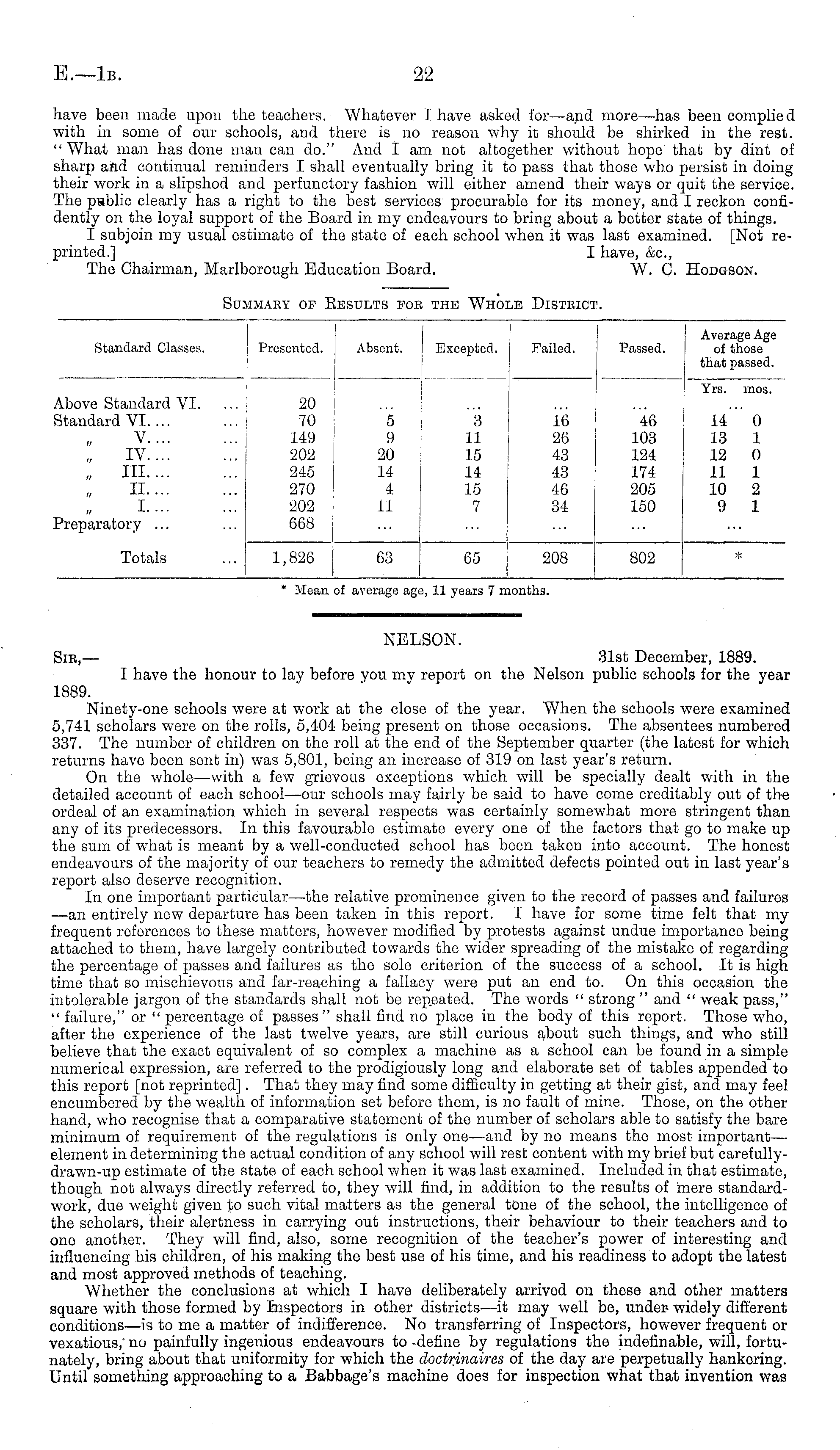NELSON. Sir,— 81st December, 1889. I have the honour to lay before you my report on the Nelson public schools for the year 1889. Ninety-one schools were at work at the close of the year. When the schools were examined 5,741 scholars were on the rolls, 5,404 being present on those occasions. The absentees numbered 337. The number of children on the roll at the end of the September quarter (the latest for which returns have been sent in) was 5,801, being an increase of 319 on last year's return. On the whole—with a few grievous exceptions which will be specially dealt with in the detailed account of each school—our schools may fairly be said to have come creditably out of the ordeal of an examination which in several respects was certainly somewhat more stringent than any of its predecessors. In this favourable estimate every one of the factors that go to make up the sum of what is meant by a well-conducted school has been taken into account. The honest endeavours of the majority of our teachers to remedy the admitted defects pointed out in last year's report also deserve recognition. In one important particular —the relative prominence given to the record of passes and failures —an entirely new departure has been taken in this report. I have for some time felt that my frequent references to these matters, however modified by protests against undue importance being attached to them, have largely contributed towards the wider spreading of the mistake of regarding the percentage of passes and failures as the sole criterion of the success of a school. It is high time that so mischievous and far-reaching a fallacy were put an end to. On this occasion the intolerable jargon of the standards shall not be repeated. The words " strong " and " weak pass," " failure," or " percentage of passes " shall find no place in the body of this report. Those who, after the experience of the last twelve years, are still curious about such things, and who still believe that the exact equivalent of so complex a machine as a school can be found in a simple numerical expression, are referred to the prodigiously long and elaborate set of tables appended to this report [not reprinted]. That they may find some difficulty in getting at their gist, and may feel encumbered by the wealth of information set before them, is no fault of mine. Those, on the other hand, who recognise that a comparative statement of the number of scholars able to satisfy the bare minimum of requirement of the regulations is only one—and by no means the most important— element in determining the actual condition of any school will rest content with my brief but carefully-drawn-up estimate of the state of each school when it was last examined. Included in that estimate, though not always directly referred to, they will find, in addition to the results of mere standardwork, due weight given Jo such vital matters as the general tone of the school, the intelligence of the scholars, their alertness in carrying out instructions, their behaviour to their teachers and to one another. They will find, also, some recognition of the teacher's power of interesting and influencing his children, of his making the best use of his time, and his readiness to adopt the latest and most approved methods of teaching. Whether the conclusions at which I have deliberately arrived on these and other matters square with those formed by Inspectors in other districts—it may well be, under- widely different conditions —is to me a matter of indifference. No transferring of Inspectors, however frequent or vexatious,' no painfully ingenious endeavours to -define by regulations the indefinable, will, fortunately, bring about that uniformity for which the doctrinaires of the day are perpetually hankering. Until something approaching to a Babbage's machine does for inspection what that invention was