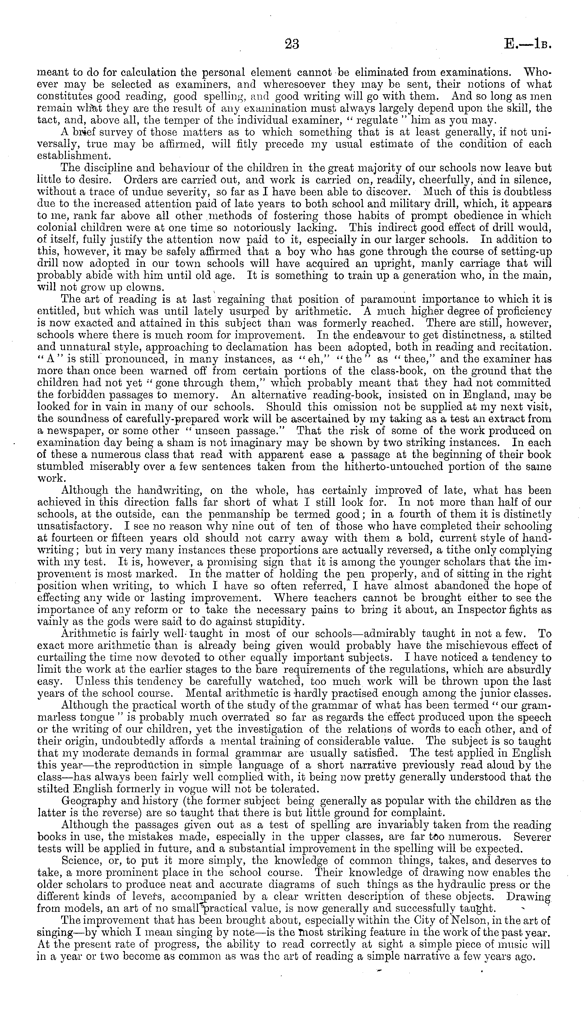 meant to do for calculation the personal element cannot be eliminated from examinations. "Whoever may be selected as examiners, and wheresoever they may be sent, their notions of what constitutes good reading, good spelling, and good writing will go with them. And so long as men remain what they are the result of any examination must always largely depend upon the skill, the tact, and, above all, the temper of the individual examiner, " regulate " him as you may. A brief survey of those matters as to which something that is at least generally, if not universally, true may be affirmed, will fitly precede my usual estimate of the condition of each establishment. The discipline and behaviour of the children in the great majority of our schools now leave but little to desire. Orders are carried out, and work is carried on, readily, cheerfully, and in silence, without a trace of undue severity, so far as I have been able to discover. Much of this is doubtless due to the increased attention paid of late years to both school and military drill, which, it appears to me, rank far above all other methods of fostering those habits of prompt obedience in which colonial children were at one time so notoriously lacking. This indirect good effect of drill would, of itself, fully justify the attention now paid to it, especially in our larger schools. In addition to this, however, it may be safely affirmed that a boy who has gone through the course of setting-up drill now adopted in our town schools will have acquired an upright, manly carriage that will probably abide with him until old age. It is something to train up a generation who, in the main, will not grow up clowns. The art of reading is at last regaining that position of paramount importance to which it is entitled, but which was until lately usurped by arithmetic. A much higher degree of proficiency is now exacted and attained in this subject than was formerly reached. There are still, however, schools where there is much room for improvement. In the endeavour to get distinctness, a stilted and unnatural style, approaching to declamation has been adopted, both in reading and recitation. "A " is still pronounced, in many instances, as "eh," "the" as " thee," and the examiner has more than once been warned off from certain portions of the class-book, on the ground that the children had not yet :< gone through them," which probably meant that they had not committed the forbidden passages to memory. An alternative reading-book, insisted on in England, may be looked for in vain in many of our schools. Should this omission not be supplied at my next visit, the soundness of carefully-prepared work will be ascertained by my taking as a test an extract from a newspaper, or some other " unseen passage." That the risk of some of the work produced on examination day being a sham is not imaginary may be shown by two striking instances. In each of these a numerous class that read with apparent ease a passage at the beginning of their book stumbled miserably over a few sentences taken from the hitherto-untouched portion of the same work. Although the handwriting, on the whole, has certainly improved of late, what has been achieved in this direction falls far short of what I still look for. In not more than half of our schools, at the outside, can the penmanship be termed good; in a fourth of them it is distinctly unsatisfactory. I see no reason why nine out of ten of those who have completed their schooling at fourteen or fifteen years old should not carry away with them a bold, current style of handwriting ; but in very many instances these proportions are actually reversed, a tithe only complying with my test. It is, however, a promising sign that it is among the younger scholars that the improvement is most marked. In the matter of holding the pen properly, and of sitting in the right position when writing, to which I have so often referred, I have almost abandoned the hope of effecting any wide or lasting improvement. Where teachers cannot be brought either to see the importance of any reform or to take the necessary pains to bring it about, an Inspector fights as vainly as the gods were said to do against stupidity. Arithmetic is fairly well- taught in most of our schools—admirably taught in not a few. To exact more arithmetic than is already being given would probably have the mischievous effect of curtailing the time now devoted to other equally important subjects. I have noticed a tendency to limit the work at the earlier stages to the bare requirements of the regulations, which are absurdly easy. Unless this tendency be carefully watched, too much work will be thrown upon the last years of the school course. Mental arithmetic is hardly practised enough among the junior classes. Although the practical worth of the study of the grammar of what has been termed "our grammarless tongue " is probably much overrated so far as regards the effect produced upon the speech or the writing of our children, yet the investigation of the relations of words to each other, and of their origin, undoubtedly affords a mental training of considerable value. The subject is so taught that my moderate demands in formal grammar are usually satisfied. The test applied in English this year —the reproduction in simple language of a short narrative previously read aloud by the class—has always been fairly well complied with, it being now pretty generally understood that the stilted English formerly in vogue will not be tolerated. Geography and history (the former subject being generally as popular with the children as the latter is the reverse) are so taught that there is but little ground for complaint. Although the passages given out as a test of spelling are invariably taken from the reading books in use, the mistakes made, especially in the upper classes, are far too numerous. Severer tests will be applied in future, and a substantial improvement in the spelling will b