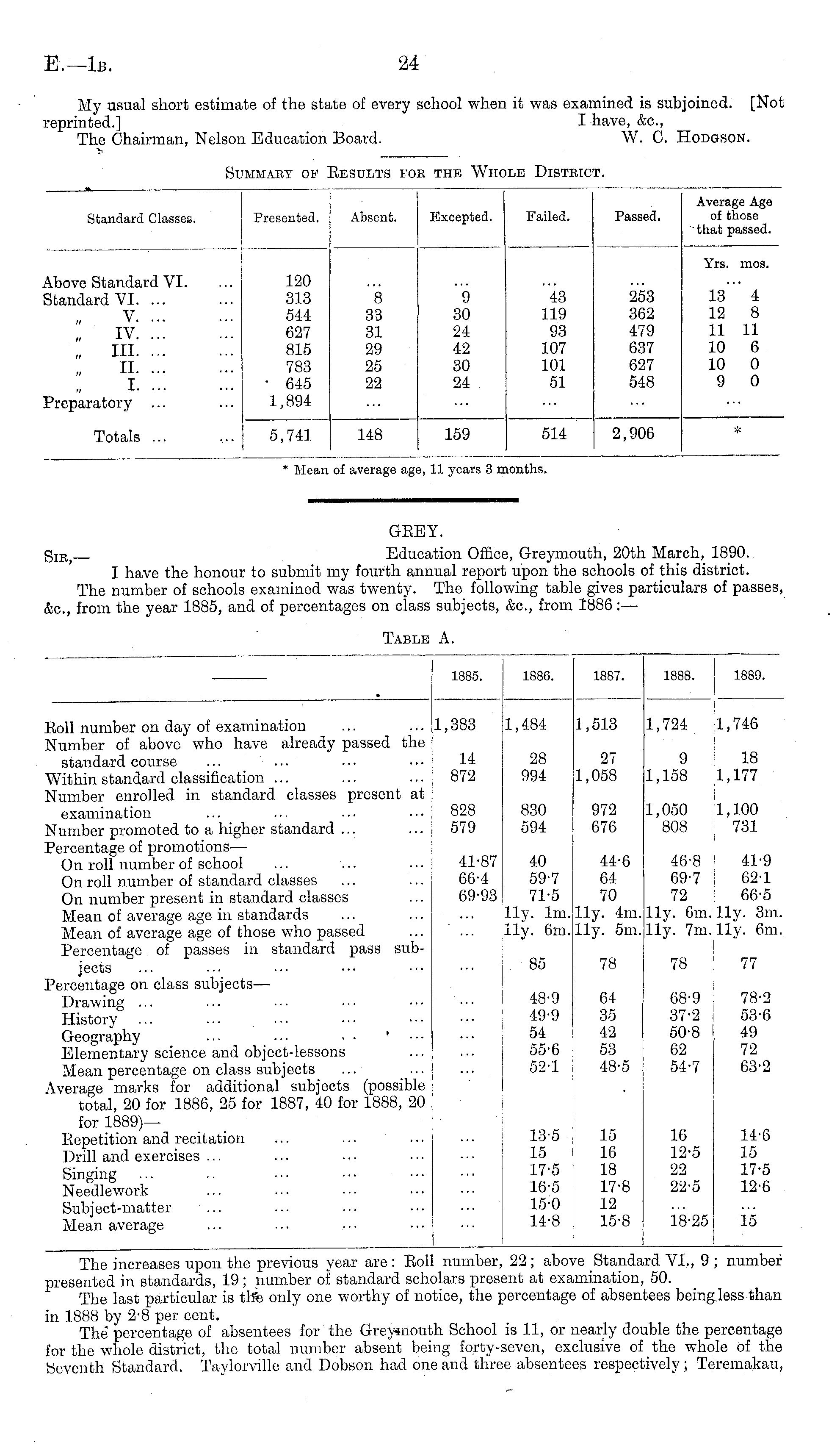 GEEY. g IBj Education Office, Greymouth, 20th March, 1890. I have the honour to submit my fourth annual report upon the schools of this district. The number of schools examined was twenty. The following table gives particulars of passes, &c, from the year 1885, and of percentages on class subjects, &c, from 1886: —
