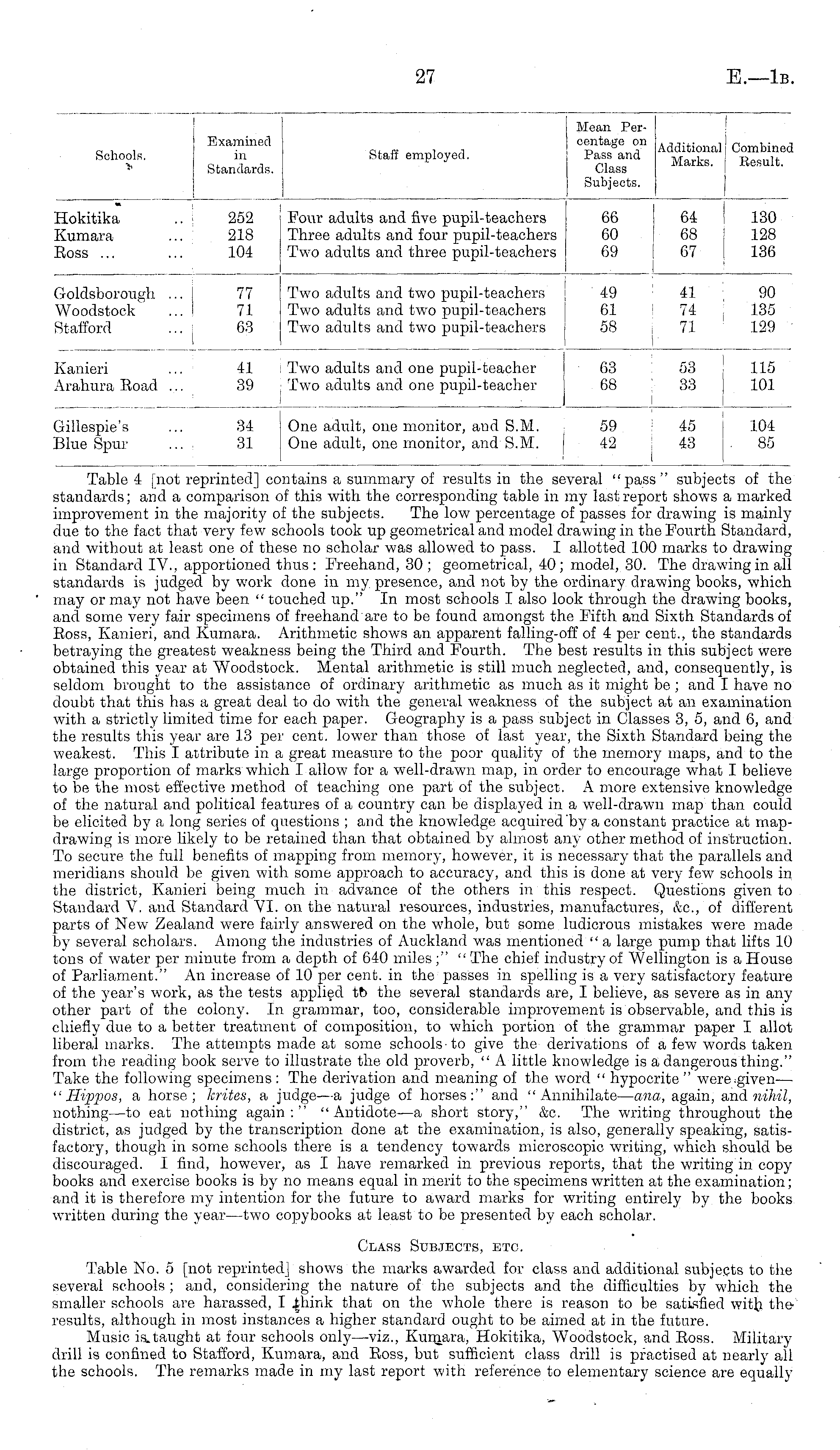 Schools. Examined in Standards. Staff employed. Mean Percentage on Pass and Class Subjects. Additional | Combine* Marks, j Result. « 66 60 69 I I 64 68 67 130 128 136 Hokitika Kumara Eoss ... 252 218 104 Four adults and five pupil-teachers Three adults and four pupil-teachers Two adults and three pupil-teachers Goldsborough ... Woodstock Stafford 77 71 63 Two adults and two pupil-teachers Two adults and two pupil-teachers Two adults and two pupil-teachers Two adults and two pupil-teachers Two adults and two pupil-teachers Two adults and two pupil-teachers i 49 61 58 41 74 71 90 135 129 Kanieri Arahura Road ... 41 39 Two adults and one pupil-teacher Two adults and one pupil-teacher 63 68 I 53 33 I 115 101 Gillespie's Blue Spur ... 34 31 One adult, one monitor, and S.M. One adult, one monitor, and S.M. 59 42 45 43 104 85