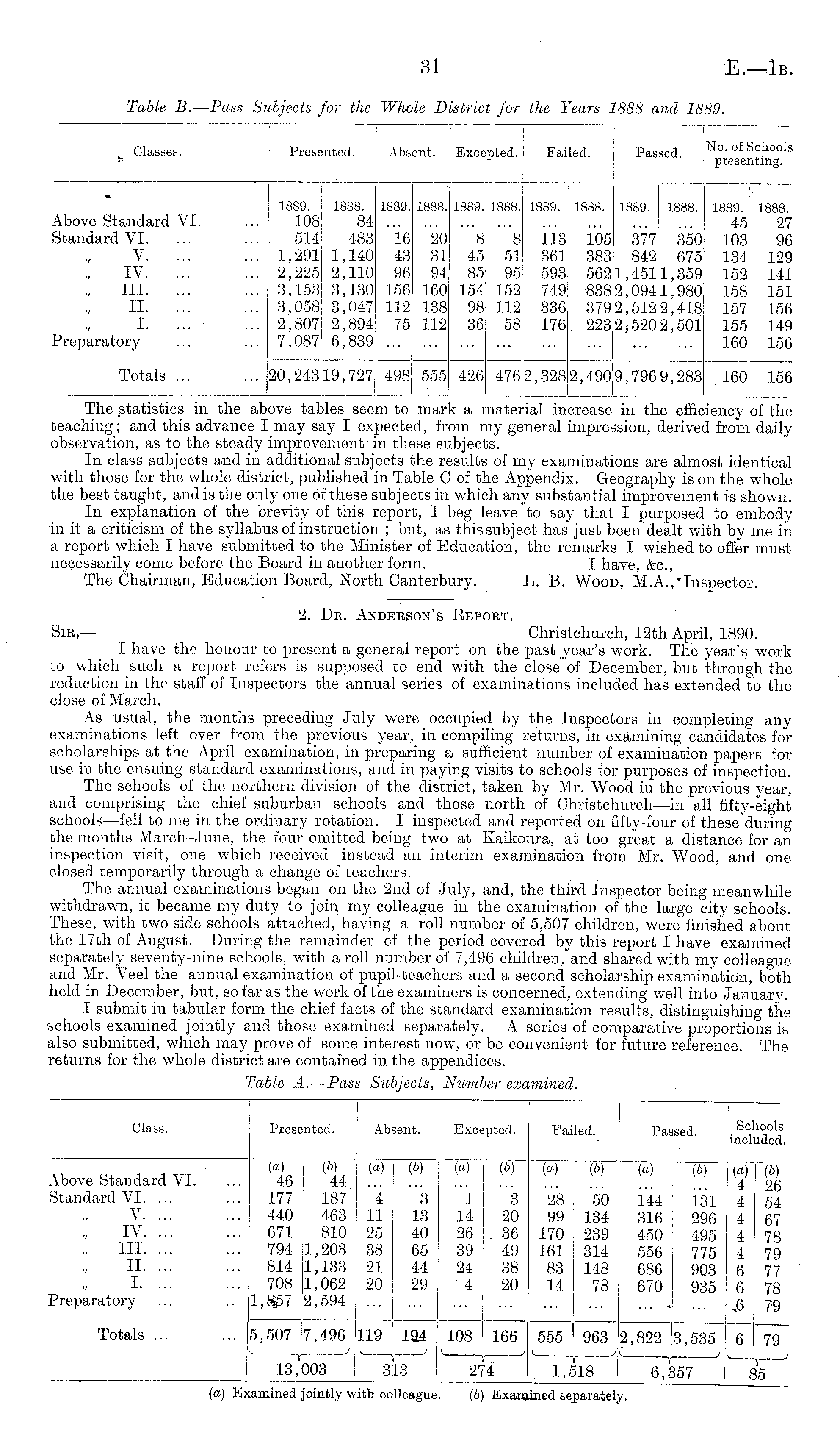 2, De. Andebson's Eepokt. Sic,— Christclmrch, 12th April, 1890. I have the honour to present a general report on the past year's work. The year's work to which such a report refers is supposed to end with the close of December, but through the reduction in the staff of Inspectors the annual series of examinations included has extended to the close of March. As usual, the months preceding July were occupied by the Inspectors in completing any examinations left over from the previous year, in compiling returns, in examining candidates for scholarships at the April examination, in preparing a sufficient number of examination papers for use in the ensuing standard examinations, and in paying visits to schools for purposes of inspection. The schools of the northern division of the district, taken by Mr. Wood in the previous year, and comprising the chief suburban schools and those north of Christchurch— in all fifty-eight schools—fell to me in the ordinary rotation. I inspected and reported on fifty-four of these during the months March-June, the four omitted being two at Kaikoura, at too great a distance for an inspection visit, one which received instead an interim examination from Mr. Wood, and one closed temporarily through a change of teachers. The animal examinations began on the 2nd of July, and, the third Inspector being meanwhile withdrawn, it became my duty to join my colleague in the examination of the large city schools. These, with two side schools attached, having a roll number of 5,507 children, were finished about the 17th of August. During the remainder of the period covered by this report I have examined separately seventy-nine schools, with a roll number of 7,496 children, and shared with my colleague and Mr. Veel the annual examination of pupil-teachers and a second scholarship examination, both held in December, but, so far as the work of the examiners is concerned, extending well into January. I submit in tabular form the chief facts of the standard examination results, distinguishing the schools examined jointly and those examined separately. A series of comparative proportions is also submitted, which may prove of some interest now, or be convenient for future reference. The returns for the whole district are contained in the appendices.
