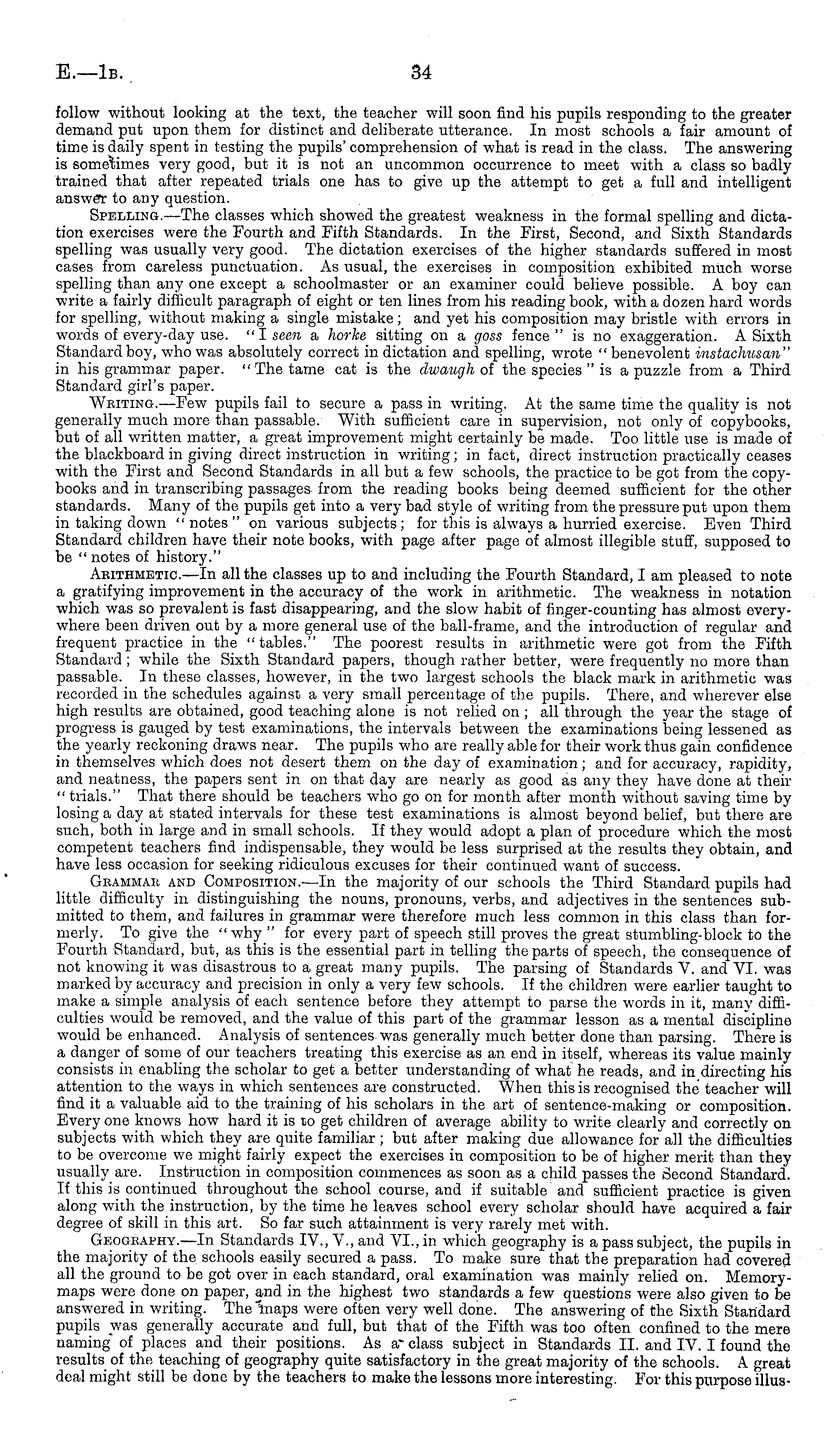 follow without looking at the text, the teacher will soon find his pupils responding to the greater demand put upon them for distinct and deliberate utterance. In most schools a fair amount of time is daily spent in testing the pupils' comprehension of what is read in the class. The answering is sometimes very good, but it is not an uncommon occurrence to meet with a class so badly trained that after repeated trials one has to give up the attempt to get a full and intelligent answer to any question. Spelling.—The classes which showed the greatest weakness in the formal spelling and dictation exercises were the Fourth and Fifth Standards. In the First, Second, and Sixth Standards spelling was usually very good. The dictation exercises of the higher standards suffered in most cases from careless punctuation. As usual, the exercises in composition exhibited much worse spelling than any one except a schoolmaster or an examiner could believe possible. A boy can write a fairly difficult paragraph of eight or ten lines from his reading book, with a dozen hard words for spelling, without making a single mistake; and yet his composition may bristle with errors in words of every-day use. "I seen a horhe sitting on a goss fence" is no exaggeration. A Sixth Standard boy, who was absolutely correct in dictation and spelling, wrote " benevolent instachusan" in his grammar paper. " The tame cat is the dwaugh of the species "is a puzzle from a Third Standard girl's paper. Writing.—Few pupils fail to secure a pass in writing. At the same time the quality is not generally much more than passable. With sufficient care in supervision, not only of copybooks, but of all written matter, a great improvement might certainly be made. Too little use is made of the blackboard in giving direct instruction in writing; in fact, direct instruction practically ceases with the First and Second Standards in all but a few schools, the practice to be got from the copybooks and in transcribing passages from the reading books being deemed sufficient for the other standards. Many of the pupils get into a very bad style of writing from the pressure put upon them in taking down "notes" on various subjects; for this is always a hurried exercise. Even Third Standard children have their note books, with page after page of almost illegible stuff, supposed to be "notes of history." Arithmetic.—ln all the classes up to and including the Fourth Standard, I am pleased to note a gratifying improvement in the accuracy of the work in arithmetic. The weakness in notation which was so prevalent is fast disappearing, and the slow habit of finger-counting has almost everywhere been driven out by a more general use of the ball-frame, and the introduction of regular and frequent practice in the "tables." The poorest results in arithmetic were got from the Fifth Standard ; while the Sixth Standard papers, though rather better, were frequently no more than passable. In these classes, however, in the two largest schools the black mark in arithmetic was recorded in the schedules against a very small percentage of the pupils. There, and wherever else high results are obtained, good teaching alone is not relied on ; all through the year the stage of progress is gauged by test examinations, the intervals between the examinations being lessened as the yearly reckoning draws near. The pupils who are really able for their work thus gain confidence in themselves which does not desert them on the day of examination; and for accuracy, rapidity, and neatness, the papers sent in on that day are nearly as good as any they have done at their " trials." That there should be teachers who go on for month after month without saving time by losing a day at stated intervals for these test examinations is almost beyond belief, but there are such, both in large and in small schools. If they would adopt a plan of procedure which the most competent teachers find indispensable, they would be less surprised at the results they obtain, and have less occasion for seeking ridiculous excuses for their continued want of success. Grammar and Composition.—ln the majority of our schools the Third Standard pupils had little difficulty in distinguishing the nouns, pronouns, verbs, and adjectives in the sentences submitted to them, and failures in grammar were therefore much less common in this class than formerly. To give the " why " for every part of speech still proves the great stumbling-block to the Fourth Standard, but, as this is the essential part in telling the parts of speech, the consequence of not knowing it was disastrous to a great many pupils. The parsing of Standards V. and VI. was marked by accuracy and precision in only a very few schools. If the children were earlier taught to make a simple analysis of each sentence before they attempt to parse the words in it, many difficulties would be removed, and the value of this part of the grammar lesson as a mental discipline would be enhanced. Analysis of sentences, was generally much better done than parsing. There is a danger of some of our teachers treating this exercise as an end in itself, whereas its value mainly consists in enabling the scholar to get a better understanding of what he reads, and in directing his attention to the ways in which sentences are constructed. When this is recognised the teacher will find it a valuable aid to the training of his scholars in the art of sentence-making or composition. Every one knows how hard it is to get children of average ability to write clearly and correctly on subjects with which they are quite familiar ; but after making due allowance for all the difficulties to be overcome we might fairly expect the exercises in composition to be of higher merit than they usually are. Instruction in composition commences as soon as a child passes the Second Standard. If this is continued throughout the school course, and if suitable and sufficient practice is given along with t