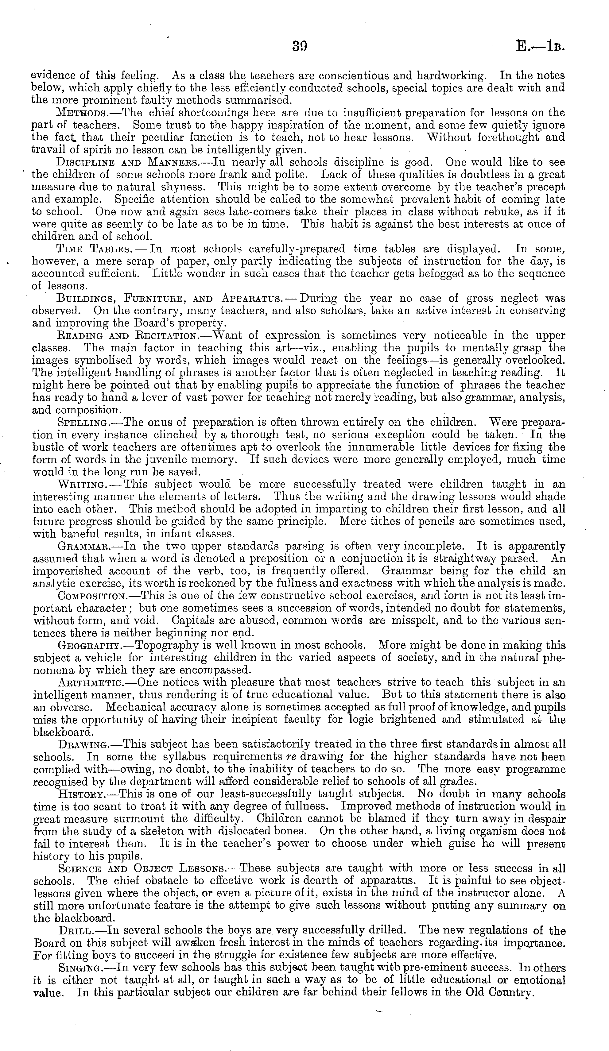 evidence of this feeling. As a class the teachers are conscientious and hardworking. In the notes below, which apply chiefly to the less efficiently conducted schools, special topics are dealt with and the more prominent faulty methods summarised. Methods.—The chief shortcomings here are due to insufficient preparation for lessons on the part of teachers. Some trust to the happy inspiration of the moment, and some few quietly ignore the fact that their peculiar function is to teach, not to hear lessons. Without forethought and travail of spirit no lesson can be intelligently given. Discipline and Mannbes.—ln nearly all schools discipline is good. One would like to see the children of some schools more frank and polite. Lack of these qualities is doubtless in a great measure due to natural shyness. This might be to some extent overcome by the teacher's precept and example. Specific attention should be called to the somewhat prevalent habit of coming late to school. One now and again sees late-comers take their places in class without rebuke, as if it were quite as seemly to be late as to be in time. This habit is against the best interests at once of children and of school. Time Tables. —In most schools carefully-prepared time tables are displayed. In some, however, a mere scrap of paper, only partly indicating the subjects of instruction for the day, is accounted sufficient. Little wonder in such cases that the teacher gets befogged as to the sequence of lessons. Buildings, Fubnitube, and Apeabatus.— During the year no case of gross neglect was observed. On the contrary, many teachers, and also scholars, take an active interest in conserving and improving the Board's property. Reading and Recitation. —Want of expression is sometimes very noticeable in the upper classes. The main factor in teaching this art—viz., enabling the pupils to mentally grasp the images symbolised by words, which images would react on the feelings—is generally overlooked. The intelligent handling of phrases is another factor that is often neglected in teaching reading. It might here be pointed out that by enabling pupils to appreciate the function of phrases the teacher has ready to hand a lever of vast power for teaching not merely reading, but also grammar, analysis, and composition. Spelling.—The onus of preparation is often thrown entirely on the children. W Tere preparation in every instance clinched by a thorough test, no serious exception could be taken. In the bustle of work teachers are oftentimes apt to overlook the innumerable little devices for fixing the form of words in the juvenile memory. If such devices were more generally employed, much time would in the long run be saved. Whiting. — This subject would be more successfully treated were children taught in an interesting manner the elements of letters. Thus the writing and the drawing lessons would shade into each other. This method should be adopted in imparting to children their first lesson, and all future progress should be guided by the same principle. Mere tithes of pencils are sometimes used, with baneful results, in infant classes. Geammae. —In the two upper standards parsing is often very incomplete. It is apparently assumed that when a word is denoted a preposition or a conjunction it is straightway parsed. An impoverished account of the verb, too, is frequently offered. Grammar being for the child an analytic exercise, its worth is reckoned by the fullness and exactness with which the analysis is made. Composition.—This is one of the few constructive school exercises, and form is not its least important character ; but one sometimes sees a succession of words, intended no doubt for statements, without form, and void. Capitals are abused, common words are misspelt, and to the various sentences there is neither beginning nor end. Geogeapht.—Topography is well known in most schools. More might be done in making this subject a vehicle for interesting children in the varied aspects of society, and in the natural phenomena by which they are encompassed. Aeithmetic. —One notices with pleasure that most teachers strive to teach this subject in an intelligent manner, thus rendering it of true educational value. But to this statement there is also an obverse. Mechanical accuracy alone is sometimes-accepted as full proof of knowledge, and pupils miss the opportunity of having their incipient faculty for logic brightened and stimulated at the blackboard. Deawing.-—This subject has been satisfactorily treated in the three first standards in almost all schools. In some the syllabus requirements re drawing for the higher standards have not been complied with—owing, no doubt, to the inability of teachers to do so. The more easy programme recognised by the department will afford considerable relief to schools of all grades. Histoky.—This is one of our least-successfully taught subjects. No doubt in many schools time is too scant to treat it with any degree of fullness. Improved methods of instruction would in great measure surmount the difficulty. Children cannot be blamed if they turn away in despair from the study of a skeleton with dislocated bones. On the other hand, a living organism does not fail to interest them; It is in the teacher's power to choose under which guise he will present history to his pupils. Science and Object Lessons. —These subjects are taught with more or less success in all schools. The chief obstacle to effective work is dearth of apparatus. It is painful to see objectlessons given where the object, or even a picture of it, exists in the mind of the instructor alone. A still more unfortunate feature is the attempt to give such lessons without putting any summary on the blackboard. Deill. —In several schools the boys are very successfully drilled. The new regulations of the Board on this subject will awaken fresh interest in the minds of teachers regarding-its importance. For fitting boys to 