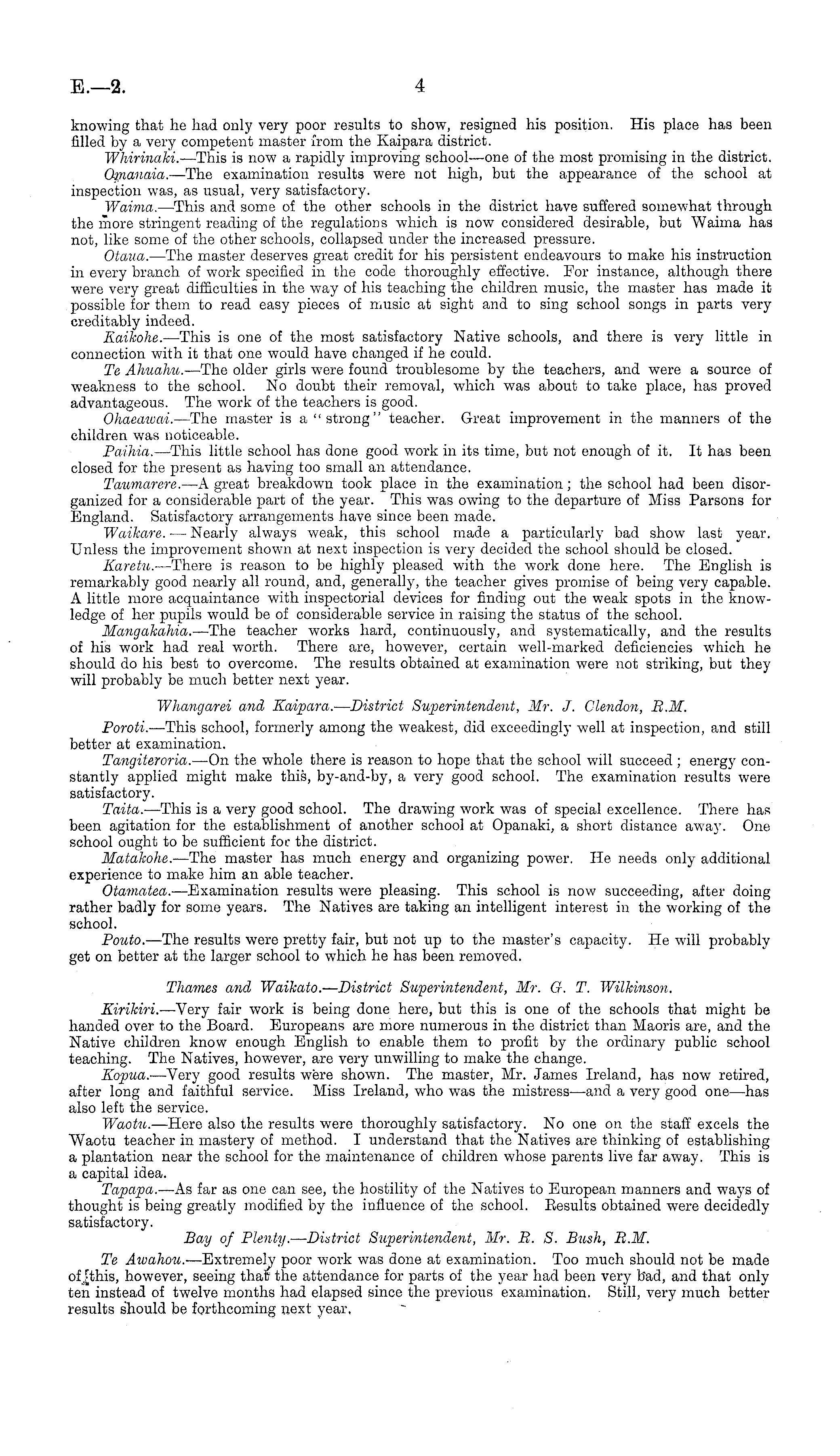 knowing that he had only very poor results to show, resigned his position. His place has been filled by a very competent master from the Kaipara district. Whirinaki. —This is now a rapidly improving school—one of the most promising in the district. Opianaia. —The examination results were not high, but the appearance of the school at inspection was, as usual, very satisfactory. Waima. —This and some of the other schools in the district have suffered somewhat through the more stringent reading of the regulations which is now considered desirable, but Waima has not, like some of the other schools, collapsed under the increased pressure. Otaua. —The master deserves great credit for his persistent endeavours to make his instruction in every branch of work specified in the code thoroughly effective. For instance, although there were very great difficulties in the way of his teaching the children music, the master has made it possible for them to read easy pieces of music at sight and to sing school songs in parts very creditably indeed. Kaikohe. —This is one of the most satisfactory Native schools, and there is very little in connection with it that one would have changed if he could. Te Ahuahu. —The older girls were found troublesome by the teachers, and were a source of weakness to the school. No doubt their removal, which was about to take place, has proved advantageous. The work of the teachers is good. Ohaeaivai. —The master is a "strong" teacher. Great improvement in the manners of the children was noticeable. Paihia. —This little school has done good work in its time, but not enough of it. It has been closed for the present as having too small an attendance. Taumarere. —A great breakdown took place in the examination; the school had been disorganized for a considerable part of the year. This was owing to the departure of Miss Parsons for England. Satisfactory arrangements have since been made. Waikare. — Nearly always weak, this school made a particularly bad show last year. Unless the improvement shown at next inspection is very decided the school should be closed. Karetu. —There is reason to be highly pleased with the work done here. The English is remarkably good nearly all round, and, generally, the teacher gives promise of being very capable. A little more acquaintance with inspectorial devices for finding out the weak spots in the knowledge of her pupils would be of considerable service in raising the status of the school. Mangakahia. —The teacher works hard, continuously, and systematically, and the results of his work had real worth. There are, however, certain well-marked deficiencies which he should do his best to overcome. The results obtained at examination were not striking, but they will probably be much better next year. Whangarei and Kaipara. — District Superintendent, Mr. J. Clendon, B.M. Poroti.- —This school, formerly among the weakest, did exceedingly well at inspection, and still better at examination. Tangiteroria. —On the whole there is reason to hope that the school will succeed ; energy constantly applied might make this, by-and-by, a very good school. The examination results were satisfactory. Taita.- —This is a very good school. The drawing work was of special excellence. There has been agitation for the establishment of another school at Opanaki, a short distance away. One school ought to be sufficient foe the district. Matakohe. —The master has much energy and organizing power. He needs only additional experience to make him an able teacher. Otamatea. —Examination results were pleasing. This school is now succeeding, after doing rather badly for some years. The Natives are taking an intelligent interest in the working of the school. Pouto. —The results were pretty fair, but not up to the master's capacity. He will probably get on better at the larger school to which he has been removed. Thames and Waikato. — District Superintendent, Mr. G. T. Wilkinson. Kirikiri. —Very fair work is being done here, but this is one of the schools that might be handed over to the Board. Europeans are more numerous in the district than Maoris are, and the Native children know enough English to enable them to profit by the ordinary public school teaching. The Natives, however, are very unwilling to make the change. Eopua. —Very good results were shown. The master, Mr. James Ireland, has now retired, after long and faithful service. Miss Ireland, who was the mistress—and a very good one—has also left the service. Waotu. —Here also the results were thoroughly satisfactory. No one on the staff excels the Waotu teacher in mastery of method. I understand that the Natives are thinking of establishing a plantation near the school for the maintenance of children whose parents live far away. This is a capital idea. Tapapa. —As far as one can see, the hostility of the Natives to European manners and ways of thought is being greatly modified by the influence of the school. Results obtained were decidedly satisfactory. Bay of Plenty. — District Superintendent, Mr. B. S. Bush, B.M. Te Awahou.- —Extremely poor work was done at examination. Too much should not be made of^this, however, seeing that the attendance for parts of the year had been very bad, and that only ten instead of twelve months had elapsed since the previous examination. Still, very much better results should be forthcoming next year.