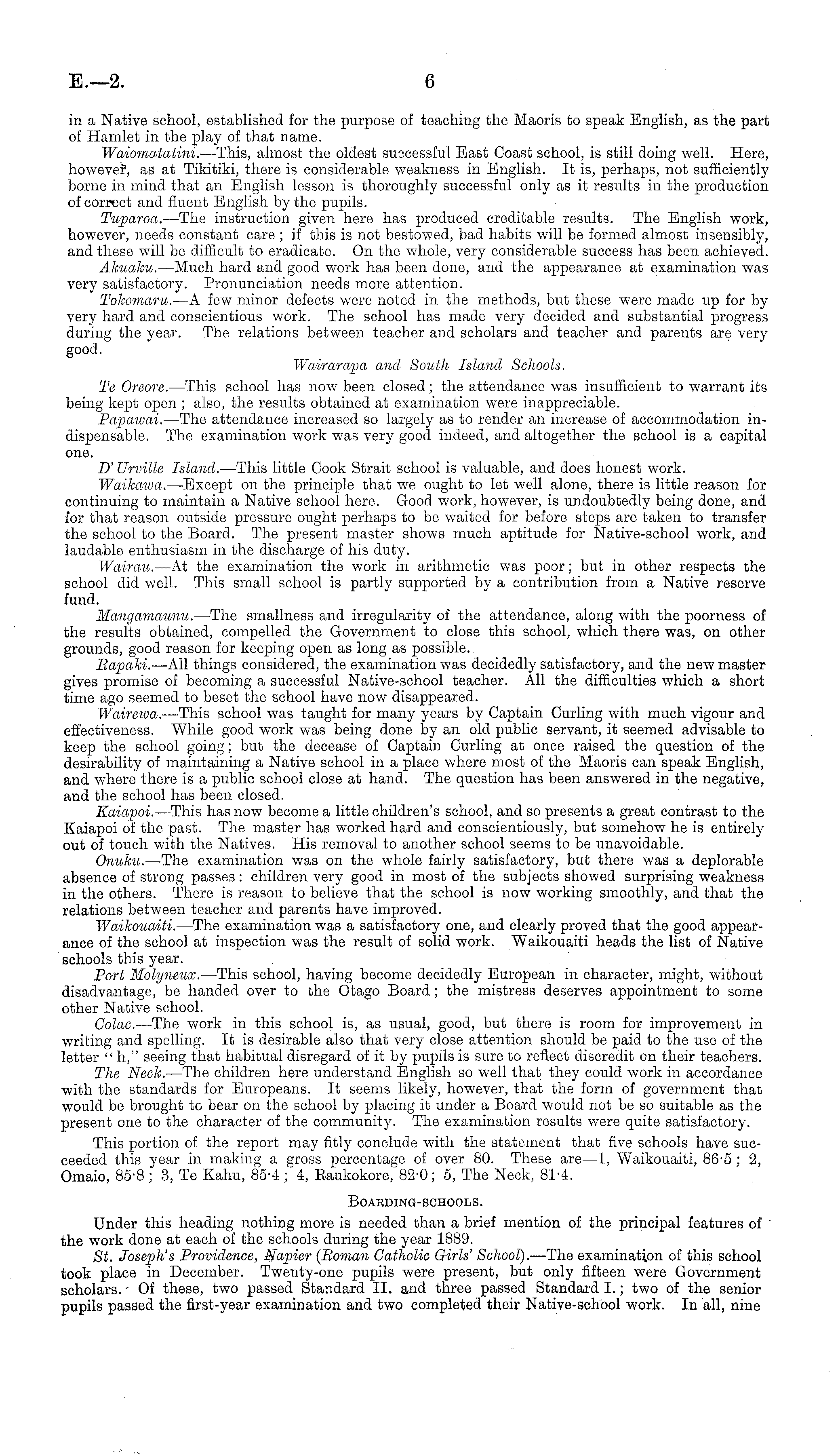 in a Native school, established for the purpose of teaching the Maoris to speak English, as the part of Hamlet in the play of that name. Waiomatatini. —This, almost the oldest successful East Coast school, is still doing well. Here, however1, as at Tikitiki, there is considerable weakness in English. It is, perhaps, not sufficiently borne in mind that an English lesson is thoroughly successful only as it results in the production of correct and fluent English by the pupils. Tuparoa. —The instruction given here has produced creditable results. The English work, however, needs constant care ; if this is not bestowed, bad habits will be formed almost insensibly, and these will be difficult to eradicate. On the whole, very considerable success has been achieved. Akuaku. —Much hard and good work has been done, and the appearance at examination was very satisfactory. Pronunciation needs more attention. Tokomaru. —A few minor defects were noted in the methods, but these were made up for by very hard and conscientious work. The school has made very decided and substantial progress during the year. The relations between teacher and scholars and teacher and parents are very good. Wairarapa and South Island Schools. Te Oreore. —This school has now been closed; the attendance was insufficient to warrant its being kept open ; also, the results obtained at examination were inappreciable. Papawai. —The attendance increased so largely as to render an increase of accommodation indispensable. The examination work was very good indeed, and altogether the school is a capital one. D' Urville Island. —This little Cook Strait school is valuable, and does honest work. Waikawa. —Except on the principle that we ought to let well alone, there is little reason for continuing to maintain a Native school here. Good work, however, is undoubtedly being done, and for that reason outside pressure ought perhaps to be waited for before steps are taken to transfer the school to the Board. The present master shows much aptitude for Native-school work, and laudable enthusiasm in the discharge of his duty. Wairau. —At the examination the work in arithmetic was poor; but in other respects the school did well. This small school is partly supported by a contribution from a Native reserve fund. Mangamaumt. —The smallness and irregularity of the attendance, along with the poorness of the results obtained, compelled the Government to close this school, which there was, on other grounds, good reason for keeping open as long as possible. Bapa.i. —All things considered, the examination was decidedly satisfactory, and the new master gives promise of becoming a successful Native-school teacher. All the difficulties which a short time ago seemed to beset the school have now disappeared. Wairewa. —This school was taught for many years by Captain Curling with much vigour and effectiveness. While good work was being done by an old public servant, it seemed advisable to keep the school going; but the decease of Captain Curling at once raised the question of the desirability of maintaining a Native school in a place where most of the Maoris can speak English, and where there is a public school close at hand. The question has been answered in the negative, and the school has been closed. Kaiapoi. —This has now become a little children's school, and so presents a great contrast to the Kaiapoi of the past. The master has worked hard and conscientiously, but somehow he is entirely out of touch with the Natives. His removal to another school seems to be unavoidable. Onuku. —The examination was on the whole fairly satisfactory, but there was a deplorable absence of strong passes : children very good in most of the subjects showed surprising weakness in the others. There is reason to believe that the school is now working smoothly, and that the relations between teacher and parents have improved. Waikouaiti. —The examination was a satisfactory one, and clearly proved that the good appearance of the school at inspection was the result of solid work. Waikouaiti heads the list of Native schools this year. Port Molyneux. —This school, having become decidedly European in character, might, without disadvantage, be handed over to the Otago Board; the mistress deserves appointment to some other Native school. Colac. —The work in this school is, as usual, good, but there is room for improvement in writing and spelling. It is desirable also that very close attention should be paid to the use of the letter " h," seeing that habitual disregard of it by pupils is sure to reflect discredit on their teachers. The Neck. —The children here understand English so well that they could work in accordance with the standards for Europeans. It seems likely, however, that the form of government that would be brought to bear on the school by placing it under a Board would not be so suitable as the present one to the character of the community. The examination results were quite satisfactory. This portion of the report may fitly conclude with the statement that five schools have succeeded this year in making a gross percentage of over 80. These are—l, Waikouaiti, 86-5 ; 2, Omaio, 85-8 ; 3, Te Kahu, 85-4 ; 4, Raukokore, 82-0; 5, The Neck, 81-4. Boaeding-schools. Under this heading nothing more is needed than a brief mention of the principal features of the work done at each of the schools during the year 1889. St. Joseph's Providence, Napier (Boman Catholic Girls' School). —The examination of this school took place in December. Twenty-one pupils were present, but only fifteen were Government scholars. Of these, two passed Standard 11. and three passed Standard I.; two of the senior pupils passed the first-year examination and two completed their Native-school work. In all, nine