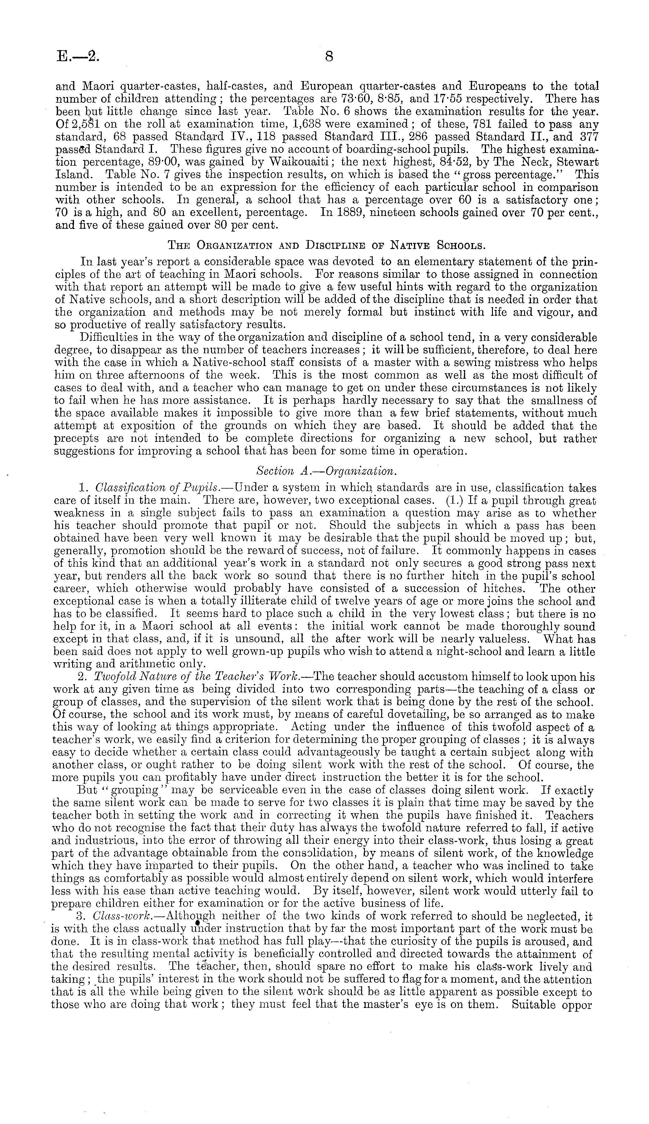 and Maori quarter-castes, half-castes, and European quarter-castes and Europeans to the total number of children attending ; the percentages are 73'60, 8-85, and 17'55 respectively. There has been but little change since last year. Table No. 6 shows the examination results for the year. Of 2,5§1 on the roll at examination time, 1,638 were examined; of these, 781 failed to pass any standard, 68 passed Standard IV., 118 passed Standard 111., 286 passed Standard 11., and 377 passed Standard I. These figures give no account of boarding-school pupils. The highest examination percentage, 89-00, was gained by Waikouaiti; the next highest, 84-52, by The Neck, Stewart Island. Table No. 7 gives the inspection results, on which is based the "gross percentage." This number is intended to be an expression for the efficiency of each particular school in comparison with other schools. In general, a school that has a percentage over 60 is a satisfactory one; 70 is a high, and 80 an excellent, percentage. In 1889, nineteen schools gained over 70 per cent., and five of these gained over 80 per cent. The Oeganization and Discipline of Native Schools. In last year's report a considerable space was devoted to an elementary statement of the principles of the art of teaching in Maori schools. For reasons similar to those assigned in connection with that report an attempt will be made to give a few useful hints with regard to the organization of Native schools, and a short description will be added of the discipline that is needed in order that the organization and methods may be not merely formal but instinct with life and vigour, and so productive of really satisfactory results. Difficulties in the way of the organization and discipline of a school tend, in a very considerable degree, to disappear as the number of teachers increases ; it will be sufficient, therefore, to deal here with the case in which a Native-school staff consists of a master with a sewing mistress who helps him on three afternoons of the week. This is the most common as well as the most difficult of cases to deal with, and a teacher who can manage to get on under these circumstances is not likely to fail when he has more assistance. It is perhaps hardly necessary to say that the smallness of the space available makes it impossible to give more than a few brief statements, without much attempt at exposition of the grounds on which they are based. It should be added that the precepts are not intended to be complete directions for organizing a new school, but rather suggestions for improving a school that has been for some time in operation. Section A. — Organization. 1. Classification of Pupils. —Under a system in which standards are in use, classification takes care of itself in the main. There are, however, two exceptional cases. (1.) If a pupil through great weakness in a single subject fails to pass an examination a question may arise as to whether his teacher should promote that pupil or not. Should the subjects in which a pass has been obtained have been very well known it may be desirable that the pupil should be moved up ; but, generally, promotion should be the reward of success, not of failure. It commonly happens in cases of this kind that an additional year's work in a standard not only secures a good strong pass next year, but renders all the back work so sound that there is no further hitch in the pupil's school career, which otherwise would probably have consisted of a succession of hitches. The other exceptional case is when a totally illiterate child of twelve years of age or more joins the school and has to be classified. It seems hard to place such a child in the very lowest class ; but there is no help for it, in a Maori school at all events: the initial work cannot be made thoroughly sound except in that class, and, if it is unsound, all the after work will be nearly valueless. What has been said does not apply to well grown-up pupils who wish to attend a night-school and learn a little writing and arithmetic only. 2. Twofold Nature of the Teacher's Work. —The teacher should accustom himself to look upon his work at any given time as being divided into two corresponding parts—the teaching of a class or group of classes, and the supervision of the silent work that is being done by the rest of the school. Of course, the school and its work must, by means of careful dovetailing, be so arranged as to make this way of looking at things appropriate. Acting under the influence of this twofold aspect of a teacher's work, we easily find a criterion for determining the proper grouping of classes ; it is always easy to decide whether a certain class could advantageously be taught a certain subject along with another class, or ought rather to be doing silent work with the rest of the school. Of course, the more pupils you can profitably have under direct instruction the better it is for the school. But "grouping" may be serviceable even in the case of classes doing silent work. If exactly the same silent work can be made to serve for two classes it is plain that time may be saved by the teacher both in setting the work and in correcting it when the pupils have finished it. Teachers who do not recognise the fact that their duty has always the twofold nature referred to fall, if active and industrious, into the error of throwing all their energy into their class-work, thus losing a great part of the advantage obtainable from the consolidation, by means of silent work, of the knowledge which they have imparted to their pupils. On the other hand, a teacher who was inclined to take things as comfortably as possible would almost entirely depend on silent work, which would interfere less with his ease than active teaching would. By itself, however, silent work would utterly fail to prepare children either for examination or for the active business of life. 3. Class-ivork. —Although neither of the two kinds of work referred to s