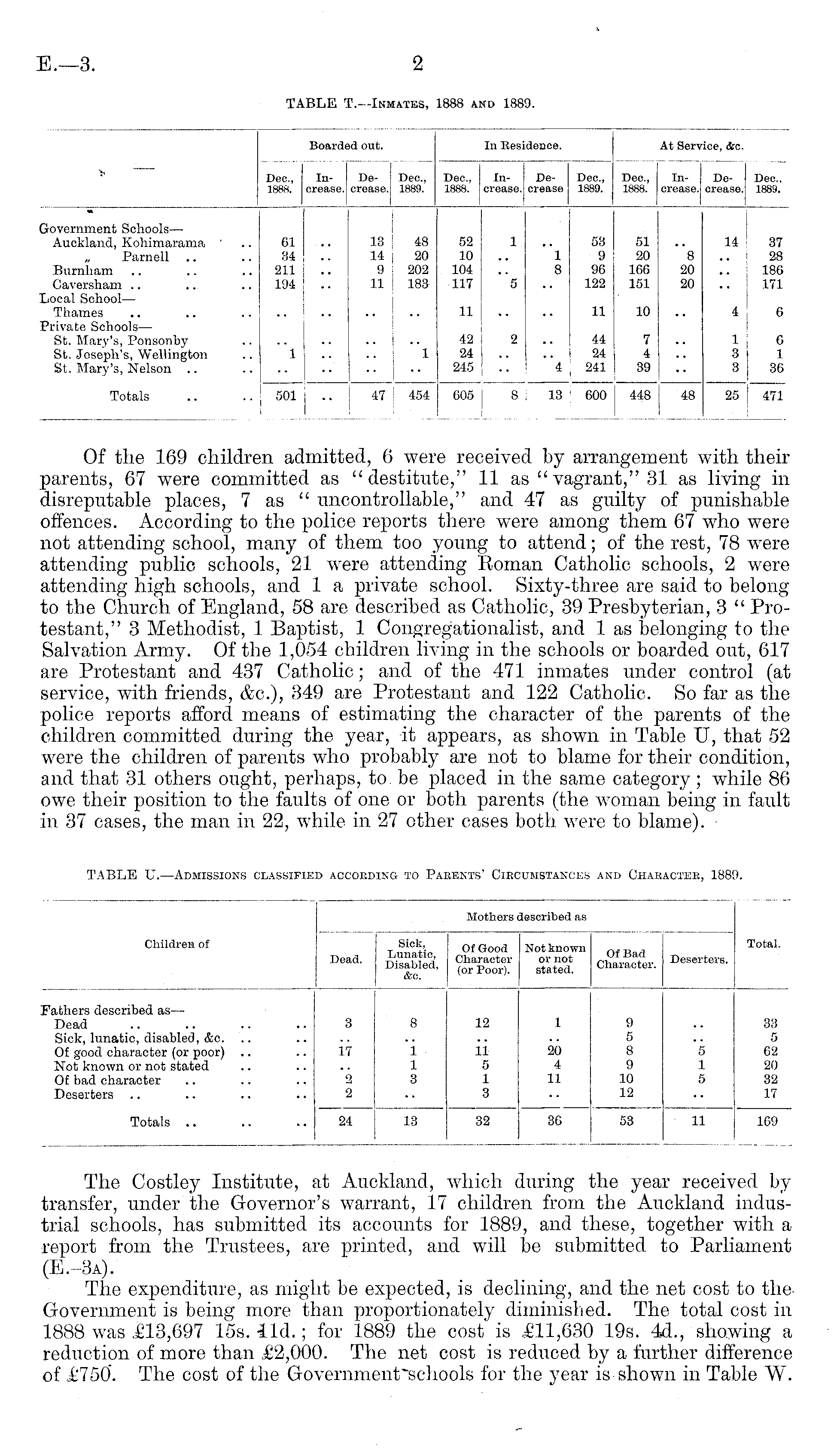 The Costley Institute, at Auckland, which during the year received by transfer, under the Governor's warrant, 17 children from the Auckland industrial schools, has submitted its accounts for 1889, and these, together with a report from the Trustees, are printed, and will be submitted to Parliament (E.-3a). The expenditure, as might be expected, is declining, and the net cost to the Government is being more than proportionately diminished. The total cost in 1888 was £13,697 15s. lid.; for 1889 the cost is ,£11,630 19s. 4d., showing a reduction of more than £2,000. The net cost is reduced by a further difference of £750". The cost of the Government "schools for the year is shown in Table W.
