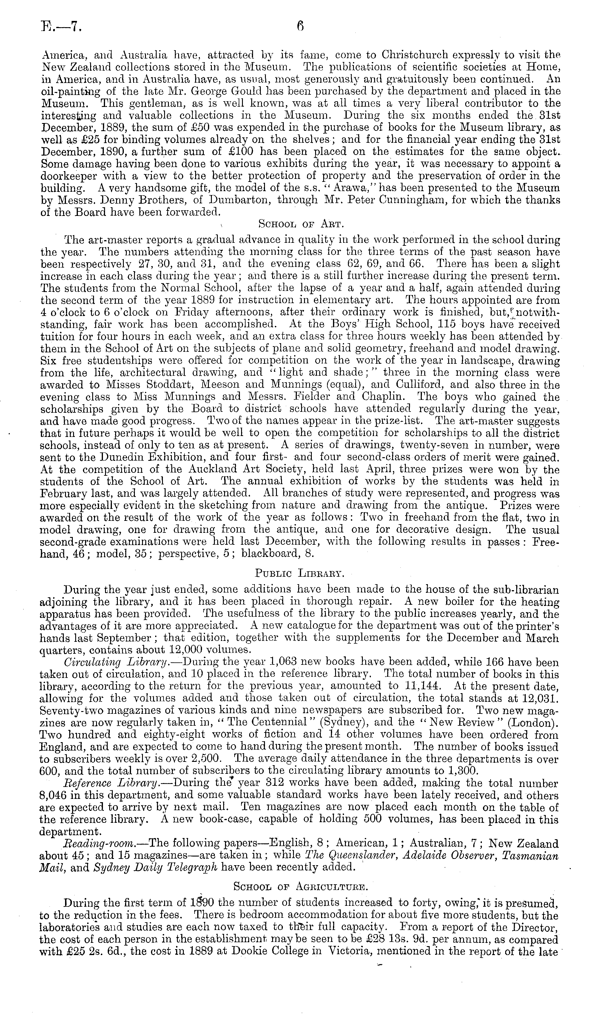 America, and Australia have, attracted by its fame, come to Christchurch expressly to visit the New Zealand collections stored in the Museum. The publications of scientific societies at Home, in America, and in Australia have, as usual, most generously and gratuitously been continued. An oil-painting of the late Mr. George Gould has been purchased by the department and placed in the Museum. This gentleman, as is well known, was at all times a very liberal contributor to the interesting and valuable collections in the Museum. During the six months ended the 31st December, 1889, the sum of £50 was expended in the purchase of books for the Museum library, as well as £25 for binding volumes already on the shelves; and for the financial year ending the 31st December, 1890, a further sum of £100 has been placed on the estimates for the same object. Some damage having been done to various exhibits during the year, it was necessary to appoint a doorkeeper with a view to the better protection of property and the preservation of order in the building. A very handsome gift, the model of the s.s. " Arawa," has been presented to the Museum by Messrs. Denny Brothers, of Dumbarton, through Mr. Peter Cunningham, for which the thanks of the Board have been forwarded. School of Abt. The art-master reports a gradual advance in quality in the work performed in the school during the year. The numbers attending the morning class for the three terms of the past season have been respectively 27, 30, and 31, and the evening class 62, 69, and 66. There has been a slight increase in each class during the year; and there is a still further increase during the present term. The students from the Normal School, after the lapse of a year and a half, again attended during the second term of the year 1889 for instruction in elementary art. The hours appointed are from 4 o'clock to 6 o'clock on Friday afternoons, after their ordinary work is finished, but,I'notwithstanding, fair work has been accomplished. At the Boys' High School, 115 boys have received tuition for four hours in each week, and an extra class for three hours weekly has been attended by them in the School of Art on the subjects of plane and solid geometry, freehand and model drawing. Six free studentships were offered for competition on the work of the year in landscape, drawing from the life, architectural drawing, and "light and shade;" three in the morning class were awarded to Misses Stoddart, Meeson and Munnings (equal), and Culliford, and also three in the evening class to Miss Munnings and Messrs. Fielder and Chaplin. The boys who gained the scholarships given by the Board to district schools have attended regularly during the year, and have made good progress. Two of the names appear in the prize-list. The art-master suggests that in future perhaps it would be well to open the competition for scholarships to all the district schools, instead of only to ten as at present. A series of drawings, twenty-seven in number, were sent to the Dunedin Exhibition, and four first- and four second-class orders of merit were gained. At the competition of the Auckland Art Society, held last April, three prizes were won by the students of the School of Art. The annual exhibition of works by the students was held in February last, and was largely attended. All branches of study were represented, and progress was more especially evident in the sketching from nature and drawing from the antique. Prizes were awarded on the result of the work of the year as follows : Two in freehand from the flat, two in model drawing, one for drawing from the antique, and one for decorative design. The usual second-grade examinations were held last December, with the following results in passes : Freehand, 46 ; model, 35 ; perspective, 5 ; blackboard, 8. Public Libeaby. During the year just ended, some additions have been made to the house of the sub-librarian adjoining the library, and it has been placed in thorough repair. A new boiler for the heating apparatus has been provided. The usefulness of the library to the public increases yearly, and the advantages of it are more appreciated. A new catalogue for the department was out of the printer's hands last September ; that edition, together with the supplements for the December and March quarters, contains about 12,000 volumes. Circulating Library. —During the year 1,063 new books have been added, while 166 have been taken out of circulation, and 10 placed in the reference library. The total number of books in this library, according to the return for the previous year, amounted to 11,144. At the present date, allowing for the volumes added and those taken out of circulation, the total stands at 12,031. Seventy-two magazines of various kinds and nine newspapers are subscribed for. Two new magazines are now regularly taken in, " The Centennial" (Sydney), and the "New Eeview" (London). Two hundred and eighty-eight works of fiction and 14 other volumes have been ordered from England, and are expected to come to hand during the present month. The number of books issued to subscribers weekly is over 2,500. The average daily attendance in the three departments is over 600, and the total number of subscribers to the circulating library amounts to 1,300. Reference Library. —During the' year 312 works have been added, making the total number 8,046 in this department, and some valuable standard works have been lately received, and others are expected to arrive by next mail. Ten magazines are now placed each month on the table of the reference library. A new book-case, capable of holding 500 volumes, has been placed in this department. Beading-room. —The following papers—English, 8 ; American, 1; Australian, 7 ; New Zealand about 45; and 15 magazines—are taken in; while The Queen-slander, Adelaide Observer, Tasmanian Mail, and Sydney Daily Telegraph have been recently added. School of Ageicultube. During the first term of 18"90 th