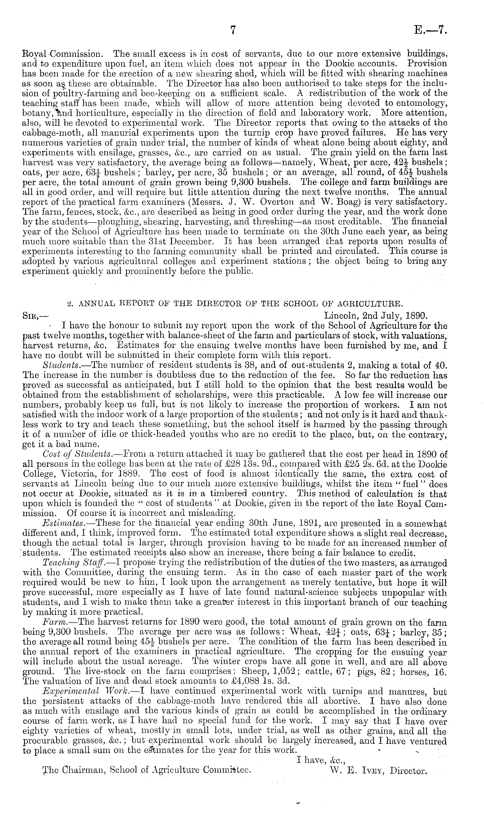Royal-Commission. The small excess is in cost of servants, due to our more extensive buildings, and to expenditure upon fuel, an item which does not appear in the Dookie accounts. Provision has been made for the erection of a new shearing shed, which will be fitted with shearing machines as soon as these are obtainable. The Director has also been authorised to take steps for the inclusion of poultry-farming and bee-keeping on a sufficient scale. A redistribution of the work of the teaching staff has been made, which will allow of more attention being devoted to entomology, botany, horticulture, especially in the direction of field and laboratory work. More attention, also, will be devoted to experimental work. The Director reports that owing to the attacks of the cabbage-moth, all manurial experiments upon the turnip crop have proved failures. He has very numerous varieties of grain under trial, the number of kinds of wheat alone being about eighty, and experiments with ensilage, grasses, &c, are carried on as usual. The grain yield on the farm last harvest was very satisfactory, the average being as follows —namely, Wheat, per acre, 42i bushels; oats, per acre, 63J- bushels ; barley, per acre, 35 bushels ; or an average, all round, of 45f bushels per acre, the total amount of grain grown being 9,300 bushels. The college and farm buildings are all in good order, and will require but little attention during the next twelve months. The annual report of the practical farm examiners (Messrs. J. W. Overtoil and W. Boag) is very satisfactory. The farm, fences, stock, &c, are described as being in good order during the year, and the work done by the students —ploughing, shearing, harvesting, and threshing—as most creditable. The financial year of the School of Agriculture has been made to terminate on the 30th June each year, as being much more suitable than the 31st December. It has been arranged that reports upon results of experiments interesting to the farming community shall be printed and circulated. This course is adopted by various agricultural colleges and experiment stations; the object being to bring any experiment quickly and prominently before the public. ■2. ANNUAL REPORT OF THE DIRECTOR OF THE SCHOOL OP AGRICULTURE. Sib,— Lincoln, 2nd July, 1890. I have the honour to submit my report upon the work of the School of Agriculture for the past twelve months, together with balance-sheet of the farm and particulars of stock, with valuations, harvest returns, &c. Estimates for the ensuing twelve months have been furnished by me, and I have no doubt will be submitted in their complete form with this report. Students. —The number of resident students is 38, and of out-students 2, making a total of 40. The increase in the number is doubtless due to the reduction of the fee. So far the reduction has proved as successful as anticipated, but I still hold to the opinion that the best results would be obtained from the establishment of scholarships, were this practicable. A low fee w rill increase our numbers, probably keep us full, but is not likely to increase the proportion of workers. lam not satisfied with the indoor work of a large proportion of the students ; and not only is it hard and thankless work to try and teach these something, but the school itself is harmed by the passing through it of a number of idle or thick-headed youths who are no credit to the place, but, on the contrary, get it a bad name. Cost of Students. —From a return attached it may be gathered that the cost per head in 1890 of all persons in the college has been at the rate of £28 13s. 9d., compared with £25 2s. 6d. at the Dookie College, Victoria, for 1889. The cost of food is almost identically the same, the extra cost of servants at Lincoln being due to our much more extensive buildings, whilst the item "fuel" does not occur at Dookie, situated as it is in a timbered country. This method of calculation is that upon which is founded the " cost of students " at Dookie, given in the report of the late Royal Commission. Of course it is incorrect and misleading. Estimates. —These for the financial year ending 30th June, 1891, are presented in a somewhat different and, I think, improved form. The estimated total expenditure shows a slight real decrease, though the actual total is larger, through provision having to be made for an increased number of students. The estimated receipts also show an increase, there being a fair balance to credit. Teaching Staff. —I propose trying the redistribution of the duties of the two masters, as arranged with the Committee, during the ensuing term. As in the case of each master part of the work required would be new to him, I look upon the arrangement as merely tentative, but hope it will prove successful, more especially as I have of late found natural-science subjects unpopular with students, and I wish to make them take a greater interest in this important branch of our teaching by making it more practical. Farm. —The harvest returns for 1890 were good, the total amount of grain grown on the farm being 9,300 bushels. The average per acre was as follows : Wheat, 42J ; oats, 63J ; barley, 35 ; the average all round being 45-J- bushels per acre. The condition of the farm has been described in the annual report of the examiners in practical agriculture. The cropping for the ensuing year will include about the usual acreage. The winter crops have all gone in well, and are all above ground. The live-stock on the farm comprises: Sheep, 1,052; cattle, 67; pigs, 82; horses, 16. The valuation of live and dead stock amounts to £4,088 Is. 3d. Experimental Work. —l have continued experimental w rork with turnips and manures, but the persistent attacks of the cabbage-moth have rendered this all abortive. I have also done as much with ensilage and the various kinds of grain as could be accomplished in the ordinary course of farm work, as I have had no special fund for the 
