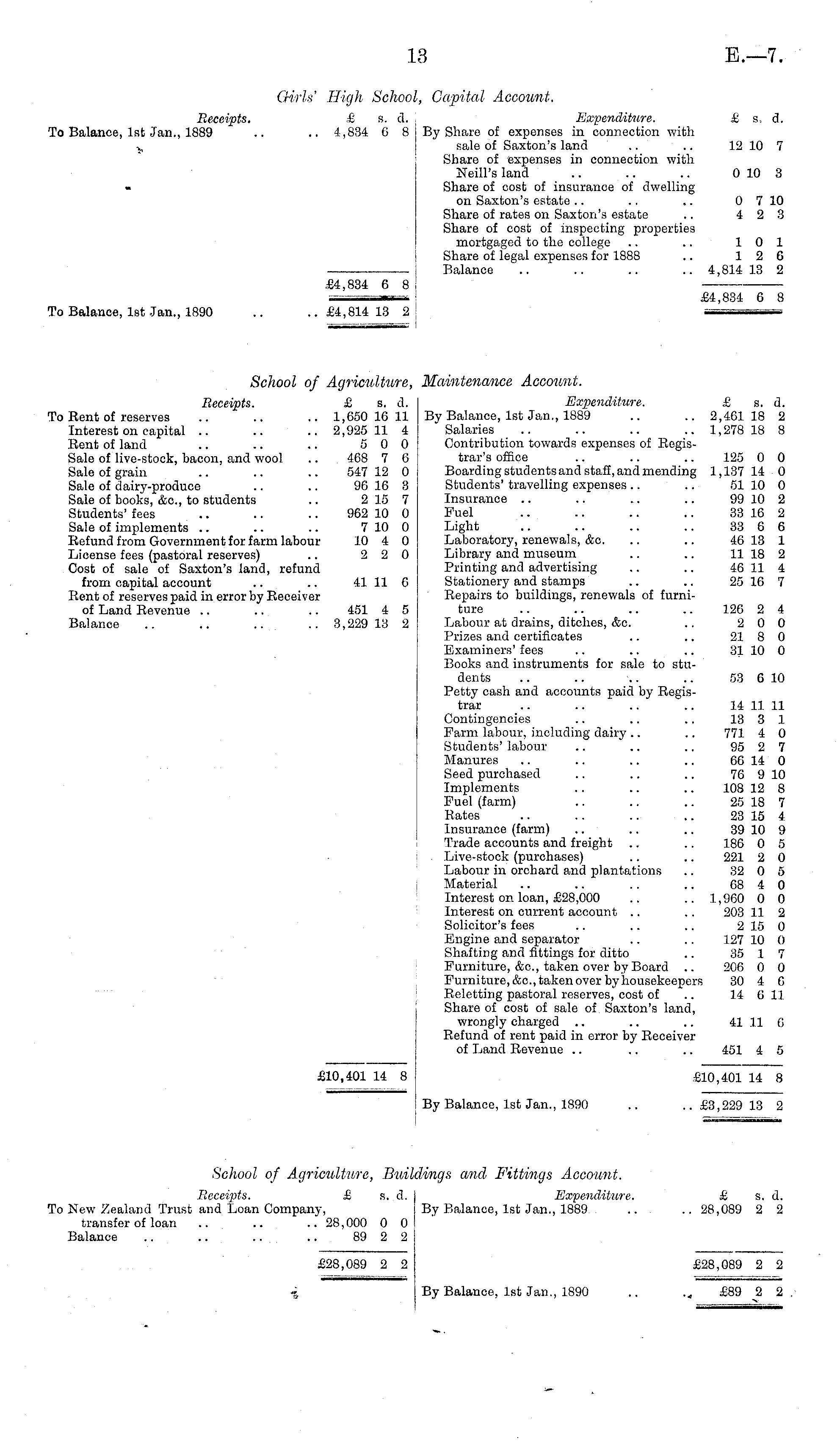 Girls' High School, Capital Account, Receipts. & s. d. Expenditure. £ s, d. To Balance, Ist Jan., 1889 .. .. 4,834 6 8 By Share of expenses in connection with sale of Saxton's land .. .. 12 10 7 Share of expenses in connection with Neill's land .. .. .. 0 10 3 Share of cost of insurance of dwelling on Saxton's estate .. .. ~ 0 7 10 Share of rates on Saxton's estate .. 4 2 3 Share of cost of inspecting properties mortgaged to the college .. .. 10 1 | Share of legal expenses for 1888 .. 12 6 ! Balance .. .. .. .. 4,814 13 2 £4,834 6 8 ! tt -■- I £4,834 6 8 To Balance, Ist Jan., 1890 .. .. £4,814 13 2 — — School of Agriculture, Maintenance Account. Receipts. £ s. d. Expenditure. £ s. d. To Kent of reserves .. .. .. 1,650 16 11 By Balance, Ist Jan., 1889 .. .. 2,46118 2 Interest on capital .. .. .. 2,925 11 4 Salaries .. .. .. .. 1,278 18 8 Rent of land .. .. .. 5 0 0 Contribution towards expenses of RogisSale of live-stock, bacon, and wool .. 468 7 6 trar's office .. .. .. 125 0 0 Sale of grain .. .. .. 547 12 0 Boarding students and staff, and mending 1,137 14 0 Sale of dairy-produce .. .. 96 16 3 Students' travelling expenses .. .. 51 10 0 Sale of books, &c, to students .. 215 7 Insurance .. .. .. .. 99 10 2 Students' fees .. .. .. 962 10 0 Fuel .. .. .. .. 33 16 2 Sale of implements .. .. .. 7 10 0 Light .. .. .. .. 33 6 6 Eefund from Government for farm labour 10 4 0 Laboratory, renewals, &c. .. .. 46 13 1 License fees (pastoral reserves) .. 2 2 0 Library and museum .. .. 11 18 2 Cost of sale of Saxton's land, refund Printing and advertising .. .. 46 11 4 from capital account .. .. 4.1 11 6 Stationery and stamps .. .. 25 16 7 Rent of reserves paid in error by Receiver Repairs to buildings, renewals of furniof Land Revenue .. .. .. 451 4 5 ture .. .. .. .. 126 2 4 Balance .. .. 3,229 13 2 Labour at drains, ditches, &c. .. 2 0 0 Prizes and certificates .. .. 21 8 0 Examiners' fees .. .. .. 31 10 0 Books and instruments for sale to students .. .. .. .. 53 610 Petty cash and accounts paid by Registrar .. .. .. .. 14 11 11 Contingencies .. .. .. 13 3 1 Farm labour, including dairy .. .. 771 4 0 Students'labour .. .. .. 95 2 7 Manures .. .. .. .. 66 14 0 Seed purchased .. .. .. 76 910 Implements .. .. .. 108 12 8 Fuel (farm) .. .. .. 25 18 7 Rates .. .. .. .. 23 15 4 Insurance (farm) .. .. .. 39 10 9 Trade accounts and freight .. .. 186 0 5 Live-stock (purchases) .. .. 221 2 0 Labour in orchard and plantations .. 32 0 5 Material .. .. .. .. 68 4 0 Interest on loan, £28,000 .. .. 1,960 0 0 Interest on current account .. .. 203 11 2 Solicitor's fees .. .. .. 2 15 0 Engine and separator .. .. 127 10 0 Shafting and fittings for ditto .. 35 1 7 Furniture, &c, taken over by Board .. 206 0 0 Furniture,&c.,takenover by housekeepers 30 4 6 Reletting pastoral reserves,' cost of .. 14 611 Share of cost of sale of Saxton's land, wrongly charged .. .. .. 41 11 6 Refund of rent paid in error by Receiver of Land Revenue .. .. .. 451 4 5 £10,401 14. 8 £10,401 14 8 By Balance, Ist Jan., 1890 .. ..£3,229 13 2 School of Agriculture, Buildings and Fittings Account. Receipts. £ s. d. Expenditure. £ s. d. To New Zealand Trust and Loan Company, By Balance, Ist Jan., 1889 .. .. 28,089 2 2 transfer of loan .. .. .. 28,000 0 0 Balance .. .. .... .. 89 2 2 £28,089 2 2 £28,089 2 2 By Balance, Ist Jan., 1890 .. ~ £89 2 2