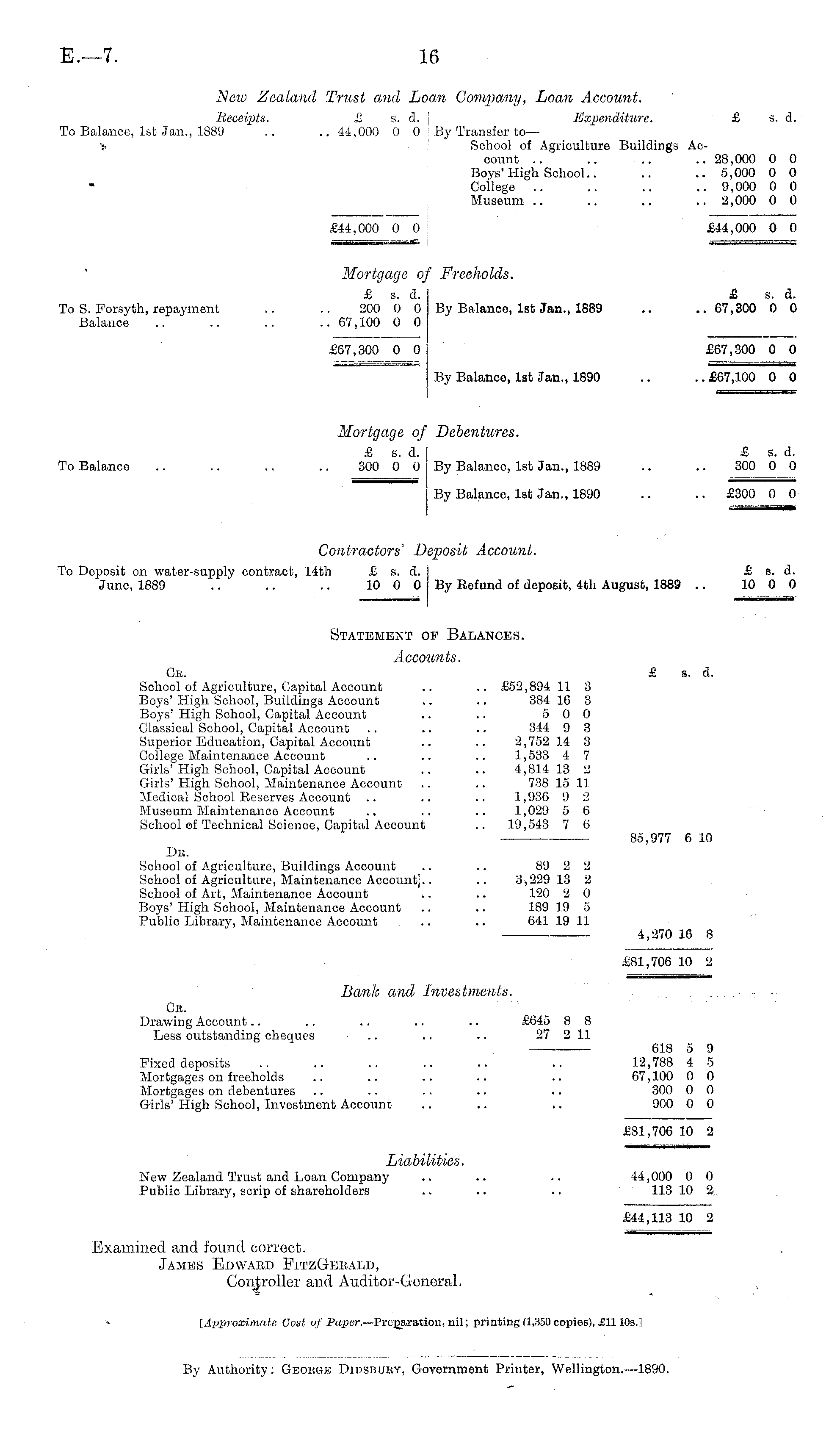 New Zealand Trust and Loan Company, Loan Account. Receipts, £ s. d. I Expenditure. £ s. d. To Balance, Ist Jan., 1889 .. ..44,000 0 0 By Transfer to-— School of Agriculture Buildings Account .. .. .. .. 28,000 0 0 Boys' High School.. .. .. 5,000 0 0 College .. .. .. .. 9,000 0 0 Museum .. .. .. .. 2,000 0 0 £44,000 0 0 £44,000 0 0 Mortgage of Freeholds. £ s. d. £ s. d. To S. Forsyth, repayment .. .. 200 0 0 By Balance, Ist Jan., 1889 .. .. 67,300 0 0 Balance .. .. .. .. 67,100 0 0 £67,300 0 0 £67,300 0 0 By Balance, Ist Jan., 1890 .. .. £67,100 0 0 Mortgage of Debentures. £ s. d. £ s. d. To Balance .. .. .. .. 300 0 0 By Balance, Ist Jan., 1889 .. .. 300 0 0 By Balance, Ist Jan., 1890 .. .. £300 0 0 Contractors' Deposit Account. To Deposit on water-supply contract, 14th £ s. d. £ s. d. June, 1889 .. .. .. 10 0 0 By Refund of deposit, 4th August, 1889 .. 10 0 0 Statement of Balances. Accounts. Gk. £ s. d. School of Agriculture, Capital Account .. .. £52,894 11 3 Boys' High School, Buildings Account .. .. 384 16 3 Boys' High School, Capital Account .. .. 5 0 0 Classical School, Capital Account .. .. .. 344 9 3 Superior Education, Capital Account .. .. 2,752 14 3 College Maintenance Account .. .. .. 1,533 4 7 Girls' High School, Capital Account .. .. 4,814 13 ti Girls' High School, Maintenance Account .. .. 738 15 11 Medical School Reserves Account .. .. .. 1,936 9 2 Museum Maintenance Account .. .. .. 1,029 5 C School of Technical Science, Capital Account .. 19,543 7 6 q~ 077 a in Db. School of Agriculture, Buildings Account .. .. 89 2 2 School of Agriculture, Maintenance Account,.. .. 3,229 13 2 School of Art, Maintenance Account ~ .. 120 2 0 Boys' High School, Maintenance Account .. .. 189 19 5 Public Library, Maintenance Account .. .. 641 19 11 —— 4,270 16 8 £81,706 10 2 Bank and Investments. Ca. Drawing Account.. .. .. .. .. £645 8 8 Less outstanding cheques .. .. .. 27 211 . 618 5 9 Fixed deposits .. .. .. .. .. .. 12,788 4 5 Mortgages on freeholds .. .. .. .. .. 67,100 0 0 Mortgages on debentures .. .. .. . ■ .. 300 0 0 Girls' High School, Investment Account .. .. .. 900 0 0 £81,706 10 2 Liabilities. iStew Zealand Trust and Loan Company .. .. .. 44,000 0 0 Public Library, scrip of shareholders .. .. .. 113 10 2, £44,113 10 2 Examined and found correct. Jambs Edwabd FitzGeeald, Controller and Auditor-General. [Approximate Cost of Paper.— Preparation, nil; printing d,350 copies), £1110s.j