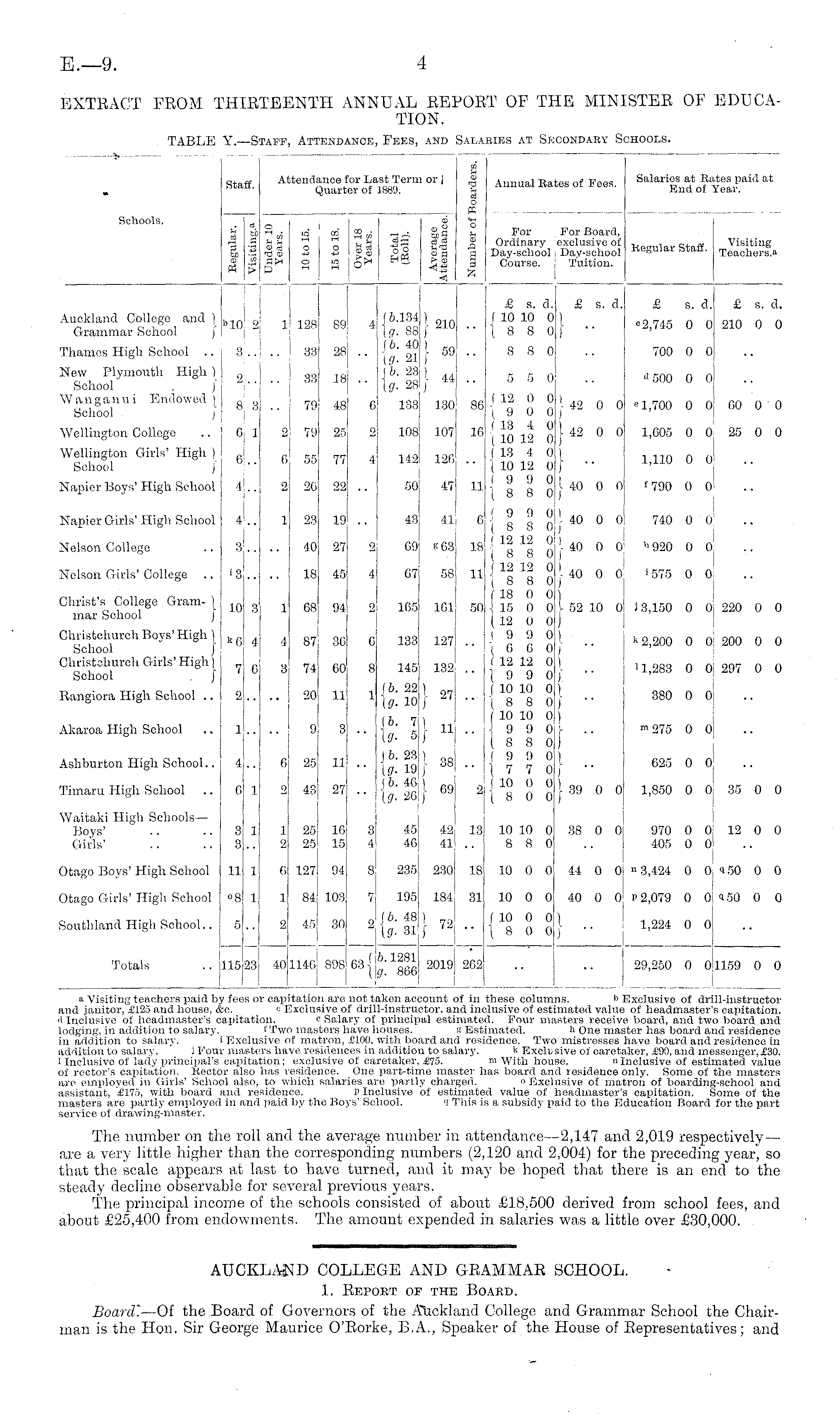 EXTRACT FROM THIRTEENTH ANNUAL REPORT OF THE MINISTER OF EDUCATION. TABLE Y.—Staff, Attendance, Fees, and Salaries at Secondary Schools.
