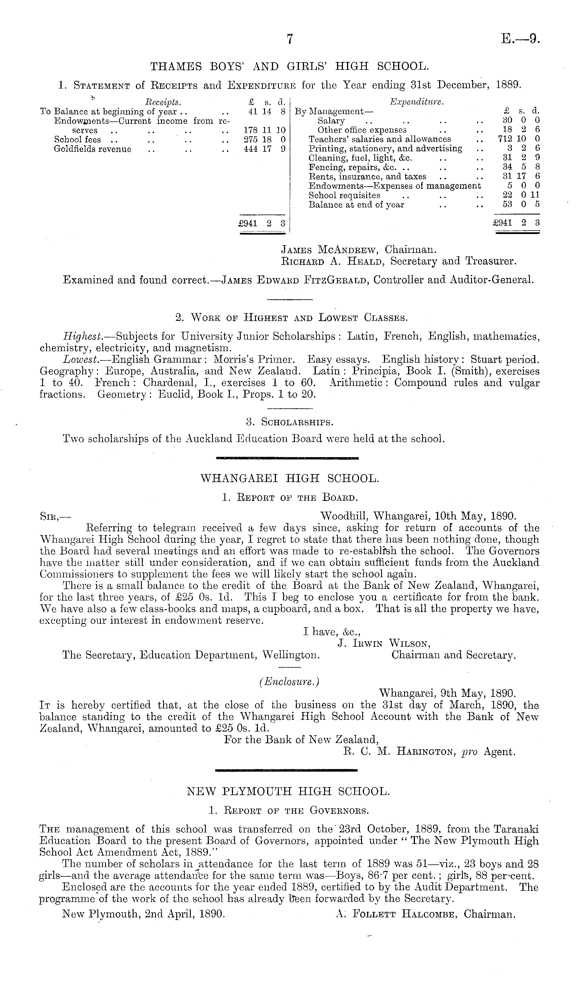 (Enclosure.) Whangarei, 9th May, 1890. It is hereby certified that, at the close of the business on the 31st day of March, 1890, the balance standing to the credit of the Whangarei High School Account with the Bank of New Zealand, Whangarei, amounted to £25 os. Id. For the Bank of New Zealand, B. C. M. Haeinoton, pro Agent.