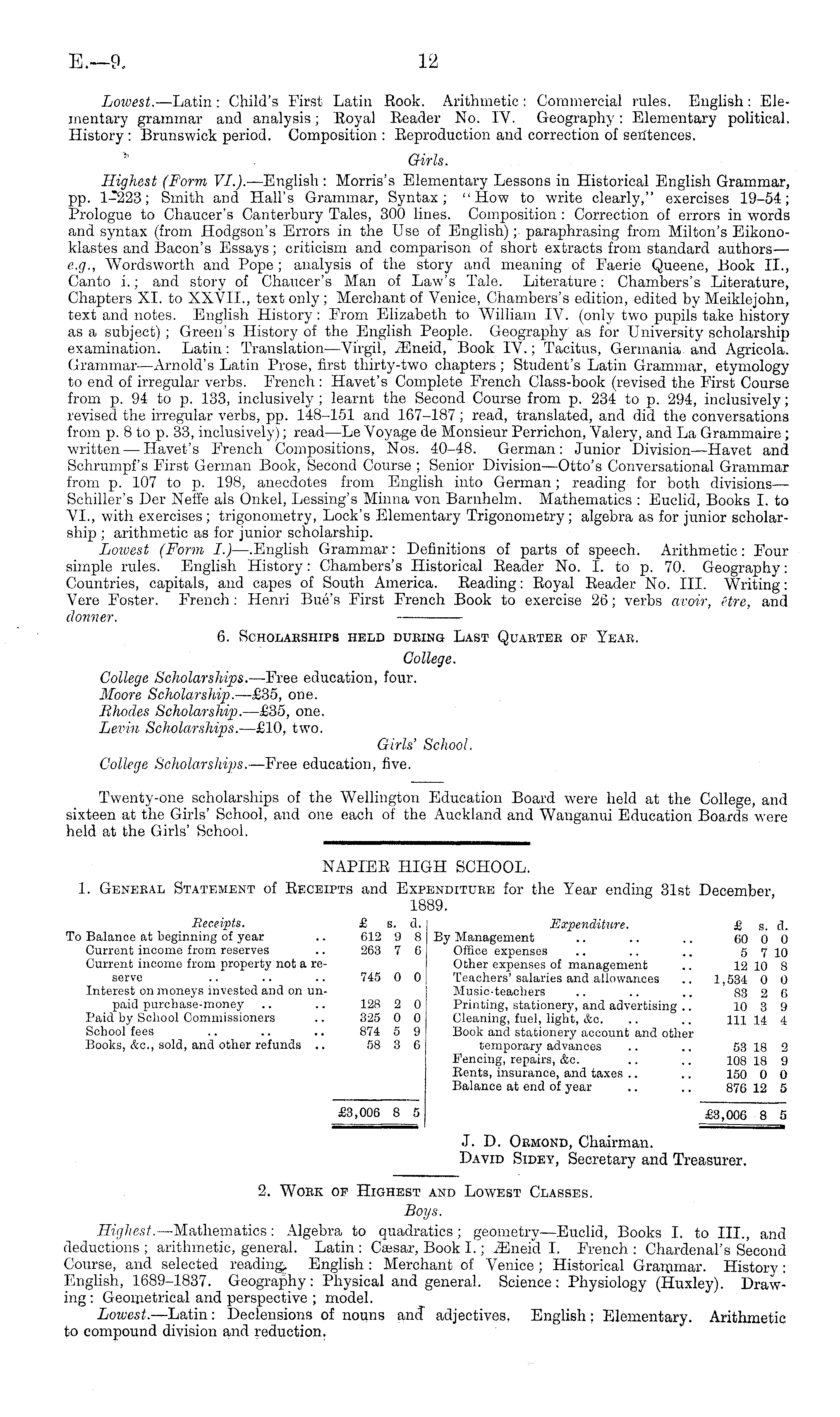 NAPIER HIGH SCHOOL. 1. Geneeal Statement of Receipts and Expendituee for the Year ending 31st December 1889. Receipts. £ s. d. Expenditure. £ s . d. To Balance at beginning of year .. 612 9 8 By Management .. .. .. 60 0 0 Current income from reserves .. 263 7 6 Office expenses .. .. .. 5 7 10 Current income from property not a re- Other expenses of management .. 12 10 8 serve .. .. .. 745 0 0 Teachers' salaries and allowances .. 1,534 0 0 Interest on moneys invested and on un- Music-teachers .. .. .. 83 2 6 paid purchase-money .. .. 128 2 0 Printing, stationery, and advertising .. 10 3 9 Paid by School Commissioners .. 325 0 0 Cleaning, fuel, light, &c. .. .. 11l 14 4 School fees .. .. .. 874 5 9 Book and stationery account and other Books, &c, sold, and other refunds .. 58 3 6 temporary advances .. .. 53 18 2 Fencing, repairs, &c. .. .. 108 18 9 Rents, insurance, and taxes .. .. 150 0 0 Balance at end of year .. .. 876 12 5 £3,006 8 5 £3,006 8 5 J. D. Oemond, Chairman. David Sidey, Secretary and Treasurer.