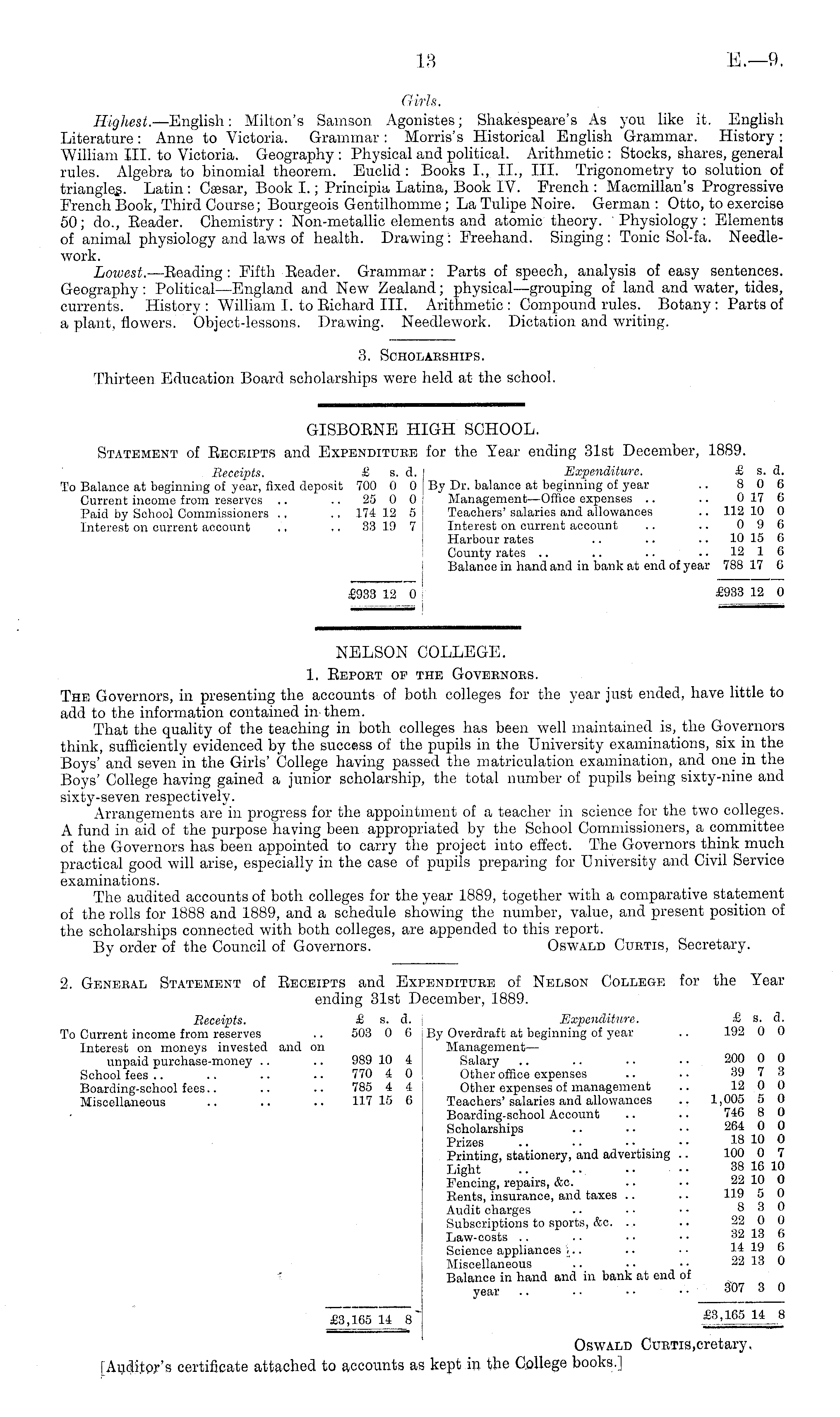 NELSON COLLEGE. 1. Repoet of the Governoes. The Governors, in presenting the accounts of both colleges for the year just ended, have little to add to the information contained in them. That the quality of the teaching in both colleges has been well maintained is, the Governors think, sufficiently evidenced by the success of the pupils in the University examinations, six in the Boys' and seven in the Girls' College having passed the matriculation examination, and one in the Boys' College having gained a junior scholarship, the total number of pupils being sixty-nine and sixty-seven respectively. Arrangements are in progress for the appointment of a teacher in science for the two colleges. A fund in aid of the purpose having been appropriated by the School Commissioners, a committee of the Governors has been appointed to carry the project into effect. The Governors think much practical good will arise, especially in the case of pupils preparing for University and Civil Service examinations. The audited accounts of both colleges for the year 1889, together with a comparative statement of the rolls for 1888 and 1889, and a schedule showing the number, value, and present position of the scholarships connected with both colleges, are appended to this report. By order of the Council of Governors. Oswald Curtis, Secretary.