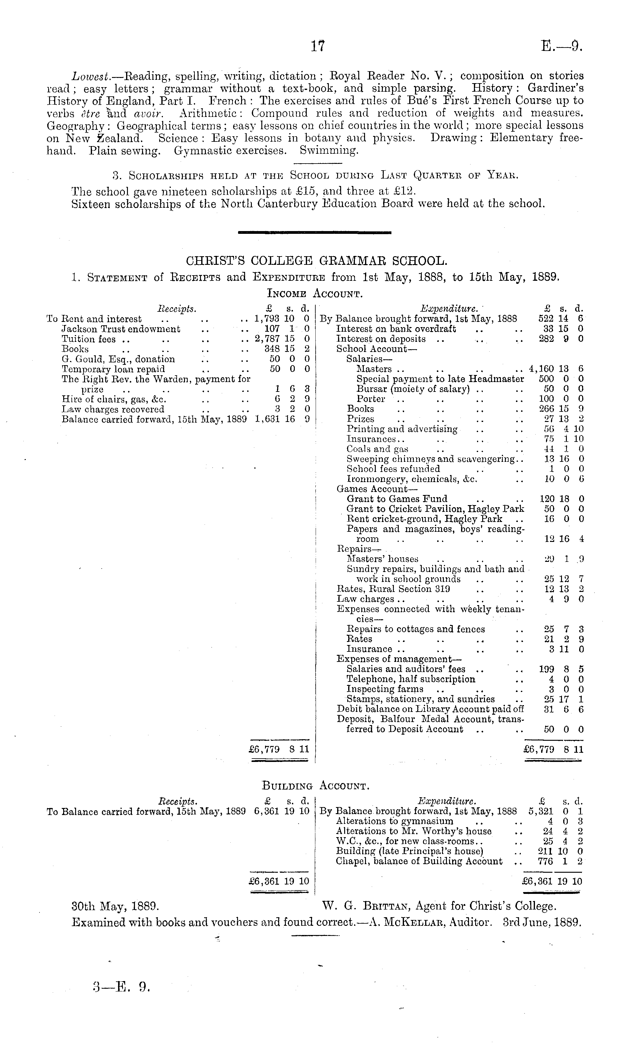 CHRIST'S COLLEGE GRAMMAR SCHOOL. 1. Statement of Receipts and Expenditure from Ist May, 1888, to 15th May, 1889. Income Account. Receipts. £ s. d. Expenditure. ' £ s. d. To Bent and interest .. .. .. 1,793 10 0 By Balance brought forward, Ist May, 1888 522 14 6 Jackson Trust endowment .. .. 107 1 0 Interest on bank overdraft .. .. 33 15 0 Tuition fees .. .. .. .. 2,787 15 0 Interest on deposits .. .. .. 282 9 0 Books .. .. .. .. 348 15 2 School Account — G. Gould, Esq., donation .. .. 50 0 0 Salaries— Temporary loan repaid .. .. 50 0 0 Masters .. .. .. .. 4,160 13 6 The Bight Bev. the Warden, payment for Special payment to late Headmaster 500 0 0 prize .. .. .. .. 16 3 Bursar (moiety of salary) .. .. 50 0 0 Hire of chairs, gas, &c. .. .. 0 2 9 Porter .. .. .. 100 0 0 Law charges recovered .. .. 3 2 0 Books .. .. .. .. 266 15 9 Balance carried forward, 15th May, 1889 1,63116 9 Prizes .. .. .. .. 27 13 2 Printing and advertising .. .. 50 410 Insurances.. .. .. .. 75 1 10 Coals and gas .. .. .. 44 1 0 Sweeping chimneys and scavengering.. 13 16 0 School fees refunded .. .. 10 0 Ironmongery, chemicals, <_x. .. 10 0 6 Games Account— Grant to Games Fund .. .. 120 18 0 Grant to Cricket Pavilion, Hagley Park 50 0 0 Rent cricket-ground, Hagley Park .. 16 0 0 Papers and magazines, boys' readingroom .. .. .. .. 12 16 4 Repairs^ . Masters' houses .. .. .. 29 1.9 Sundry repairs, buildings and bath and work in school grounds .. .. 25 12 7 Rates, Rural Section 319 .. .. 12 13 2 Law charges .. .. .. .. 4 9 0 Expenses connected with weekly tenancies— Repairs to cottages and fences .. 25 7 3 Rates .. .. .. .. 21 2 9 Insurance .. .. .. .. 3 110 Expenses of management— Salaries and auditors'fees .. .. 199 8 5 Telephone, half subscription .. 4 0 0 Inspecting farms .. .. .. 3 0 0 Stamps, stationery, and sundries .. 25 17 1 Debit balance on Library Account paid off 316 6 Deposit, Balfour Medal Account, transferred to Deposit Account .. .. 50 0 0 £6,779 8 11 £6,779 8 11 Building Account. Receipts. £ s. d. Expenditure. £ s. d. To Balance carried forward, 15th May, 1889 6,36119 10 By Balance brought forward, Ist May, 1888 5,321 0 1 Alterations to gymnasium .. .. 4 0 3 Alterations to Mr. Worthy's house .. 24 4 2 W.C., &c, for new class-rooms.. .. 25 4 2 Building (late Principal's house) .. 211 10 0 Chapel, balance of Building Account .. 776 1 2 £6,361 19 10 £6,361 19 10 30th May, 1889. W. G. Brittan, Agent for Christ's College. Examined with books and vouchers and found correct.—A. McKellae, Auditor. 3rd June, 1889.