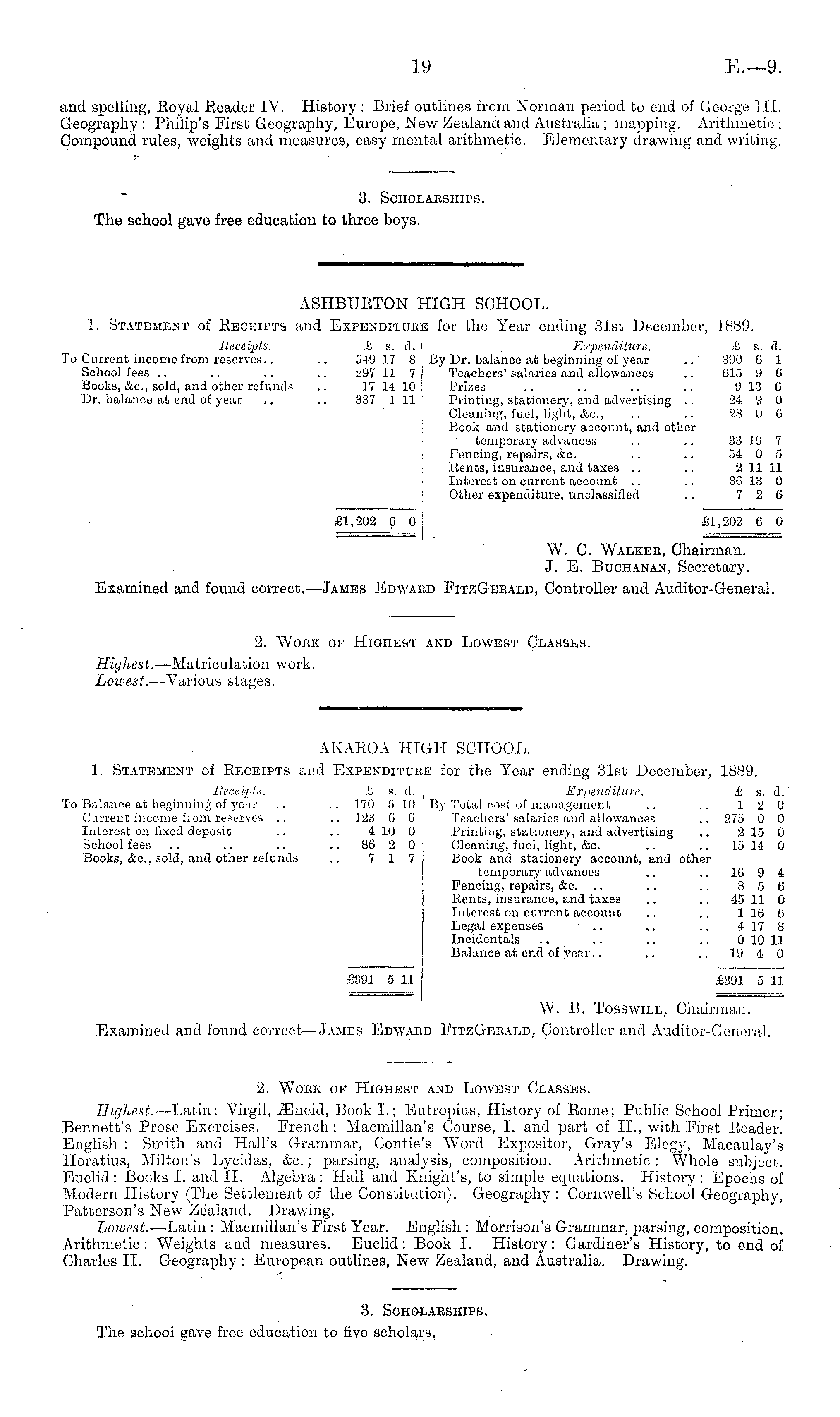 AKAROA HIGH SCHOOL. 1. Statement of Receipts and Expenditure for the Year ending 31st December, 1889. Receipts. £ s. d. : Expenditure. £ s. d. To Balance at beginning of year .. .. 170 510| By Total cost of management .. .. 12 0 Current income from reserves .. .. 123 6 G I Teachers'salaries and allowances .. 275 0 0 Interest on fixed deposit .. .. 410 0 Printing, stationery, and advertising .. 215 0 School fees .. .. ... .. 86 2 0 Cleaning, fuel, light, &c. .. 15 14 0 Books, &c, sold, and other refunds .. 7 17 Book and stationery account, and other temporary advances .. .. 16 9 4 Fencing, repairs, &c. .. .. .. 8 5 6 Rents, insurance, and taxes .. .. 45 11 0 Interest on current account .. .. 1 16 6 Legal expenses • .. .. .. 417 8 Incidentals .. .. .. .. 010 11 Balance at end of year.. .. .. 19 4 0 £391 5 11 £391 5 11 W. B. Tosswill, Chairman. Examined and found correct —James Edward FitzGerald, Controller and Auditor-General.