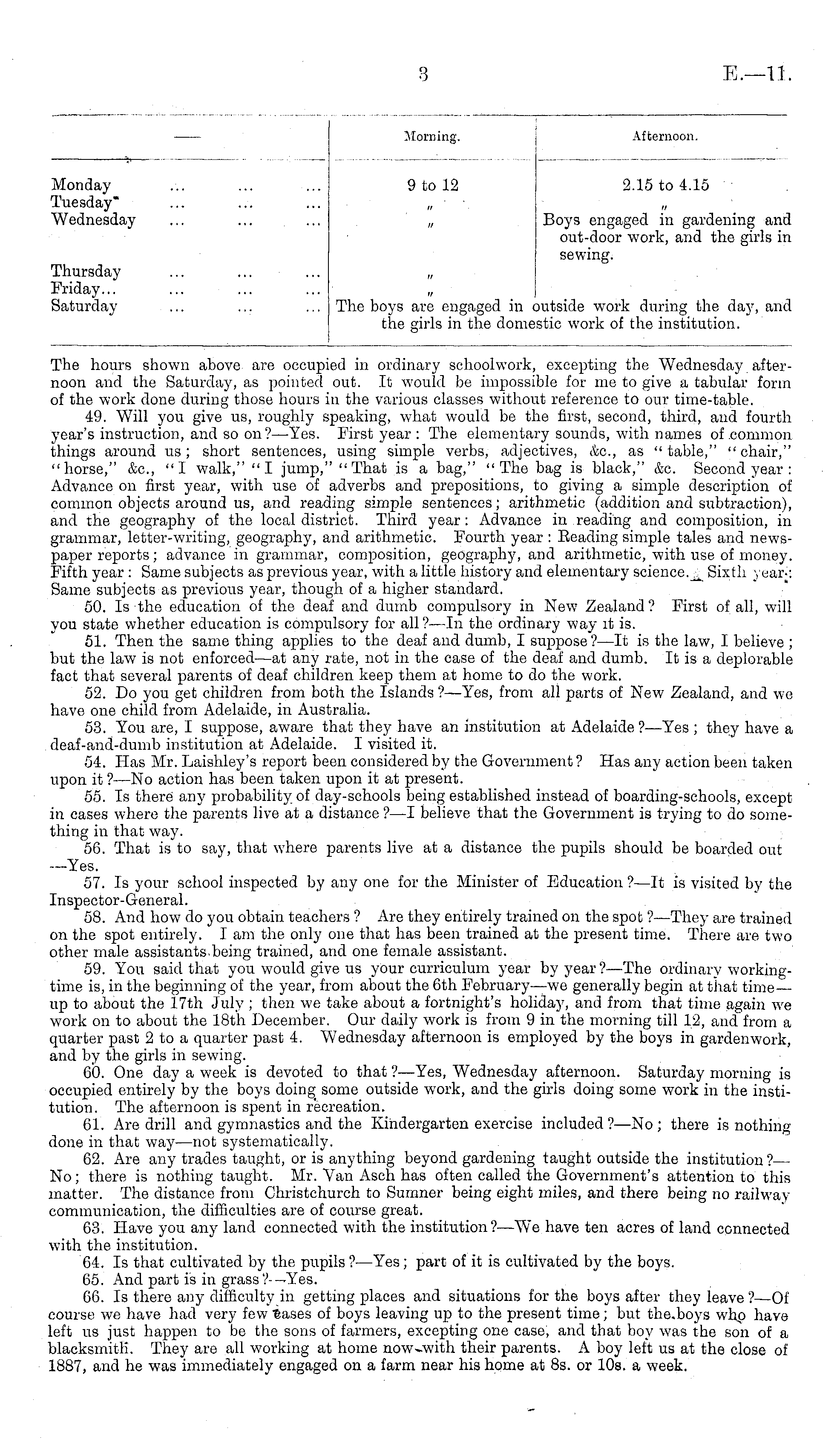 The hours shown above are occupied in ordinary schoolwork, excepting the Wednesday afternoon and the Saturday, as pointed out. It would be impossible for me to give a tabular form of the work done during those hours in the various classes without reference to our time-table. 49. Will you give us, roughly speaking, what would be the first, second, third, and fourth year's instruction, and so on ? —Yes. First year : The elementary sounds, with names of .common things around us; short sentences, using simple verbs, adjectives, &0., as "table," "chair," "horse," &c, "I walk," "I jump," "That is a bag," "The bag is black," &c. Second year : Advance on first year, with use of adverbs and prepositions, to giving a simple description of common objects around us, and reading simple sentences; arithmetic (additioii and subtraction), and the geography of the local district. Third year: Advance in reading and composition, in grammar, letter-writing, geography, and arithmetic. Fourth year : Reading simple tales and newspaper reports; advance in grammar, composition, geography, and arithmetic, with use of money. Fifth year : Same subjects as previous year, with a little history and elementary science. _v Sixth year-: Same subjects as previous year, though of a higher standard. 50. Is the education of the deaf and dumb compulsory in New Zealand? First of all, will you state whether education is compulsory for all ?—ln the ordinary way it is. 51. Then the same thing applies to the deaf and dumb, I suppose?—lt is the law, I believe ; but the law is not enforced —at any rate, not in the case of the deaf and dumb. It is a deplorable fact that several parents of deaf children keep them at home to do the work. 52. Do you get children from both the Islands ?—Yes, from all parts of New Zealand, and we have one child from Adelaide, in Australia. 53. You are, I suppose, aware that they have an institution at Adelaide ?—Yes ; they have a deaf-and-dumb institution at Adelaide. I visited it. 54. Has Mr. Laishley's report been considered by the Government ? Has any action been taken upon it ? —No action has been taken upon it at present. 55. Is there any probability of day-schools being established instead of boarding-schools, except in cases where the parents live at a distance ? —I believe that the Government is trying to do something in that way. 56. That is to say, that where parents live at a distance the pupils should be boarded out —Yes. 57. Is your school inspected by any one for the Minister of Education ?—lt is visited by the Inspector-General. 58. And how do you obtain teachers ? Are they entirely trained on the spot ?—They are trained on the spot entirely. lam the only one that has been trained at the present time. There are two other male assistants.being trained, and one female assistant. 59. You said that you would give us your curriculum year by year ?—The ordinary workingtime is, in the beginning of the year, from about the 6th February—we generally begin at that time— up to about the 17th July ; then we take about a fortnight's holiday, and from that time again we work on to about the 18t'h December. Our daily work is from 9in the morning till 12, and from a quarter past 2to a quarter past 4. Wednesday afternoon is employed by the boys in gardenwork, and by the girls in sewing. 60. One day a week is devoted to that ? —Yes, Wednesday afternoon. Saturday morning is occupied entirely by the boys doing some outside work, and the girls doing some work in the institution. The afternoon is spent in recreation. 61. Are drill and gymnastics and the Kindergarten exercise included?—No; there is nothing done in that way —not systematically. 62. Are any trades taught, or is anything beyond gardening taught outside the institution?— No; there is nothing taught. Mr. Van Asch has often called the Government's attention to this matter. The distance from Christchurch to Sumner being eight miles, and there being no railway communication, the difficulties are of course great. 63. Have you any land connected with the institution? —We have ten acres of land connected with the institution. 64. Is that cultivated by the pupils ? —Yes; part of it is cultivated by the boys. 65. And part is in grass?-—Yes. 66. Is there any difficulty in getting places and situations for the boys after they leave ?—Of course we have had very few leases of boys leaving up to the present time ; but the.boys who have left us just happen to be the sous of farmers, excepting one case, and that boy was the son of a blacksmith. They are all working at home now^with their parents. A boy left us at the close of 1887, and he was immediately engaged on a farm near his home at Bs. or 10s. a week.