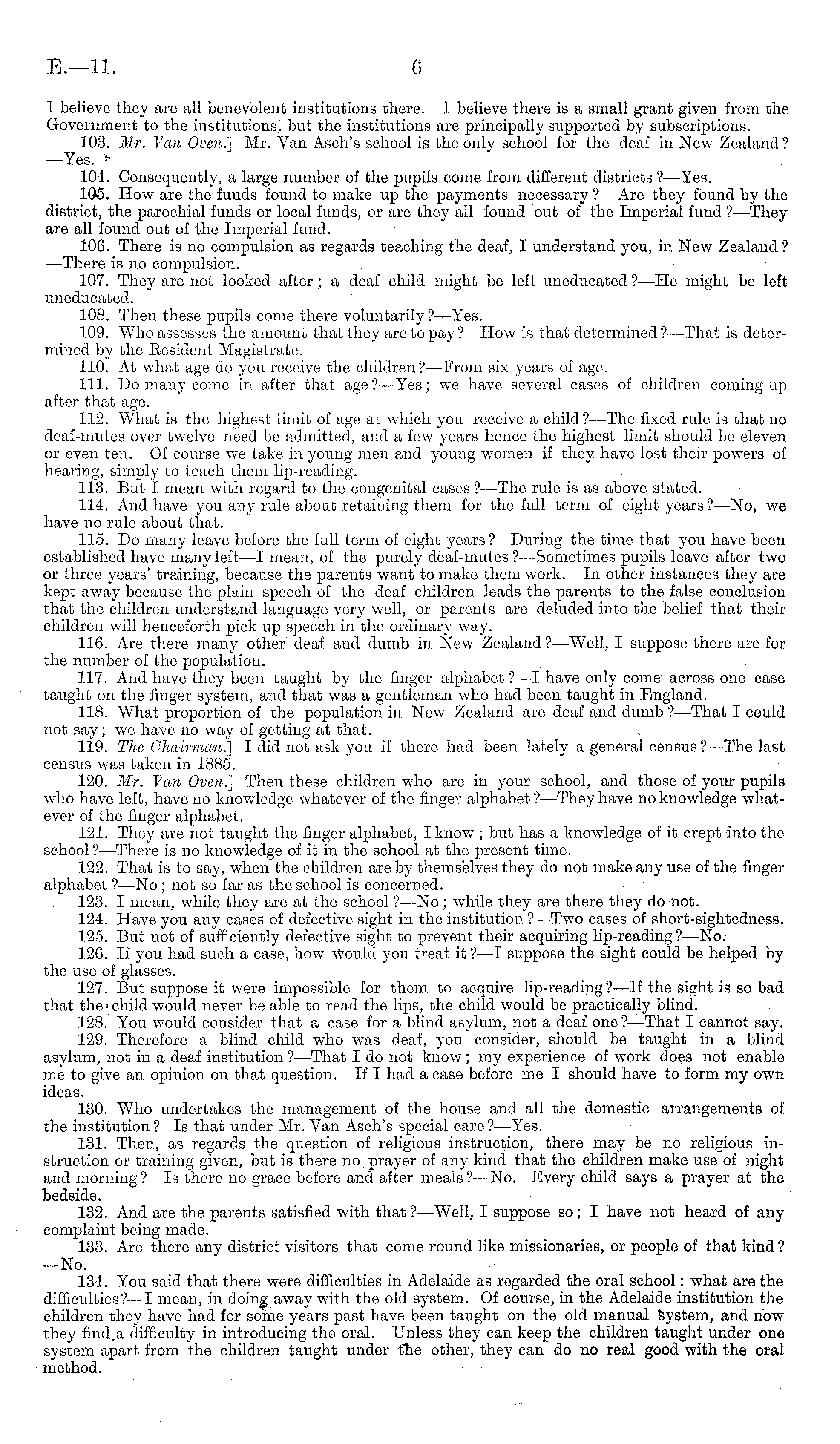 I believe they are all benevolent institutions there. I believe there is a small grant given from the Government to the institutions, but the institutions are principally supported by subscriptions. 103. Mr. Van Oven.'] Mr. Van Asch's school is the only school for the deaf in New Zealand? —Yes. * 104. Consequently, a large number of the pupils come from different districts ?—Yes. 105. How are the funds found to make up the payments necessary ? Are they found by the district, the parochial funds or local funds, or are they all found out of the Imperial fund ?—They are all found out of the Imperial fund. 106. There is no compulsion as regards teaching the deaf, I understand you, in New Zealand? —There is no compulsion. 107. They are not looked after; a deaf child might be left uneducated ?—He might be left uneducated. 108. Then these pupils come there voluntarily?— Yes. 109. Who assesses the amount that they are to pay? How is that determined ?—That is determined by the Eesident Magistrate. 110. At what age do you receive the children?— From six years of age. 111. Do many come in after that age?— Yes; we have several cases of children coming up after that age. 112. What is the highest limit of age at which you receive a child ?—The fixed rule is that no deaf-mutes over twelve need be admitted, and a few years hence the highest limit should be eleven or even ten. Of course we take in young men and young women if they have lost their powers of hearing, simply to teach them lip-reading. 113. But I mean with regard to the congenital cases ? —The rule is as above stated. 114. And have you any rule about retaining them for the full term of eight years ?—No, we have no rule about that. 115. Do many leave before the full term of eight years ? During the time that you have been established have many left—l mean, of the purely deaf-mutes ? —Sometimes pupils leave after two or three years' training, because the parents want to make them work. In other instances they are kept away because the plain speech of the deaf children leads the parents to the false conclusion that the children understand language very well, or parents are deluded into the belief that their children will henceforth pick up speech in the ordinary way. 116. Are there many other deaf and dumb in New Zealand ? —Well, I suppose there are for the number of the population. 117. And have they been taught by the finger alphabet? —I have only come across one case taught on the finger system, and that was a gentleman who had been taught in England. 118. What proportion of the population in New Zealand are deaf and dumb ? —That I could not say; we have no way of getting at that. 119. The Chairman.] I did not ask you if there had been lately a general census?— The last census was taken in 1885. 120. Mr. Van Oven.] Then these children who are in your school, and those of your pupils who have left, have no knowledge whatever of the finger alphabet?— They have no knowledge whatever of the finger alphabet. 121. They are not taught the finger alphabet, I know ; but has a knowledge of it crept into the school?— There is no knowledge of it in the school at the present time. 122. That is to say, when the children are by themselves they do not make any use of the finger alphabet ?—No ; not so far as the school is concerned. 123. I mean, while they are at the school ? —No; while they are there they do not. 124. Have you any cases of defective sight in the institution ?—Two cases of short-sightedness. 125. But not of sufficiently defective sight to prevent their acquiring lip-reading?— No. 126. If you had such a case, how would you treat it ? —I suppose the sight could be helped by the use of glasses. 127. But suppose it were impossible for them to acquire lip-reading?—lf the sight is so bad that the-child would never be able to read the lips, the child would be practically blind. 128. You would consider that a case for a blind asylum, not a deaf one?— That I cannot say. 129. Therefore a blind child who was deaf, you consider, should be taught in a blind asylum, not in a deaf institution ?—That I do not know ; my experience of work does not enable me to give an opinion on that question. If I had a case before me I should have to form my own ideas. 130. Who undertakes the management of the house and all the domestic arrangements of the institution? Is that under Mr. Van Asch's special care?— Yes. 131. Then, as regards the question of religious instruction, there may be no religious instruction or training given, but is there no prayer of any kind that the children make use of night and morning ? Is there no grace before and after meals ?—No. Every child says a prayer at the bedside. 132. And are the parents satisfied with that?— Well, I suppose so; I have not heard of any complaint being made. 133. Are there any district visitors that come round like missionaries, or people of that kind? —No. 134. You said that there were difficulties in Adelaide as regarded the oral school: what are the difficulties?—l mean, in doing away with the old system. Of course, in the Adelaide institution the children they have had for some years past have been taught on the old manual System, and now they find.a difficulty in introducing the oral. Unless they can keep the children taught under one system apart from the children taught under t*he other, they can do no real good with the oral method.