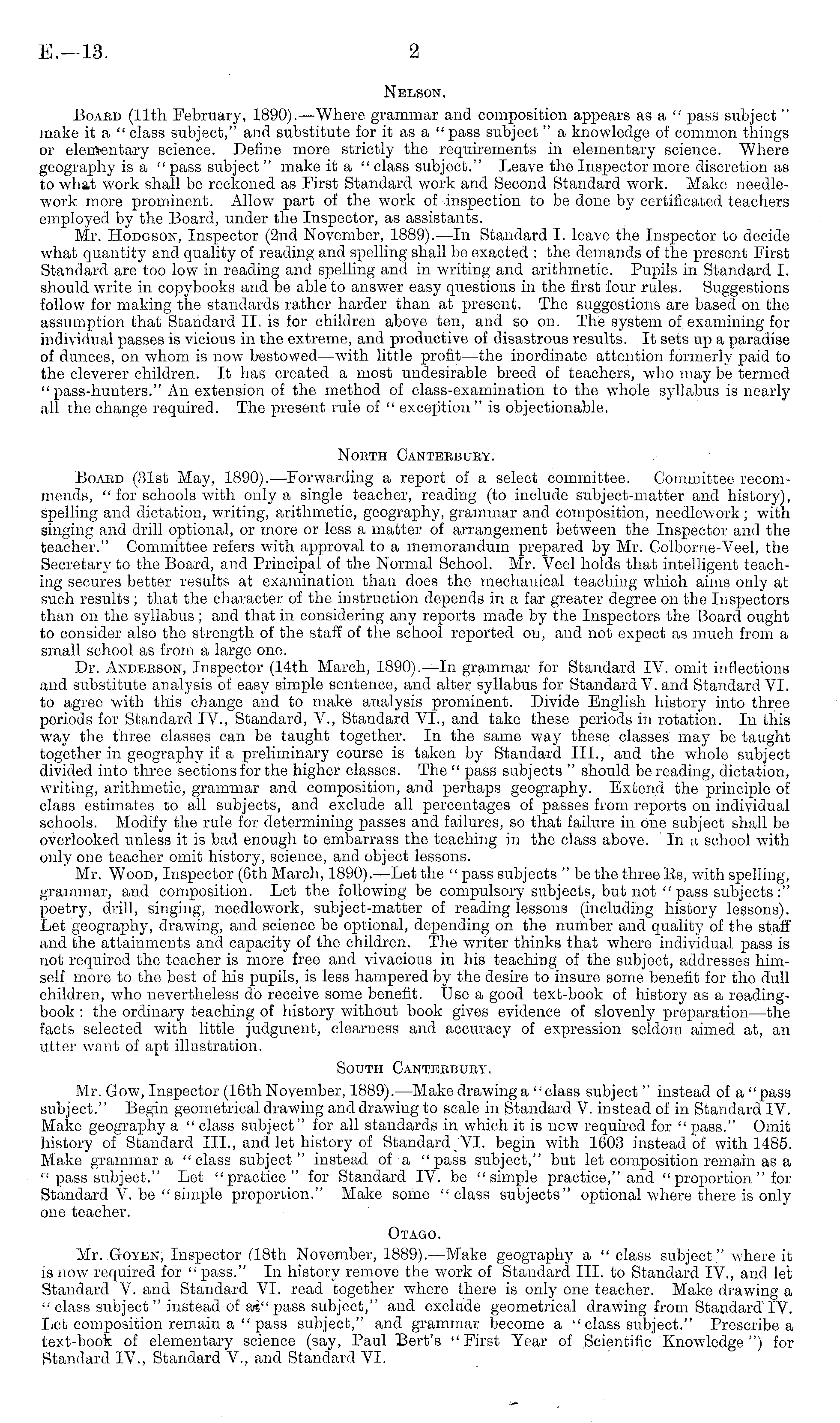 Nelson. Board (11th February, 1890). —Where grammar and composition appears as a " pass subject " make it a " class subject," and substitute for it as a " pass subject " a knowledge of common things or elementary science. Define more strictly the requirements in elementary science. Where geography is a " pass subject " make it a " class subject." Leave the Inspector more discretion as to what work shall be reckoned as First Standard work and Second Standard work. Make needlework more prominent. Allow part of the work of inspection to bo done by certificated teachers employed by the Board, under the Inspector, as assistants. Mr. Hodgson, Inspector (2nd November, 1889). —In Standard I. leave the Inspector to decide what quantity and quality of reading and spelling shall be exacted : the demands of the present First Standard are too low in reading and spoiling and in writing and arithmetic. Pupils in Standard I. should write in copybooks and be able to answer easy questions in the first four rules. Suggestions follow for making the standards rather harder than at present. The suggestions are based on the assumption that Standard 11. is for children above ten, and so on. The system of examining for individual passes is vicious in the extreme, and productive of disastrous results. It sets up a paradise of dunces, on whom is now bestowed —with little profit—the inordinate attention formerly paid to the cleverer children. It has created a most undesirable breed of teachers, who may be termed " pass-hunters." An extension of the method of class-examination to the whole syllabus is nearly all the change required. The present rule of " exception "is objectionable. North Canterbury. Board (31st May, 1890). —Forwarding a report of a select committee. Committee recommends, " for schools with only a single teacher, reading (to include subject-matter and history), spelling and dictation, writing, arithmetic, geography, grammar and composition, needlework; with singing and drill optional, or more or less a matter of arrangement between the Inspector and the teacher." Committee refers with approval to a memorandum prepared by Mr. Colborne-Veel, the Secretary to the Board, and Frincipal of the Normal School. Mr. Veel holds that intelligent teaching secures better results at examination than does the mechanical teaching which aims only at such results; that the character of the instruction depends in a far greater degree on the Inspectors than on the syllabus ; and that in considering any reports made by the Inspectors the Board ought to consider also the strength of the staff of the school reported on, and not expect as much from a small school as from a large one. Dr. Anderson, Inspector (14th March, 1890). —In grammar for Standard IV. omit inflections and substitute analysis of easy simple sentence, and alter syllabus for Standard V. and Standard VI. to agree with this change and to make analysis prominent. Divide English history into three periods for Standard IV., Standard, V., Standard VI., and take these periods in rotation. In this way the three classes can be taught together. In the SEime way these classes may be taught together in geography if a preliminary course is taken by Standard 111., and the whole subject divided into three sections for the higher classes. The " pass subjects " should be reading, dictation, writing, arithmetic, grammar and composition, and perhaps geography. Extend the principle of class estimates to all subjects, and exclude all percentages of passes from reports on individual schools. Modify the rule for determining passes and failures, so that failure in one subject shall be overlooked unless it is bad enough to embarrass the teaching in the class above. In a school with only one teacher omit history, science, and object lessons. Mr. Wood, Inspector (6th March, 1890). —Let the " pass subjects " be the three Es, with spelling, grammar, and composition. Let the following be compitlsory subjects, but not " pass subjects :" poetry, drill, singing, needlework, subject-matter of reading lessons (including history lessons). Let geography, drawing, and science be optional, depending on the number and quality of the staff and the attainments and capacity of the children. The writer thinks that where individual pass is not required the teacher is more free and vivacious in his teaching of the subject, addresses himself more to the best of his pupils, is less hampered by the desire to insure some benefit for the dull children, who nevertheless do receive some benefit. Use a good text-book of history as a readingbook : the ordinary teaching of history without book gives evidence of slovenly preparation—the facts selected with little judgment, clearness and accuracy of expression seldom aimed at, an utter want of apt illustration. South Canterbury. Mr. Gow, Inspector (16thNovember, 1889). —Makedrawinga "class subject " instead of a "pass subject." Begin geometrical drawing and drawing to scale in Standard V. instead of in Standard IV. Make geography a "class subject" for all standards in which it is new required for "pass." Omit history of Standard 111., and let history of Standard VI. begin with 160,3 instead of with 1485. Make grammar a "class subject" instead of a "pass subject," but let composition remain as a " pass subject." Let "practice" for Standard IV. be "simple practice," and " proportion " for Standard V. be " simple proportion." Make some "class subjects" optional where there is only one teacher. Otago. Mr. Goyen, Inspector (18th November, 1889). —Make geography a " class subject " where it is now required for "pass." In history remove the work of Standard 111. to Standard IV., and let Standard V. and Standard VI. read together where there is only one teacher. Make drawing a " class subject " instead of ai" pass subject," and exclude geometrical drawing from Standard IV. Let composition remain a " pass subject," and grammar become a " class subject.