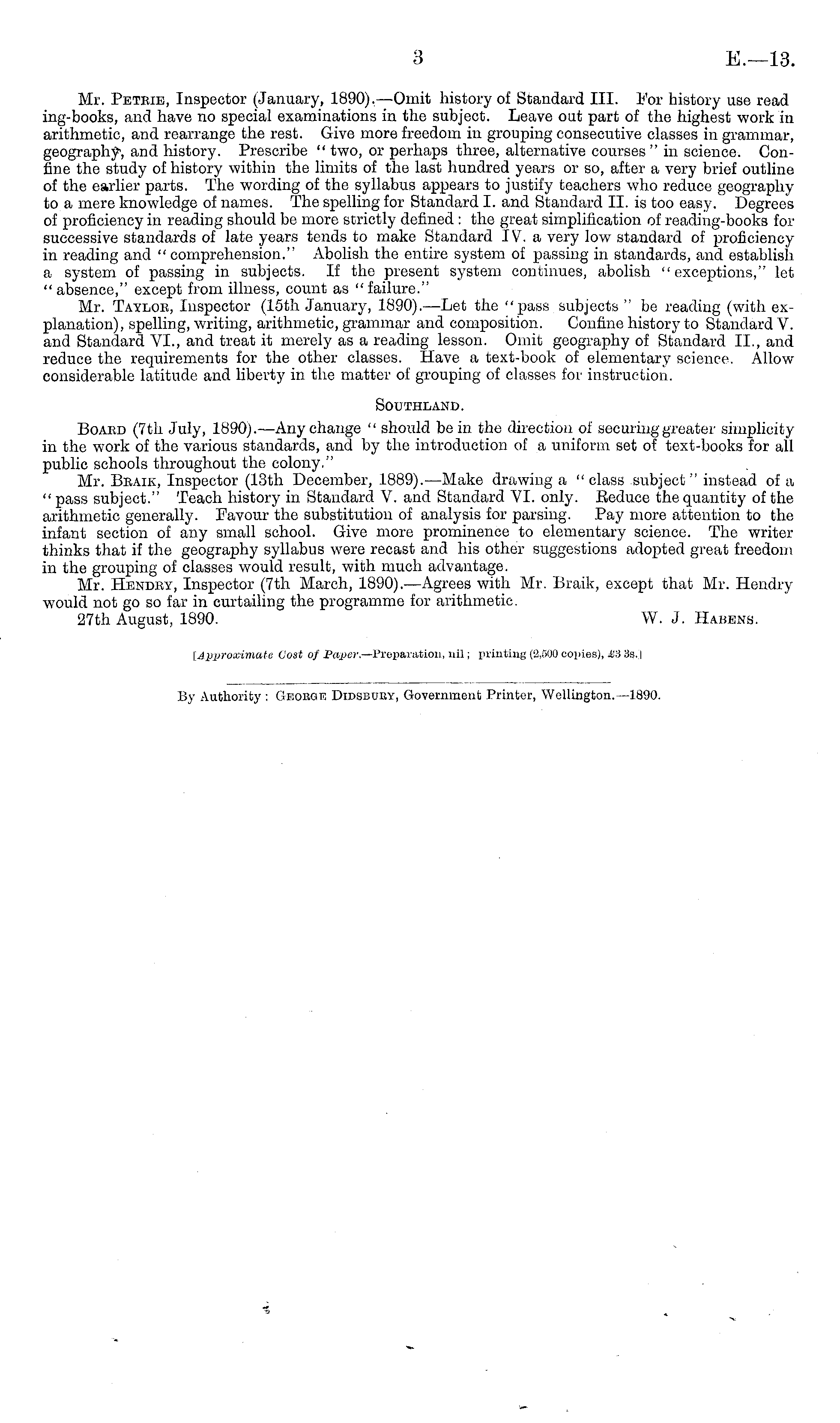 Mr. Petrie, Inspector (January, 1890). —Omit history of Standard 111. For history use read ing-books, and have no special examinations in the subject. Leave out part of the highest work in arithmetic, and rearrange the rest. Give more freedom in grouping consecutive classes in grammar, geography1, and history. Prescribe " two, or perhaps three, alternative courses "in science. Confine the study of history within the limits of the last hundred years or so, after a very brief outline of the earlier parts. The wording of the syllabus appears to justify teachers who reduce geography to a mere knowledge of names. The spelling for Standard I. and Standard 11. is too easy. Degree's of proficiency in reading should be more strictly defined : the great simplification of reading-books for successive standards of late years tends to make Standard IV. a very low standard of proficiency in reading and "comprehension." Abolish the entire system of passing in standards, and establish a system of passing in subjects. If the present system continues, abolish "exceptions," lot " absence," except from illness, count as "failure." Mr. Taylor, Inspector (15th January, 1890). —Let the "pass subjects " be reading (with explanation), spelling, writing, arithmetic, grammar and composition. Confine history to Standard V. and Standard VI., and treat it merely as a reading lesson. Omit geography of Standard lE, and reduce the requirements for the other classes. Have a text-book of elementary science. Allow considerable latitude and liberty in the matter of grouping of classes for instruction. Southland. Board (7th July, 1890). —-Any change " should be in the direction of securing greater simplicity in the work of the various standards, and by the introduction of a uniform set of text-books for all public schools throughout the colony." Mr. Braik, Inspector (13th December, 1889). —Make drawing a "class subject" instead of a "pass subject." Teach history in Standard V. and Standard VI. only. Seduce the quantity of the arithmetic generally. Favour the substitution of analysis for parsing. Pay more attention to the infant section of any small school. Give more prominence to elementary science. The writer thinks that if the geography syllabus were recast and his other suggestions adopted great freedom in the grouping of classes would result, with much advantage. Mr. Hendry, Inspector (7th March, 1890). —Agrees with Mr. Braik, except that Mr. Hendry would not go so far in curtailing the programme for arithmetic. 27th August, 1890. W. J. Habens. [Approximate Cost of Paper.— Preparation, nil; printing (2,500 copies), £3 Ba.]