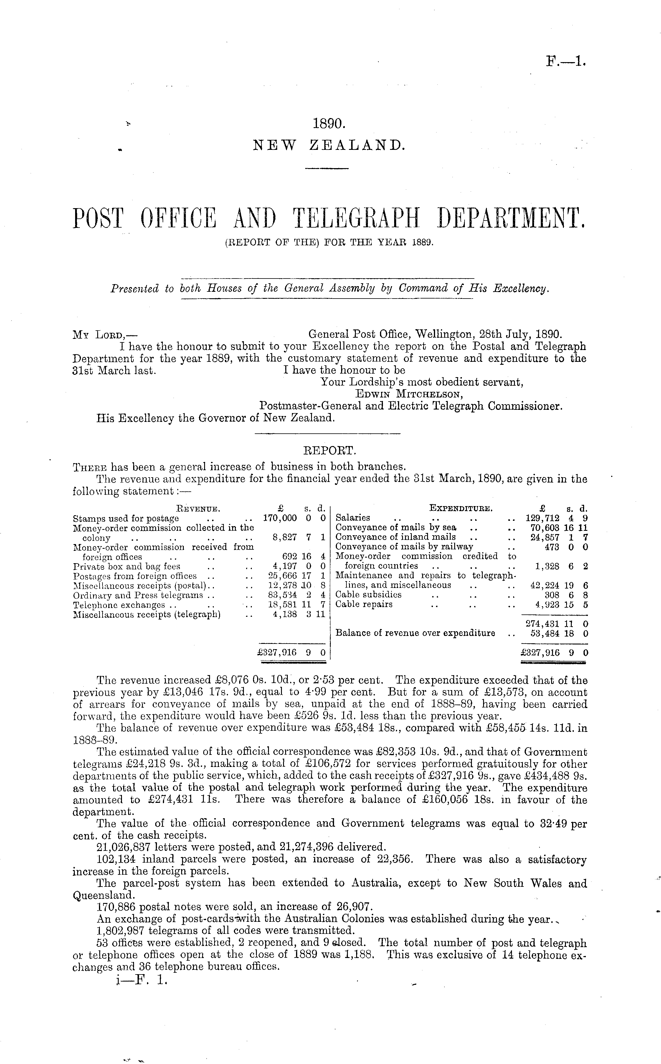 My Lord,— General Post Office, Wellington, 28th July, 1890. I have the honour to submit to your Excellency the report on the Postal and Telegraph Department for the year 1889, with the customary statement of revenue and expenditure to the 31st March last. I have the honour to be Your Lordship's most obedient servant, Edwin Mitchelson, Postmaster-General and Electric Telegraph Commissioner. His Excellency the Governor of New Zealand.