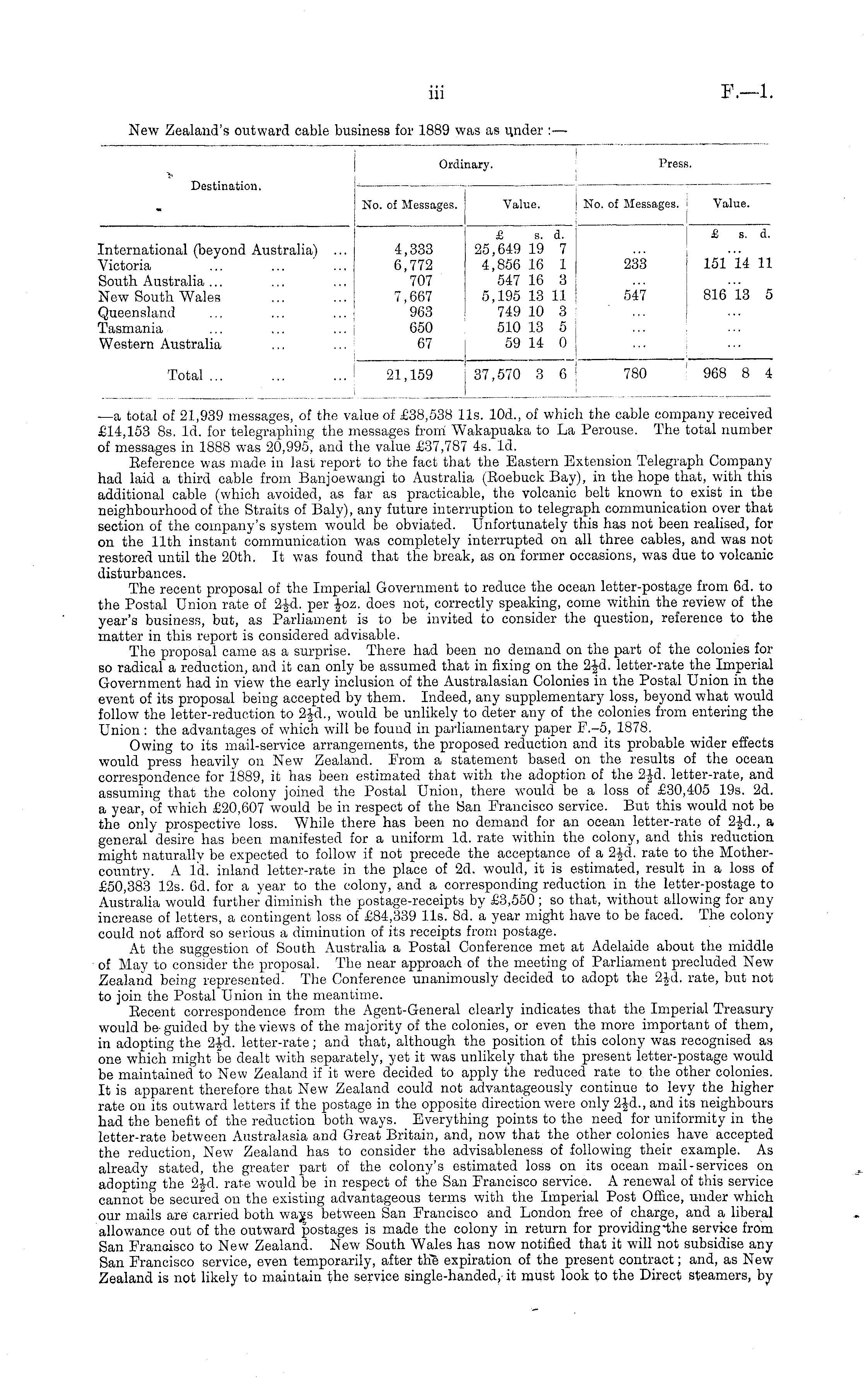 .—a total of 21,939 messages, of the value of £38,538 11s. 10d., of which the cable company received £14,153 Bs. Id. for telegraphing the messages from Wakapuaka to La Perouse. The total number of messages in 1888 was 20,995, and the value £37,787 4s. Id. Eeference was made in last report to the fact that the Eastern Extension Telegraph Company had laid a third cable from Banjoewangi to Australia (Eoebuck Bay), in the hope that, with this additional cable (which avoided, as far as practicable, the volcanic belt known to exist in the neighbourhood of the Straits of Baly), any future interruption to telegraph communication over that section of the company's system would be obviated. Unfortunately this has not been realised, for on the 11th instant communication was completely interrupted on all three cables, and was not restored until the 20th. It was found that the break, as on former occasions, was due to volcanic disturbances. The recent proposal of the Imperial Government to reduce the ocean letter-postage from 6d. to the Postal Union rate of 2^d. per Joz. does not, correctly speaking, come within the review of the year's business, but, as Parliament is to be invited to consider the question, reference to the matter in this report is considered advisable. The proposal came as a surprise. There had been no demand on the part of the colonies for so radical a reduction, and it can only be assumed that in fixing on the 2|d. letter-rate the Imperial Government had in view the early inclusion of the Australasian Colonies in the Postal Union in the event of its proposal being accepted by them. Indeed, any supplementary loss, beyond what would follow the letter-reduction to 2£d., would be unlikely to deter any of the colonies from entering the Union : the advantages of which will be found in parliamentary paper F.-5, 1878. Owing to its mail-service arrangements, the proposed reduction and its probable wider effects would press heavily on New Zealand. From a statement based on the results of the ocean correspondence for 1889, it has been estimated that with the adoption of the 2|d. letter-rate, and assuming that the colony joined the Postal Union, there would be a loss of £30,405 19s. 2d. a year, of which £20,607 would be in respect of the Ban Francisco service. But this would not be the only prospective loss. While there has been no demand for an ocean letter-rate of 2fd., a general desire has been manifested for a uniform Id. rate within the colony, and this reduction might naturally be expected to follow if not precede the acceptance of a 2Jd. rate to the Mothercountry. A Id. inland letter-rate in the place of 2d. would, it is estimated, result in a loss of £50,383 12s. 6d. for a year to the colony, and a corresponding reduction in the letter-postage to Australia would further diminish the postage-receipts by £3,550 ; so that, without allowing for any increase of letters, a contingent loss of £84,339 11s. Bd. a year might have to be faced. The colony could not afford so serious a diminution of its receipts from postage. At the suggestion of South Australia a Postal Conference met at Adelaide about the middle of May to consider the proposal. The near approach of the meeting of Parliament precluded New Zealand being represented. The Conference unanimously decided to adopt the 2-ki. rate, but not to join the Postal Union in the meantime. Eecent correspondence from the Agent-General clearly indicates that the Imperial Treasury would be guided by the views of the majority of the colonies, or even the more important of them, in adopting the 2|d. letter-rate; and that, although the position of this colony was recognised as one which might be dealt with separately, yet it was unlikely that the present letter-postage would be maintained to New Zealand if it were decided to apply the reduced rate to the other colonies. It is apparent therefore that New Zealand could not advantageously continue to levy the higher rate on its outward letters if the postage in the opposite direction were only 2£d., and its neighbours had the benefit of the reduction both ways. Everything points to the need for uniformity in the letter-rate between Australasia and Great Britain, and, now that the other colonies have accepted the reduction, New Zealand has to consider the advisableness of following their example. As already stated, the greater part of the colony's estimated loss on its ocean mail-services on adopting the 2^d. rate would be in respect of the San Francisco service. A renewal of this service cannot be secured on the existing advantageous terms with the Imperial Post Office, under which our mails are carried both ways between San Francisco and London free of charge, and a liberal allowance out of the outward postages is made the colony in return for providing "the service from San Francisco to New Zealand. New South Wales has now notified that it will not subsidise any San Francisco service, even temporarily, after the expiration of the present contract; and, as New Zealand is not likely to maintain the service single-handed, it must look to the Direct steamers, by