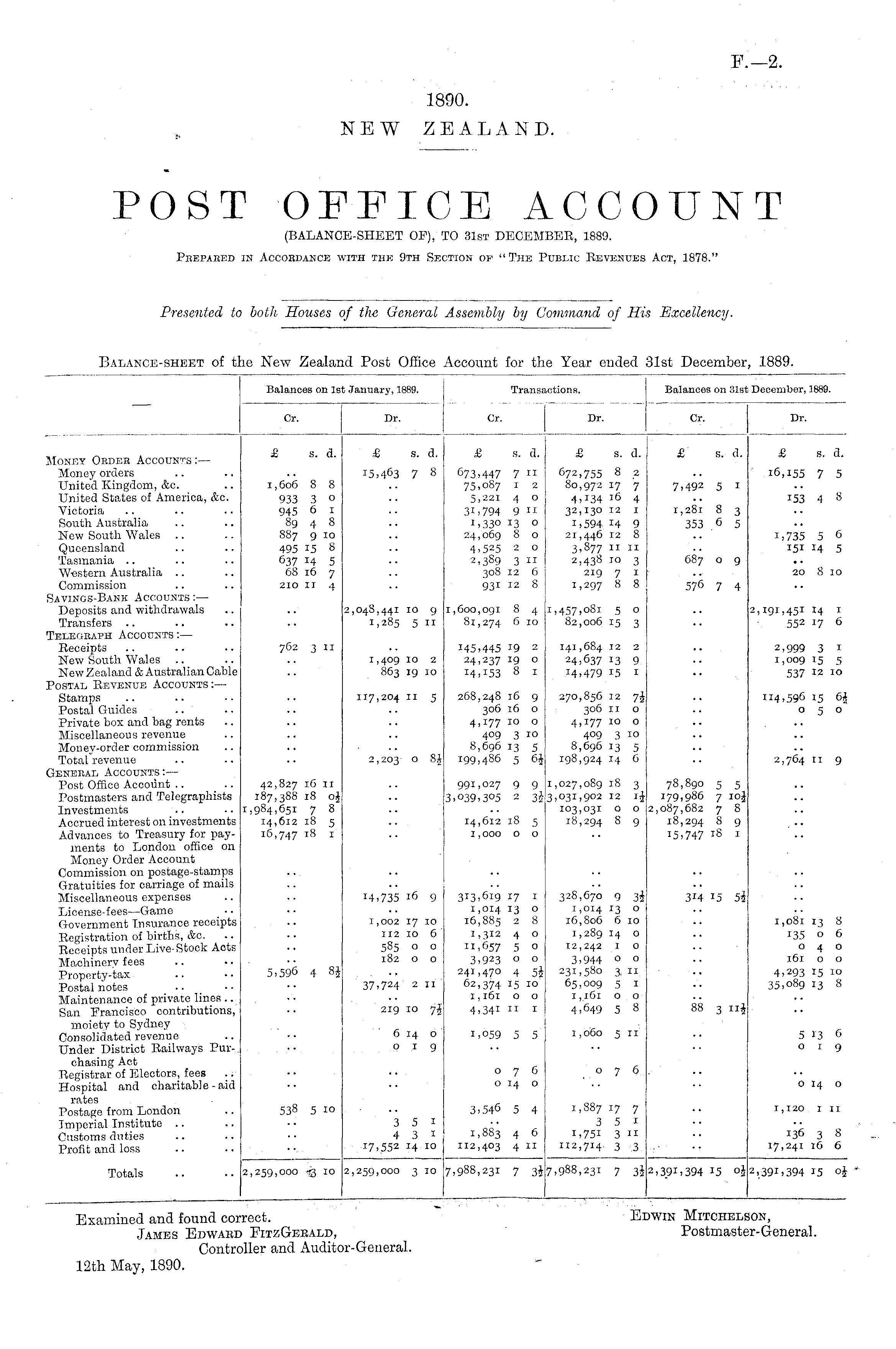 Examined and found correct. Edwin Mitchelson, James Edwaed FitzGeeald, Postmaster-General. Controller and Auditor-General. 12th May, 1890.
