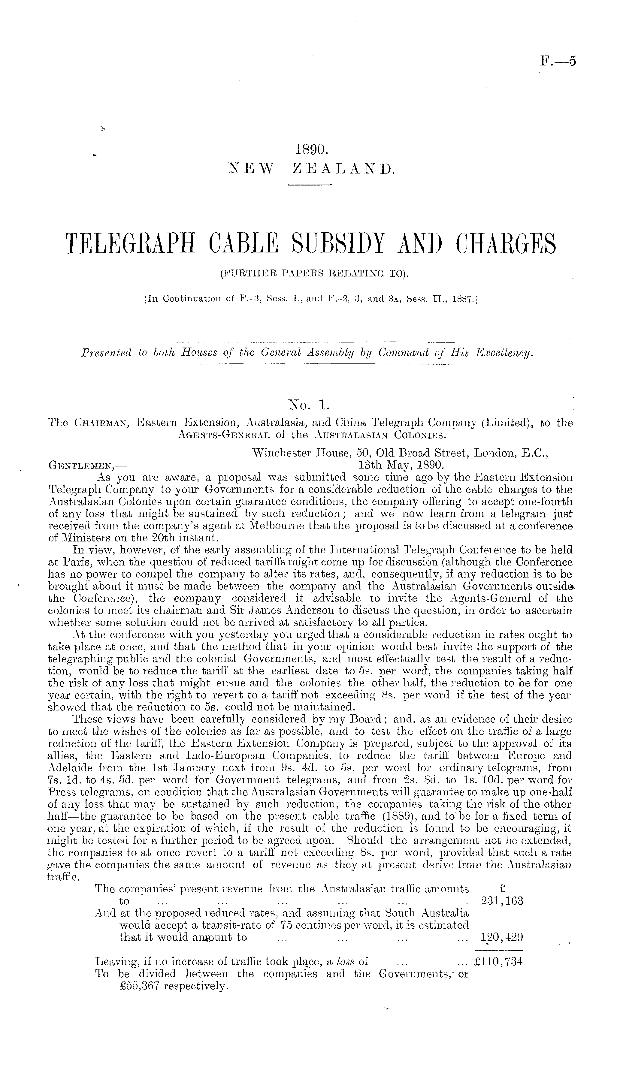 No. 1. The Chairman, Eastern Extension, Australasia, and China Telegraph Company (Limited), to the Agents-General of the Australasian Colonies. Winchester House, 50, Old Broad Street, London, 8.C., Gentlemen,— 13th May, 1890. As you are aware, a proposal was submitted some time ago by the Eastern Extension Telegraph Company to your Governments for a considerable reduction of the cable charges to the Australasian Colonies upon certain guarantee conditions, the company offering to accept one-fourth of any loss that might be sustained by such reduction; and we now learn from a telegram just received from the company's agent at Melbourne that the proposal is to be discussed at a conference of Ministers on the 20th instant. In view, however, of the early assembling of the International Telegraph Conference to be held at Paris, when the question of reduced tariffs might come up for discussion (although the Conference has no power to compel the company to alter its rates, and, consequently, if any reduction is to be brought about it must be made between the company and the Australasian Governments outsidethe Conference), the company considered it advisable to invite the Agents-General of the colonies to meet its chairman and Sir James Anderson to discuss the question, in order to ascertain whether some solution could not be arrived at satisfactory to all parties. At the conference with you yesterday you urged that a considerable reduction in rates ought to take place at once, and that the method that in your opinion would best invite the support of the telegraphing public and the colonial Governments, and most effectually test the result of a reduction, would be to reduce the tariff at the earliest date to ss. per word, the companies taking half the risk of any loss that might ensue and the colonies the other half, the reduction to be for one year certain, with the right to revert to a tariff not exceeding Bs. per word if the test of the year showed that the reduction to ss. could not be maintained. These views have been carefully considered by my Board; and, as an evidence of their desire to meet the wishes of the colonies as far as possible, and to test the effect on the traffic of a large reduction of the tariff, the Eastern Extension Company is prepared, subject to the approval of its allies, the Eastern and Indo-European Companies, to reduce the tariff between Europe and Adelaide from the Ist January next from 9s. 4d. to ss. per word for ordinary telegrams, from 7s. Id. to 4s. sd. per word for Government telegrams, and from 2s. Bd. to Is. lOd. per word for Press telegrams, on condition that the Australasian Governments will guarantee to make up one-half of any loss that may be sustained by such reduction, the companies taking the risk of the other half —the guarantee to be based on the present cable traffic (1889), and to be for a fixed term of one year, at the expiration of which, if the result of the reduction is found to be encouraging, it might be tested for a further period to be agreed upon. Should the arrangement not be extended, the companies to at once revert to a tariff not exceeding Bs. per word, provided that such a rate gave the companies the same amount of revenue as they at present derive from the Australasian traffic. The companies' present revenue from the Australasian traffic amounts £ to ... ... ... ... ... ... 231,163 And at the proposed reduced rates, and assuming that South Australia would accept a transit-rate of 75 centimes per word, it is estimated that it would anjpunt to ... ... ... ... 120,429 Leaving, if no increase of traffic took place, a loss of ... ... £110,734 To be divided between the companies and the Governments, or £55,367 respectively.