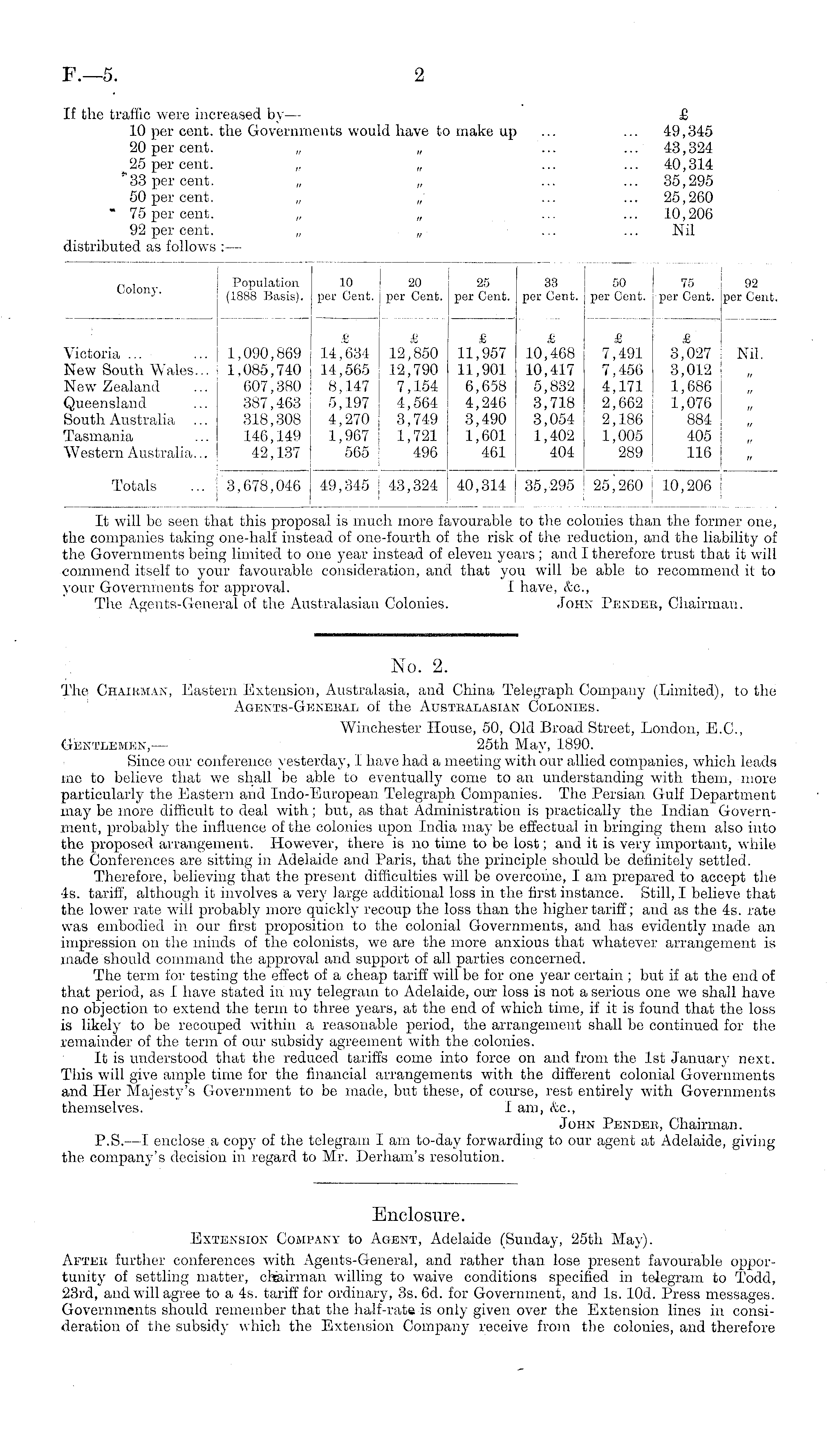 No. 2. The Chairman, Eastern Extension, Australasia, and China Telegraph Company (Limited), to the Agents-Genebal of the Austbalasian Colonies. Winchester House, 50, Old Broad Street, London, E.C., Gentlemen,— 25th May, 1890. Since our conference! yesterday, I have had a meeting with our allied companies, which leads me to believe that we shall be able to eventually come to an understanding with them, more particularly the Eastern and Indo-European Telegraph Companies. The Persian Gulf Department may be more difficult to deal with; but, as that Administration is practically the Indian Government, probably the influence of the colonies upon India may be effectual in bringing them also into the proposed arrangement. However, there is no time to be lost; and it is very important, while the Conferences are sitting in Adelaide and Paris, that the principle should be definitely settled. Therefore, believing that the present difficulties will be overcome, I am prepared to accept the ■Is. tariff, although it involves a very large additional loss in the first instance. Still, I believe that the lower rate will probably more quickly recoup the loss than the higher tariff; and as the 4s. rate was embodied in our first proposition to the colonial Governments, and has evidently made an impression on the minds of the colonists, we are the more anxious that whatever arrangement is made should command the approval and support of all parties concerned. The term for testing the effect of a cheap tariff will be for one year certain ; but if at the end of that period, as I have stated in my telegram to Adelaide, our loss is not a serious one we shall have no objection to extend the term to three years, at the end of which time, if it is found that the loss is likely to be recouped within a reasonable period, the arrangement shall be continued for the remainder of the term of our subsidy agreement with the colonies. It is understood that the reduced tariffs come into force on and from the Ist January next. This will give ample time for the financial arrangements with the different colonial Governments and Her Majesty's Government to be made, but these, of course, rest entirely with Governments themselves. I am, &c, John Pendee, Chairman. P.S. —I enclose a copy of the telegram lam to-day forwarding to our agent at Adelaide, giving the company's decision in regard to Mr. Derham's resolution.
