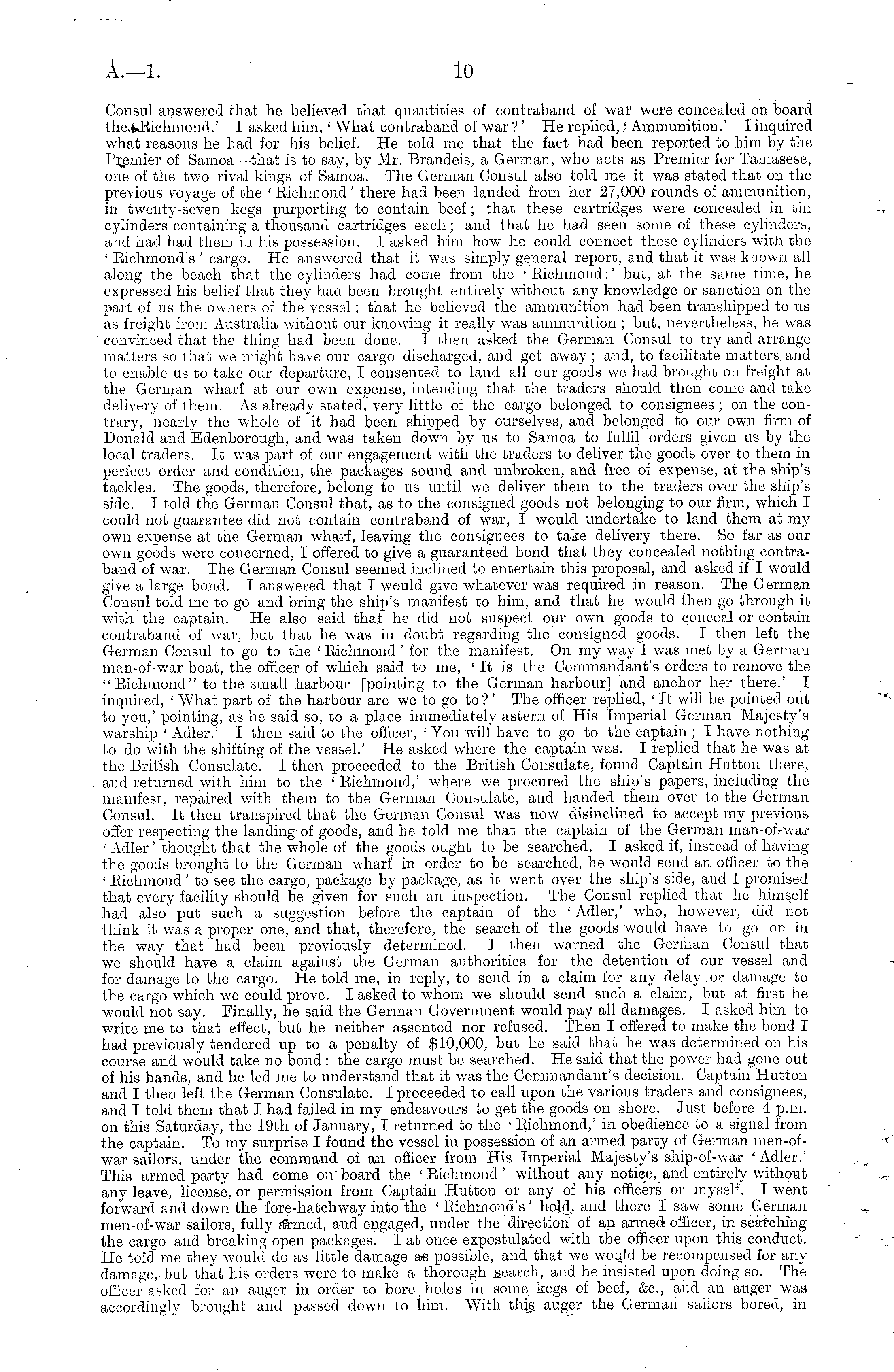 Consul answered that he believed that quantities of contraband of war were concealed on board the.kßichmond.' I asked him, ' What contraband of war ?' He replied,' Ammunition.' I inquired what reasons he had for his belief. He told me that the fact had been reported to him by the Premier of Samoa —that is to say, by Mr. Brandeis, a German, who acts as Premier for Tamasese, one of the two rival kings of Samoa. The German Consul also told me it was stated that on the previous voyage of the 'Richmond' there had been landed from her 27,000 rounds of ammunition, in twenty-seven kegs purporting to contain beef; that these cartridges were concealed in tin cylinders containing a thousand cartridges each; and that he had seen some of these cylinders, and had had them in his possession. I asked him how he could connect these cylinders with the ' Richmond's ' cargo. He answered that it was simply general report, and that it was known all along the beach that the cylinders had come from the ' Richmond;' but, at the same time, he expressed his belief that they had been brought entirely without any knowledge or sanction on the part of us the owners of the vessel; that he believed the ammunition had been transhipped to us as freight from Australia without our knowing it really was ammunition ; but, nevertheless, he was convinced that the thing had been done. 1 then asked the German Consul to try and arrange matters so that we might have our cargo discharged, and get away ; and, to facilitate matters and to enable us to take our departure, I consented to land all our goods we had brought on freight at the German wharf at our own expense, intending that the traders should then come and take delivery of them. As already stated, very little of the cargo belonged to consignees ;on the contrary, nearly the whole of it had been shipped by ourselves, and belonged to our own firm of Donald and Edenborough, and was taken down by us to Samoa to fulfil orders given us by the local traders. It was part of our engagement with the traders to deliver the goods over to them in perfect order and condition, the packages sound and unbroken, and free of expense, at the ship's tackles. The goods, therefore, belong to us until we deliver them to the traders over the ship's side. I told the German Consul that, as to the consigned goods not belonging to our firm, which I could not guarantee did not contain contraband of war, I would undertake to land them at my own expense at the German wharf, leaving the consignees to. take delivery there. So far as our own goods were concerned, I offered to give a guaranteed bond that they concealed nothing contraband of war. The German Consul seemed inclined to entertain this proposal, and asked if I would give a large bond. I answered that I would give whatever was required in reason. The German Consul told me to go and bring the ship's manifest to him, and that he would then go through it with the captain. He also said that he did not suspect our own goods to conceal or contain contraband of war, but that he was in doubt regarding the consigned goods. I then left the German Consul to go to the ' Richmond ' for the manifest. On my way I was met by a German man-of-war boat, the officer of which said to me, ' It is the Commandant's orders to remove the "Richmond" to the small harbour [pointing to the German harbour] and anchor her there.' I inquired, ' What part of the harbour are we to go to ? ' The officer replied, 'It will be pointed out to you,' pointing, as he said so, to a place immediately astern of His Imperial German Majesty's warship ' Adler.' I then said to the officer, ' You will have to go to the captain ; I have nothing to do with the shifting of the vessel.' He asked where the captain was. I replied that he was at the British Consulate. I then proceeded to the British Consulate, found Captain Hutton there, and returned with him to the ' Richmond,' where we procured the ship's papers, including the manifest, repaired with them to the German Consulate, and handed them over to the German Consul. It then transpired that the German Consul was now disinclined to accept my previous offer respecting the landing of goods, and he told me that the captain of the German man-of-war ' Adler' thought that the whole of the goods ought to be searched. I asked if, instead of having the goods brought to the German wharf in order to be searched, he would send an officc;r to the ' Richmond' to see the cargo, package by package, as it went over the ship's side, and I promised that every facility should be given for such an inspection. The Consul replied that he himself had also put such a suggestion before the captain of the ' Adler,' who, however, did not think it was a proper one, and that, therefore, the search of the goods would have to go on in the way that had been previously determined. I then warned the German Consul that we should have a claim against the German authorities for the detention of our vessel and for damage to the cargo. He told me, in reply, to send in a claim for any delay or damage to the cargo which we could prove. I asked to whom we should send such a claim, but at first he would not say. Finally, he said the German Government would pay all damages. I asked him to write me to that effect, but he neither assented nor refused. Then I offered to make the bond I had previously tendered up to a penalty of $10,000, but he said that he was determined on his course and would take no bond : the cargo must be searched. He said that the power had gone out of his hands, and he led me to understand that it was the Commandant's decision. Captain Hutton and I then left the German Consulate. I proceeded to call upon the various traders and consignees, and I told them that I had failed in my endeavours to get the goods on shore. Just before 4 p.m. on this Saturday, the 19th of January, I returned to the ' Richmond,' in obedience to a signal from the captain. To my surprise I found the 