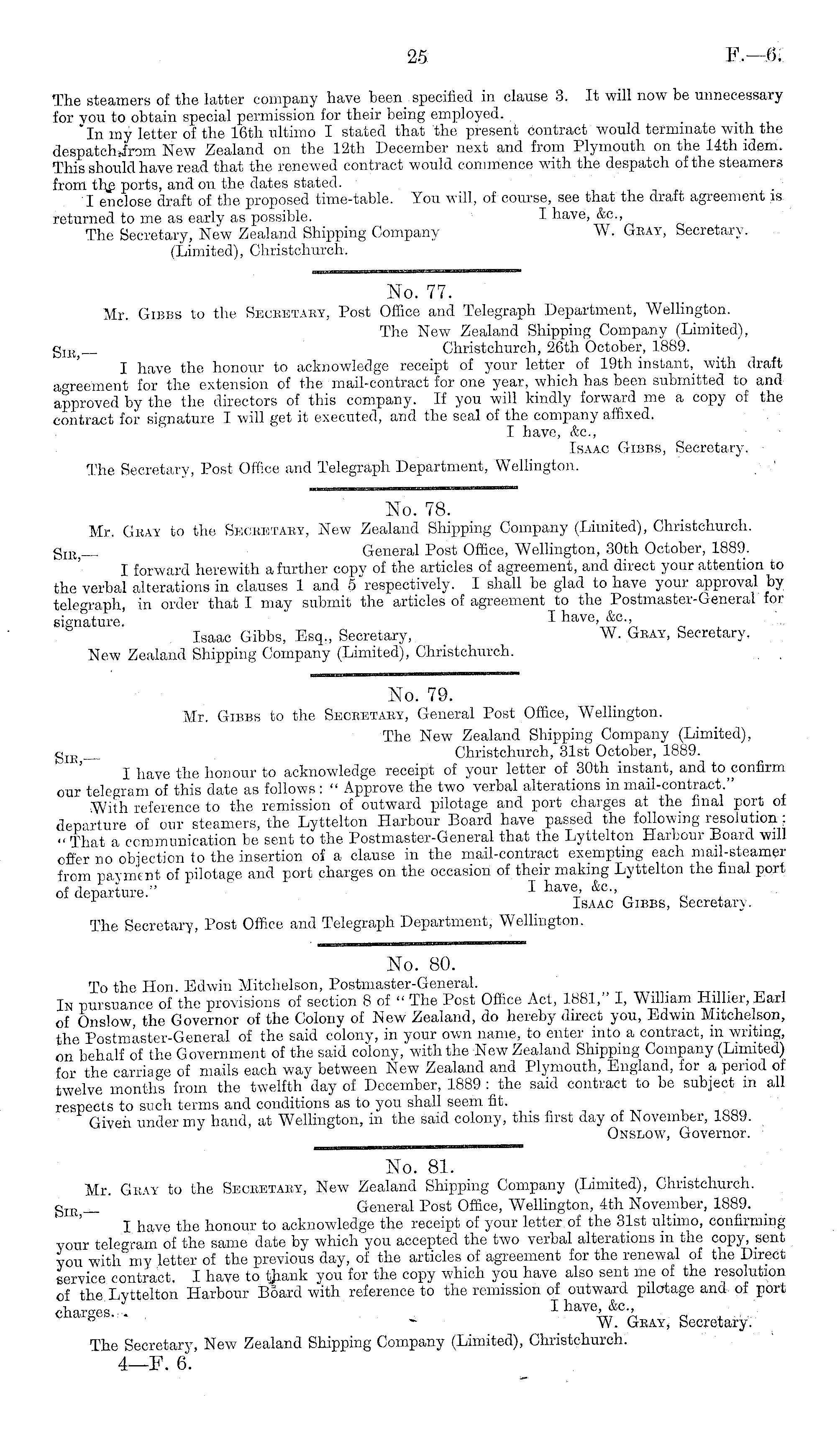 No. 80. To the Hon. Edwin Mitchelson, Postmaster-General. In pursuance of the provisions of section 8 of " The Post Office Act, 1881," I, William Hilher, Earl of Onslow, the Governor of the Colony of New Zealand, do hereby direct you, Edwin Mitchelson, the Postmaster-General of the said colony, in your own name, to enter into a contract, m writing, on behalf of the Government of the said colony, with the New Zealand Shipping Company (Limited) for the carriage of mails each way between New Zealand and Plymouth, England, for a period of: twelve months from the twelfth day of December, 1889 : the said contract to be subject m all respects to such terms and conditions as to you shall seem fit. Given under my hand, at Wellington, in the said colony, this first day of November, 1889. Onslow, Governor.