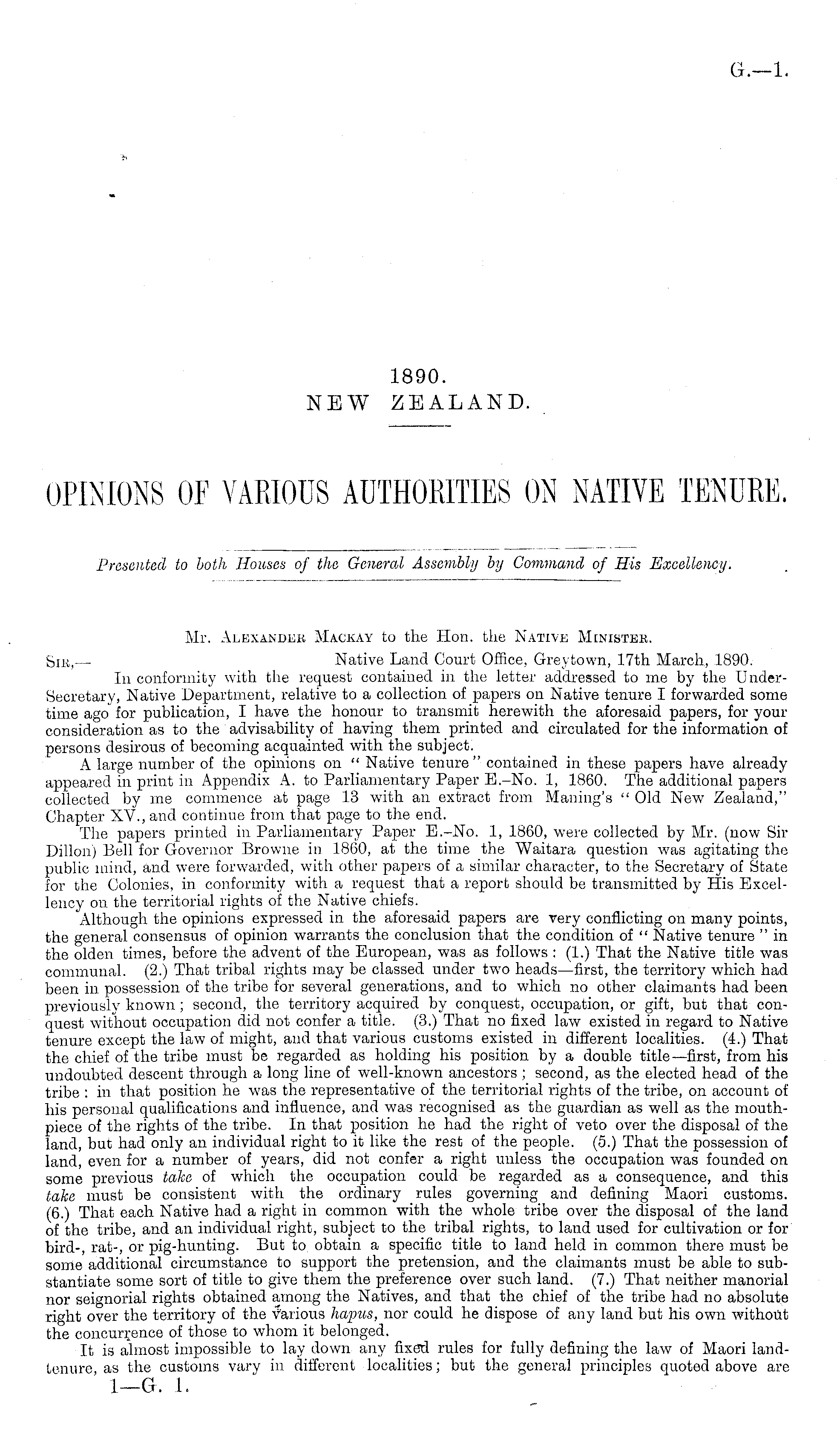 Mr. Alexander Mackay to the Hon. the Native Minister. Sib.,-— Native Land Court Office, Greytown, 17th March, 1890. In conformity with the request contained in the letter addressed to me by the UnderSecretary, Native Department, relative to a collection of papers on Native tenure I forwarded some time ago for publication, I have the honour to transmit herewith the aforesaid papers, for your consideration as to the advisability of having them printed and circulated for the information of persons desirous of becoming acquainted with the subject. A large number of the opinions on " Native tenure" contained in these papers have already appeared in print in Appendix A. to Parliamentary Paper 8.-No. 1, 1860. The additional papers collected by me commence at page 13 with an extract from Mailing's " Old New Zealand," Chapter XV., and continue from that page to the end. The papers printed in Parliamentary Paper E.-No. 1, 1860, were collected by Mr. (now Sir Dillon) Bell for Governor Browne in 1860, at the time the Waitara question was agitating the public mind, and were forwarded, with other papers of a similar character, to the Secretary of State for the Colonies, in conformity with a request that a report should be transmitted by His Excellency on the territorial rights of the Native chiefs. Although the opinions expressed in the aforesaid papers are very conflicting on many points, the general consensus of opinion warrants the conclusion that the condition of " Native tenure " in the olden times, before the advent of the European, was as follows : (1.) That the Native title was communal. (2.) That tribal rights may be classed under two heads—first, the territory which had been in possession of the tribe for several generations, and to which no other claimants had been previously known ; second, the territory acquired by conquest, occupation, or gift, but that conquest without occupation did not confer a title. (3.) That no fixed law existed in regard to Native tenure except the law of might, and that various customs existed in different localities. (4.) That the chief of the tribe must be regarded as holding his position by a double title—first, from his undoubted descent through a long line of well-known ancestors ; second, as the elected head of the tribe : in that position he was the representative of the territorial rights of the tribe, on account of his personal qualifications and influence, and was recognised as the guardian as well as the mouthpiece of the rights of the tribe. In that position he had the right of veto over the disposal of the land, but had only an individual right to it like the rest of the people. (5.) That the possession of land, even for a number of years, did not confer a right unless the occupation was founded on some previous take of which the occupation could be regarded as a consequence, and this take must be consistent with the ordinary rules governing and defining Maori customs. (6.) That each Native had a right in common with the whole tribe over the disposal of the land of the tribe, and an individual right, subject to the tribal rights, to land used for cultivation or for bird-, rat-, or pig-hunting. But to obtain a specific title to land held in common there must be some additional circumstance to support the pretension, and the claimants must be able to substantiate some sort of title to give them the preference over such land. (7.) That neither manorial nor seignorial rights obtained among the Natives, and that the chief of the tribe had no absolute right over the territory of the Various haptis, nor could he dispose of any land but his own without the concurrence of those to whom it belonged. It is almost impossible to lay down any fixed rules for fully defining the law of Maori landtenure, as the customs vary in different localities; but the general principles quoted above are I—G. 1.