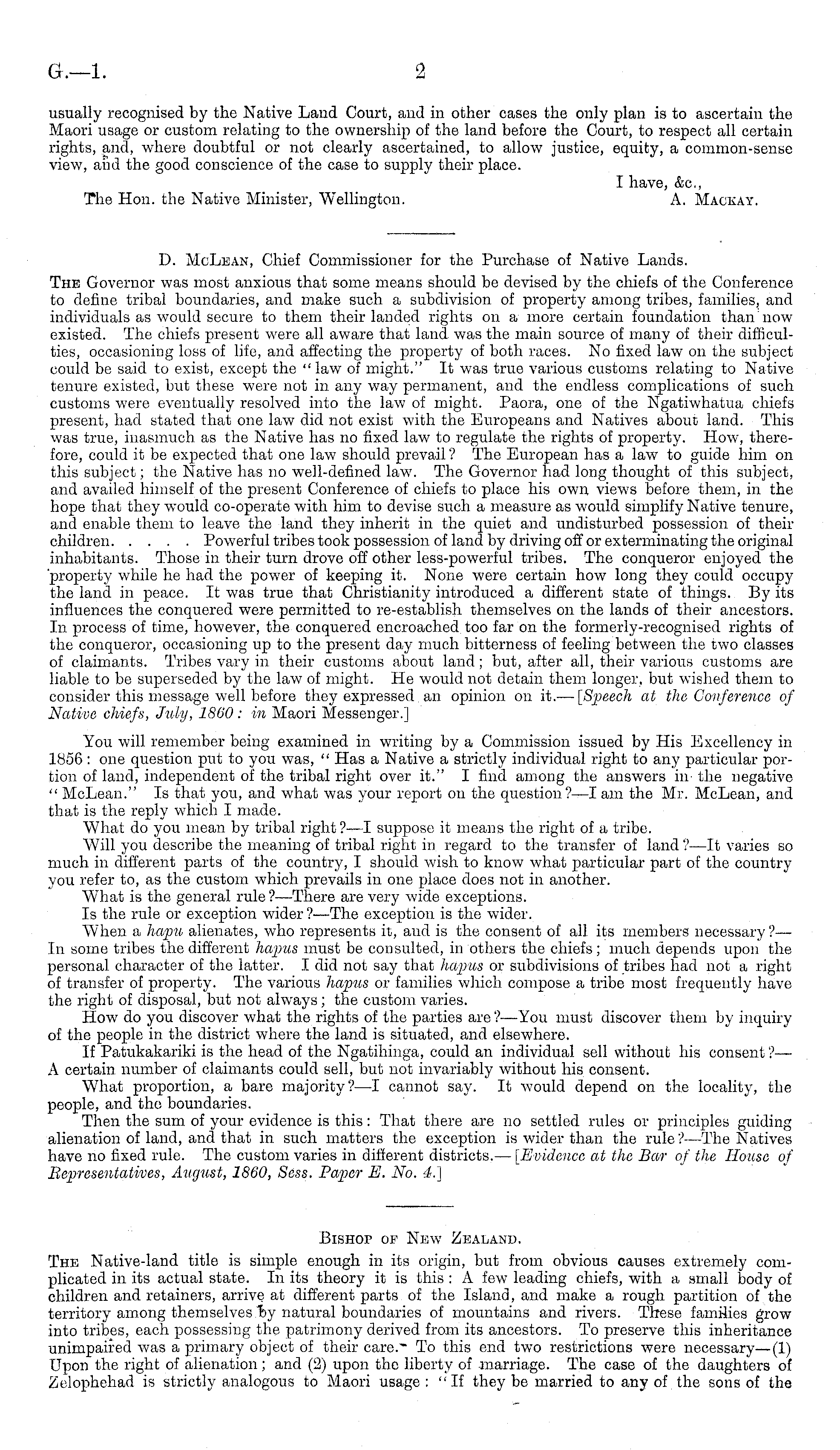 D. McLean, Chief Commissioner for the Purchase of Native Lands. The Governor was most anxious that some means should be devised by the chiefs of the Conference to define tribal boundaries, and make such a subdivision of property among tribes, families, and individuals as would secure to them their landed rights on a more certain foundation than now existed. The chiefs present were all aware that land was the main source of many of their difficulties, occasioning loss of life, and affecting the property of both races. No fixed law on the subject could be said to exist, except the " law of might." It was true various customs relating to Native tenure existed, but these were not in any way permanent, and the endless complications of such customs were eventually resolved into the law of might. Paora, one of the Ngatiwhatua chiefs present, had stated that one law did not exist with the Europeans and Natives about land. This was true, inasmuch as the Native has no fixed law to regulate the rights of property. How, therefore, could it be expected that one law should prevail ? The European has a law to guide him on this subject; the Native has no well-defined law. The Governor had long thought of this subject, and availed himself of the present Conference of chiefs to place his own views before them, in the hope that they would co-operate with him to devise such a measure as would simplify Native tenure, and enable them to leave the land they inherit in the quiet and undisturbed possession of their children Powerful tribes took possession of land by driving off or exterminating the original inhabitants. Those in their turn drove off other less-powerful tribes. The conqueror enjoyed the property while he had the power of keeping it. None were certain how long they could occupy the land in peace. It was true that Christianity introduced a different state of things. By its influences the conquered were permitted to re-establish themselves on the lands of their ancestors. In process of time, however, the conquered encroached too far on the formerly-recognised rights of the conqueror, occasioning up to the present day much bitterness of feeling between the two classes of claimants. Tribes vary in their customs about land; but, after all, their various customs are liable to be superseded by the law of might. Pie would not detain them longer, but wished them to consider this message well before they expressed an opinion on it.— [Speech at the Conference of Native chiefs, July, 1860: in Maori Messenger.] You will remember being examined in writing by a Commission issued by His Excellency in 1856 : one question put to you was, " Has a Native a strictly individual right to any particular portion of land, independent of the tribal right over it." I find among the answers ill' the negative " McLean." Is that you, and what was your report on the question ?—I am the Mr. McLean, and that is the reply which I made. What do you mean by tribal right ? —I suppose it means the right of a tribe. Will you describe the meaning of tribal right in regard to the transfer of land ?—lt varies so much in different parts of the country, I should wish to know what particular part of the country you refer to, as the custom which prevails in one place does not in another. What is the general rule ?—There are very wide exceptions. Is the rule or exception wider?— The exception is the wider. When a hapu alienates, who represents it, and is the consent of all its members necessary ?— In some tribes the different hapus must be consulted, in others the chiefs; much depends upon the personal character of the latter. I did not say that hapits or subdivisions of tribes had not a right of transfer of property. The various hapus or families which compose a tribe most frequently have the right of disposal, but not always; the custom varies. How do you discover what the rights of the parties are ?—You must discover them by inquiry of the people in the district where the land is situated, and elsewhere. If Patukakariki is the head of the Ngatihinga, could an individual sell without his consent ?— A certain number of claimants could sell, but not invariably without his consent. What proportion, a bare majority? —I cannot say. It would depend on the locality, the people, and the boundaries. Then the sum of your evidence is this: That there are no settled rules or principles guiding alienation of land, and that in such matters the exception is wider than the rule ?—The Natives have no fixed rule. The custom varies in different districts.— [Evidence at the Bar of the House of Representatives, August, 1860, Sess. Paper E. No. -J.]