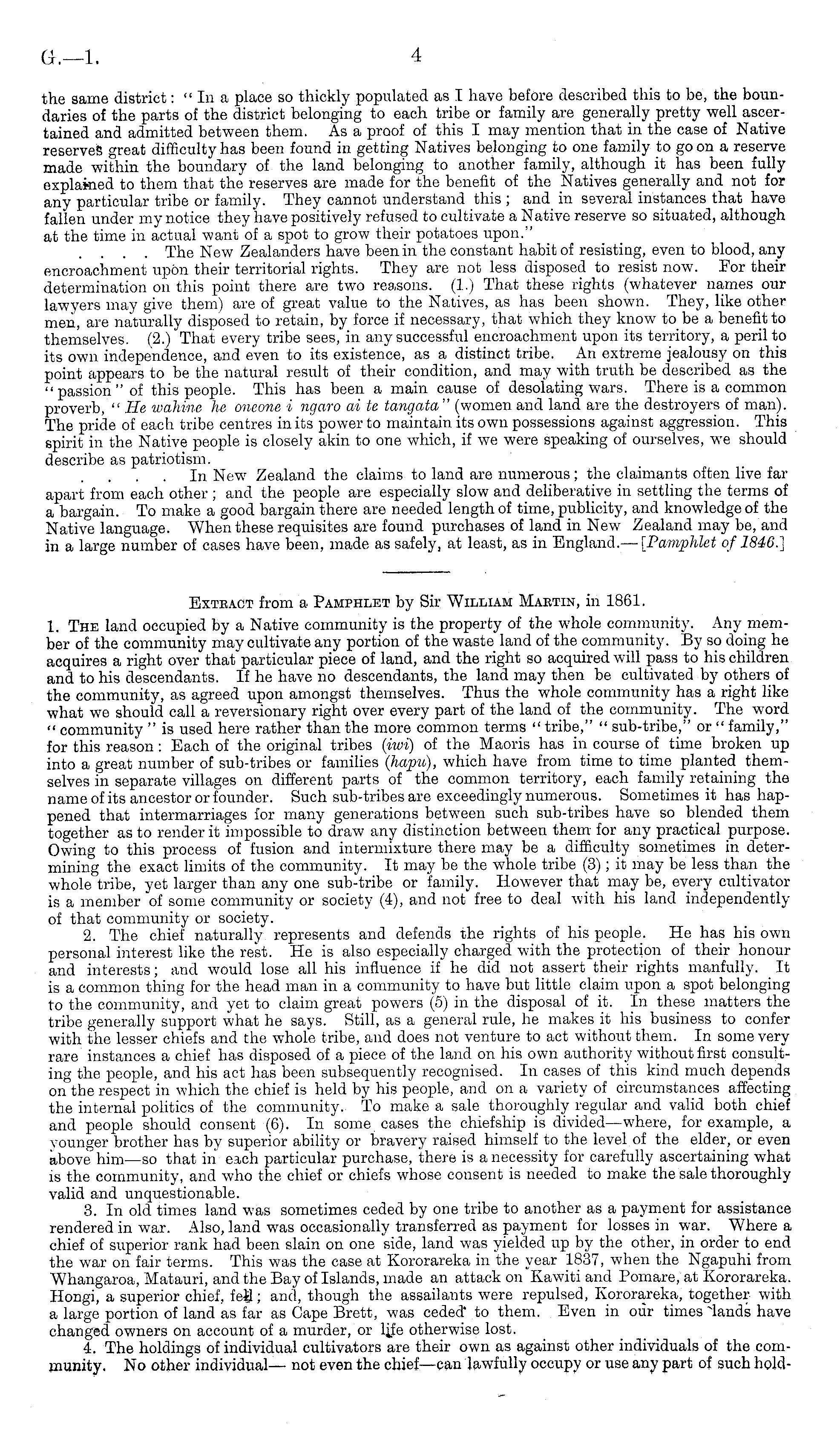 Extbact from a Pamphlet by Sir William Maetin, in 1861. 1. The land occupied by a Native community is the property of the whole community. Any member of the community may cultivate any portion of the waste land of the community. By so doing he acquires a right over that particular piece of land, and the right so acquired wall pass to his children and to his descendants. If he have no descendants, the land may then be cultivated by others of the community, as agreed upon amongst themselves. Thus the whole community has a right like what we should call a reversionary right over every part of the land of the community. The word " community " is used here rather than the more common terms " tribe," " sub-tribe," or " family," for this reason: Each of the original tribes (iwi) of the Maoris has in course of time broken up into a great number of sub-tribes or families (hapu), which have from time to time planted themselves in separate villages on different parts of the common territory, each family retaining the name of its ancestor or founder. Such sub-tribes are exceedingly numerous. Sometimes it has happened that intermarriages for many generations between such sub-tribes have so blended them together as to render it impossible to draw any distinction between them for any practical purpose. Owing to this process of fusion and intermixture there may be a difficulty sometimes in determining the exact limits of the community. It may be the whole tribe (3); it may be less than the whole tribe, yet larger than any one sub-tribe or family. However that may be, every cultivator is a member of some community or society (4), and not free to deal with his land independently of that community or society. 2. The chief naturally represents and defends the rights of his people. He has his own personal interest like the rest. He is also especially charged with the protection of their honour and interests; and would lose all his influence if he did not assert their rights manfully. It is a common thing for the head man in a community to have but little claim upon a spot belonging to the community, and yet to claim great powers (5) in the disposal of it. In these matters the tribe generally support what he says. Still, as a general rule, he makes it his business to confer with the lesser chiefs and the whole tribe, and does not venture to act without them. In some very rare instances a chief has disposed of a piece of the land on his own authority without first consulting the people, and his act has been subsequently recognised. In cases of this kind much depends on the respect in which the chief is held by his people, and on a variety of circumstances affecting the internal politics of the community. To make a sale thoroughly regular and valid both chief and people should consent (6). In some cases the chiefship is divided—where, for example, a younger brother has by superior ability or bravery raised himself to the level of the elder, or even above him—so that in each particular purchase, there is a necessity for carefully ascertaining what is the community, and who the chief or chiefs whose consent is needed to make the sale thoroughlyvalid and unquestionable. 3. In old times land was sometimes ceded by one tribe to another as a payment for assistance rendered in war. Also, land was occasionally transferred as payment for losses in war. Where a chief of superior rank had been slain on one side, land was yielded up by the other, in order to end the war on fair terms. This was the case at Kororareka in the year 1837, when the Ngapuhi from Whangaroa, Matauri, and the Bay of Islands, made an attack on Kawiti and Pomare, at Kororareka. Hongi, a superior chief, fell; and, though the assailants were repulsed, Kororareka, together with a large portion of land as far as Cape Brett, was ceded" to them. Even in our times "lands have changed owners on account of a murder, or life otherwise lost. 4. The holdings of individual cultivators are their own as against other individuals of the community. No other individual — not even the chicf —can lawfully occupy or use any part of such hold-