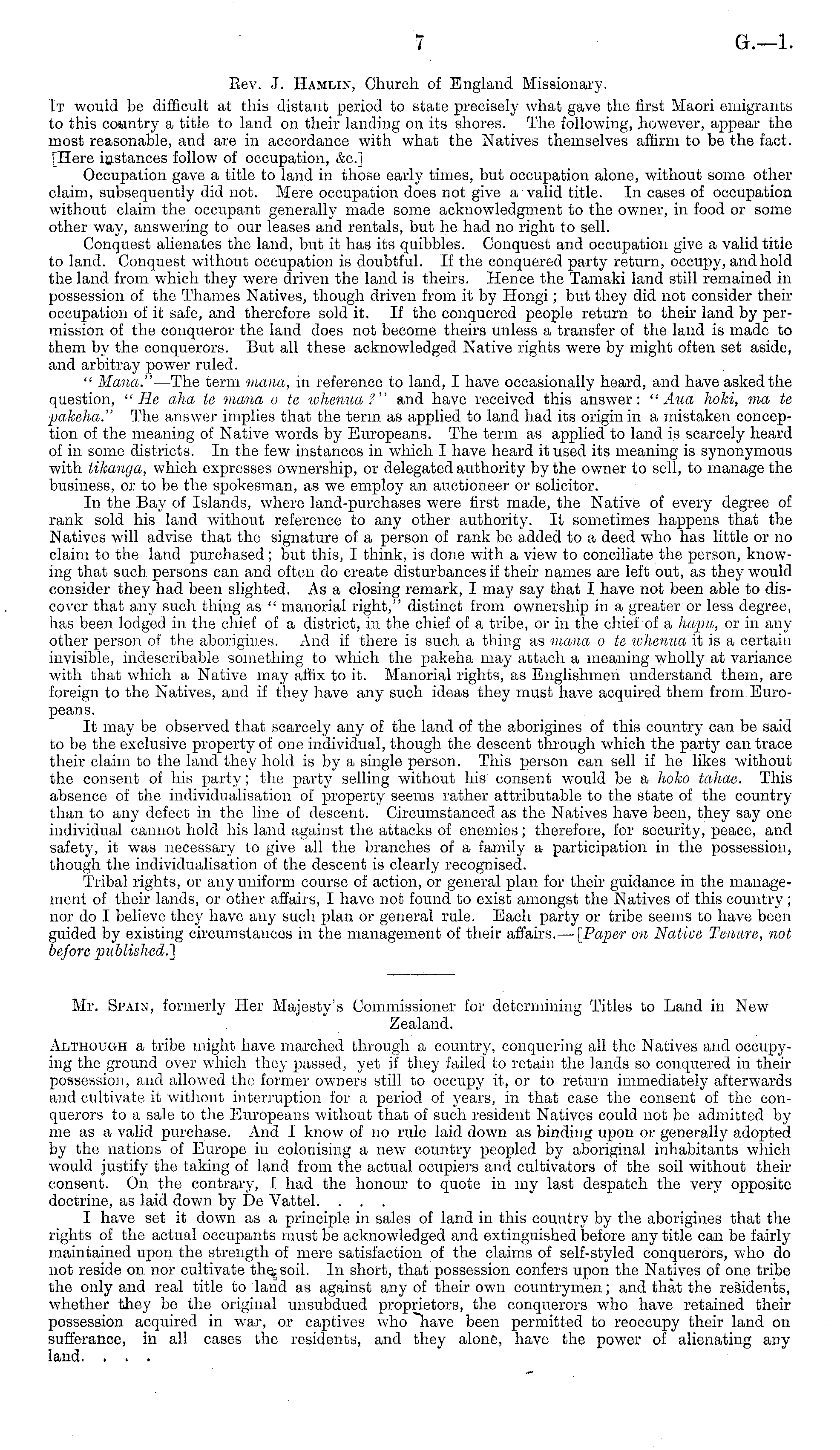 Rev. J. Hamlin, Church of England Missionary. It would be difficult at this distant period to state precisely what gave the first Maori emigrants to this country a title to land on their landing on its shores. The following, however, appear the most reasonable, and are in accordance with what the Natives themselves affirm to be the fact. [Here instances follow of occupation, &c] Occupation gave a title to land in those early times, but occupation alone, without some other claim, subsequently did not. Mere occupation does not give a valid title. In cases of occupation without claim the occupant generally made some acknowledgment to the owner, in food or some other way, answering to our leases and rentals, but he had no right to sell. Conquest alienates the land, but it has its quibbles. Conquest and occupation give a valid title to land. Conquest without occupation is doubtful. If the conquered party return, occupy, and hold the land from which they were driven the land is theirs. Hence the Tamaki land still remained in possession of the Thames Natives, though driven from it by Hongi; but they did not consider their occupation of it safe, and therefore sold it. If the conquered people return to their land by permission of the conqueror the laud does not become theirs unless a transfer of the land is made to them by the conquerors. But all these acknowledged Native rights were by might often set aside, and arbitray power ruled. " Manet." —The term mana, in reference to land, I have occasionally heard, and have asked the question, "He aha te mana o tew hernia ?" and have received this answer: " Aua hoki, ma te pakeha." The answer implies that the term as applied to land had its origin in a mistaken conception of the meaning of Native words by Europeans. The term as applied to land is scarcely heard of in some districts. In the few instances in which I have heard it used its meaning is synonymous with tikanga, which expresses ownership, or delegated authority by the owner to sell, to manage the business, or to be the spokesman, as we employ an auctioneer or solicitor. In the Bay of Islands, where land-purchases were first made, the Native of every degree of rank sold his laud without reference to any other authority. It sometimes happens that the Natives will advise that the signature of a person of rank be added to a deed who has little or no claim to the land purchased ; but this, I think, is done with a view to conciliate the person, knowing that such persons can and often do create disturbances if their names are left out, as they would consider they had been slighted. As a closing remark, I may say that I have not been able to discover that any such thing as " manorial right," distinct from ownership in a greater or less degree, has been lodged in the chief of a district, in the chief of a tribe, or in the chief of a hapu, or in any other person of the aborigines. And if there is such a thing as mana ote wheuua it is a certain invisible, indescribable something to which the pakeha may attach a meaning wholly at variance with that which a Native may affix to it. Manorial rights, as Englishmen understand them, are foreign to the Natives, and if they have any such ideas they must have acquired them from Europeans. It may be observed that scarcely any of the land of the aborigines of this country can be said to be the exclusive property of one individual, though the descent through which the party can trace their claim to the land they hold is by a single person. This person can sell if he likes without the consent of his party; the party selling without his consent would be a hoko tahae. This absence of the individualisation of property seems rather attributable to the state of the country than to any defect in the line of descent. Circumstanced as the Natives have been, they say one individual cannot hold his land against the attacks of enemies; therefore, for security, peace, and safety, it was necessary to give all the branches of a family a participation in the possession, though the individualisation of the descent is clearly recognised. Tribal rights, or any uniform course of action, or general plan for their guidance in the management of their lands, or other affairs, I have not found to exist amongst the Natives of this country ; nor do I believe they have any such plan or general rule. Each party or tribe seems to have been guided by existing circumstances in the management of their affairs.— [Paper on Native Tenure, not before published.]