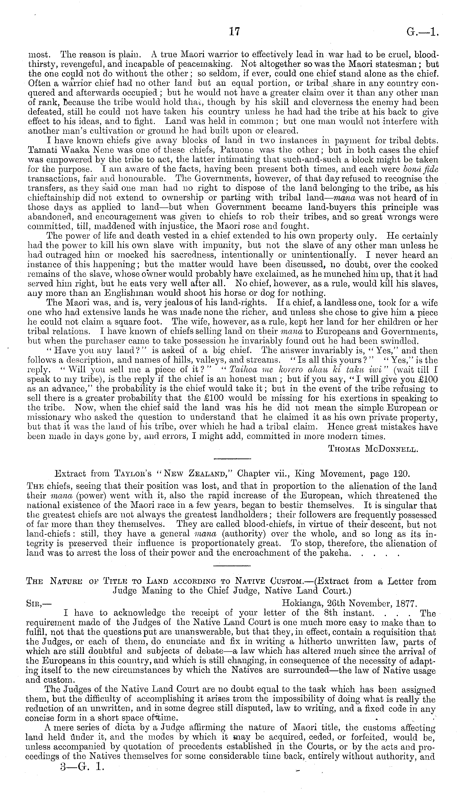 The Natuee of Title to Land acooeding to Native Custom. —(Extract from a Letter from Judge Mailing to the Chief Judge, Native Land Court.) Sic, — Hokianga, 26th November, 1877. I have to acknowledge the receipt of your letter of the Bth instant. . . . The requirement made of the Judges of the Native Land Court is one much more easy to make than to fulfil, not that the questions put are unanswerable, but that they, in effect, contain a requisition that the Judges, or each of them, do enunciate and fix in writing a hitherto unwritten law, parts of which are still doubtful and subjects of debate—a law which has altered much since the arrival of the Europeans in this country, and which is still changing, in consequence of the necessity of adapting itself to the new circumstances by which the Natives are surrounded—the law of Native usage and custom. The Judges of the Native Land Court are no doubt equal to the task which has been assigned them, but the difficulty of accomplishing it arises trom the impossibility of doing what is really the reduction of an unwritten, and in some degree still disputed, law to writing, and a fixed code in any concise form in a short space of'time. A mere series of dicta by a Judge affirming the nature of Maori title, the customs affecting land held rmder it, and the modes by which it may be acquired, ceded, or forfeited, would be, unless accompanied by quotation of precedents established in the Courts, or by the acts and proceedings of the Natives themselves for some considerable time back, entirely without authority, and 3—G. 1.