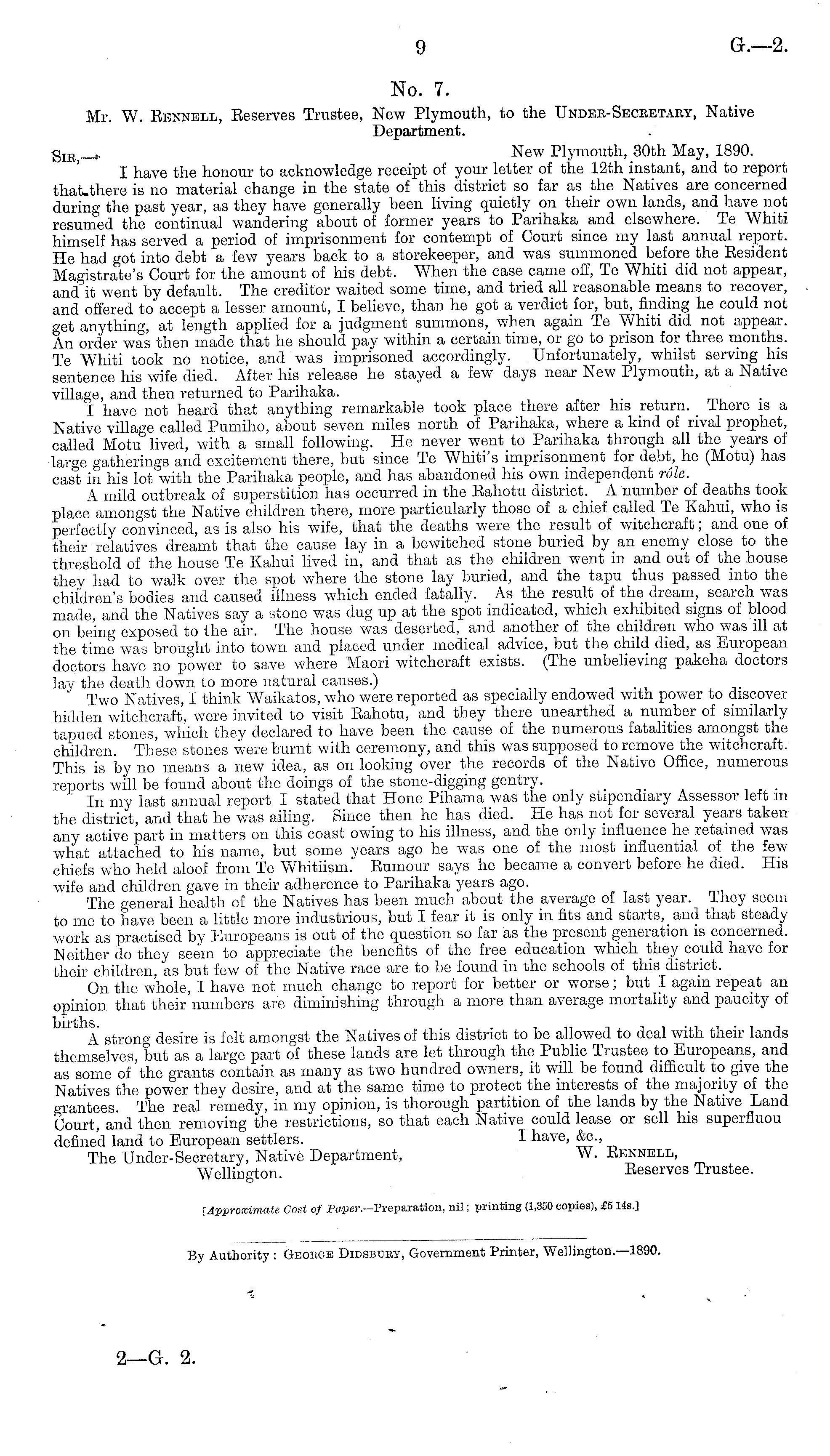 No. 7. Mr. W. Eennell, Eeserves Trustee, New Plymouth, to the Undee-Seceetaey, Native Department. g IB _» New Plymouth, 30th May, 1890. I have the honour to acknowledge receipt of your letter of the 12th instant, and to report that-there is no material change in the state of this district so far as the Natives are concerned during the past year, as they have generally been living quietly on their own lands, and have not resumed the continual wandering about of former years to Parihaka and elsewhere. Te Whiti himself has served a period of imprisonment for contempt of Court since my last annual report. He had got into debt a few years back to a storekeeper, and was summoned before the Eesident Magistrate's Court for the amount of his debt. When the case came off, Te Whiti did not appear, and"it went by default. The creditor waited some time, and tried all reasonable means to recover, and offered to accept a lesser amount, I believe, than he got a verdict for, but, finding he could not get anything, at length applied for a judgment summons, when again Te Whiti did not appear. An order was then made that he should pay within a certain time, or go to prison for three nionths. Te Whiti took no notice, and was imprisoned accordingly. Unfortunately, whilst serving his sentence his wife died. After his release he stayed a few days near New Plymouth, at a Native village, and then returned to Parihaka. I have not heard that anything remarkable took place there after his return. Ihere is a Native village called Pumiho, about seven miles north of Parihaka, where a kind of rival prophet, called Motu lived, with a small following. He never went to Parihaka through all the years of large gatherings and excitement there, but since Te Whiti's imprisonment for debt, he (Motu) has cast in his lot with the Parihaka people, and has abandoned his own independent rob. A mild outbreak of superstition has occurred in the Eahotu district. A number of deaths took place amongst the Native children there, more particularly those of a chief called Te Kahui, who is perfectly convinced, as is also his wife, that the deaths were the result of witchcraft; and one of their relatives dreamt that the cause lay in a bewitched stone buried by an enemy close to the threshold of the house Te Kahui lived in, and that as the children went in and out of the house they had to walk over the spot where the stone lay buried, and the tapu thus passed into the children's bodies and caused illness which ended fatally. As the result of the dream, search was made, and the Natives say a stone was dug up at the spot indicated, which exhibited signs of blood on being exposed to the air. The house was deserted, and another of the children who was ill at the time was brought into town and placed under medical advice, but the child died, as European doctors have no power to save where Maori witchcraft exists. (The unbelieving pakeha doctors lay the death down to more natural causes.) Two Natives, I think Waikatos, who were reported as specially endowed with power to discover hidden witchcraft, were invited to visit Eahotu, and they there unearthed a number of similarly tapued stones, which they declared to have been the cause of the numerous fatalities amongst the children. These stones were burnt with ceremony, and this was supposed to remove the witchcraft. This is by no means a new idea, as on looking over the records of the Native Office, numerous reports will be found about the doings of the stone-digging gentry. In my last annual report I stated that Hone Pihama was the only stipendiary Assessor left m the district, and that he was ailing. Since then he has died. He has not for several years taken any active part in matters on this coast owing to his illness, and the only influence he retained was what attached to his name, but some years ago he was one of the most influential of the few chiefs who held aloof from Te Whitiism. Eumour says he became a convert before he died. His wife and children gave in their adherence to Parihaka years ago. The general health of the Natives has been much about the average of last year. Iney seem to mo to have been a little more industrious, but I fear it is only in fits and starts, and that steady work as practised by Europeans is out of the question so far as the present generation is concerned. Neither do they seem to appreciate the benefits of the free education which they could have for their children, as but few of the Native race are to be found in the schools of this district. On the whole, I have not much change to report for better or worse; but I again repeat an opinion that their numbers are diminishing through a more than average mortality and paucity of ' A strong desire is felt amongst the Natives of this district to be allowed to deal with their lands themselves, but as a large part of these lands are let through the Public Trustee to Europeans, and as some of'the grants contain as many as two hundred owners, it will be found difficult to give the Natives the power they desire, and at the same time to protect the interests of the majority of the o-rantees. The real remedy, in my opinion, is thorough partition of the lands by the Native Land Court, and then removing the restrictions, so that each Native could lease or sell his superfluou defined land to European settlers. I have, &c., The Under-Secretary, Native Department, W. Eennell, Wellington. Eeserves Trustee. [Approximate Cost of Paper— Preparation, nil; printing (1,350 copies), £5 14s.]