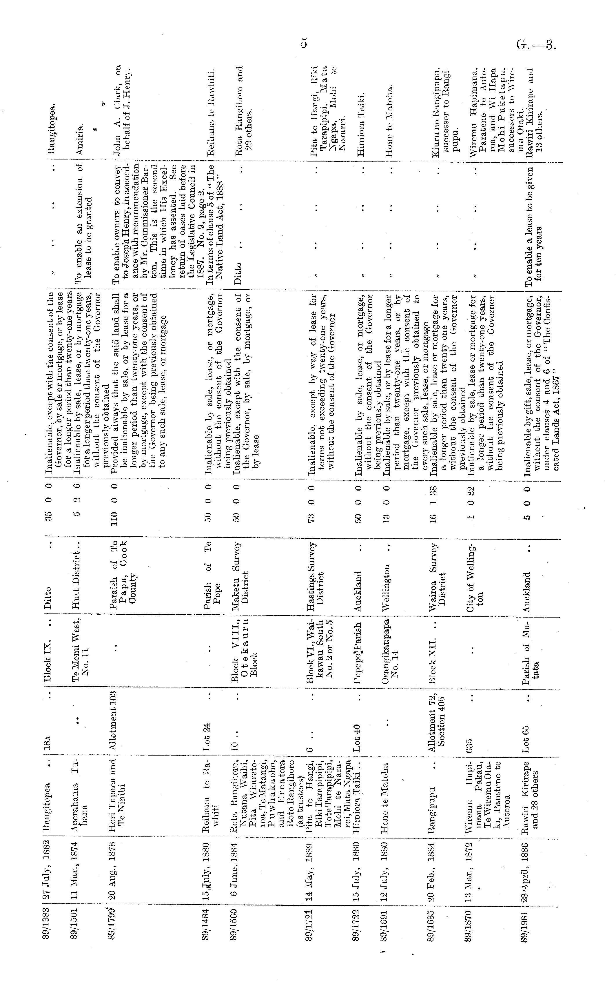 89/1383 [ 27 July, 1882 11 Mar., 1874 I 20 Aug., 1878 Rangitopea 18a Block IX. .. Ditto 35 0 0 ! Inalienable, except with the consent of the j „ .. .. .. j Rangitopea. ! Governor, by sale or mortgage, or by lease ! j for a longer period than twenty-one years | 5 2 6 Inalienable by sale, lease, or by mortgage \ To enable an extension of Amiria. for a longer period than twenty-one years, | lease to be granted without the consent of the Governor i previously obtained 1.10 0 0 Provided always that the said land shall j To enable owners to convey | John A. Clack, on be inalienable by sale, or by lease for a I to Joseph Henry, in accord- j behalf of J. Henry. j longer period than twenty-one years, or ance with recommendation I by mortgage, except with the consent of by Mr. Commissioner Bar- j the Governor being previously obtained ton. This is the second I to any such sale, lease, or mortgage j time in which His Excel- ! i lency has assented. See return of cases laid before i the Legislative Council in ! i 1887. No. 9, page 2. 50 0 0 | Inalienable by sale, lease, or mortgage, ; In terms of clause 5 of " The I Reihana te Rawhiti. j without the consent of the Governor ; Native Land Act, 1888" ■ being previously obtained 50 0 0 [inalienable, except with the consent of Ditto .. .. .. i Rota Rangihoro and ! the Governor, by sale, by mortgage, or 22 others^ I by lease 89/1501 Aperaharna Tuliana • • Te Momi West, No. 11 Hutt District.. Hcri Tupaea and Te Ninihi Allotment 103 Paraish of Te Papa, Cook County 89/1799* . I 89/1484 15,July, 1880 j Reikana te Ra- | whiti Lot 24 Parish of Te Pepe '"• ■=« 89/1560 6 June, 1884 I Rota Kangihoro, Nutana Waihi, I Pita Whareto- : roa,TeMatangi, I Puwhakaoho, I and E rea tora 1 Roto Rangihoro I (as trustees) 14 May, 1889 [ Pita te Hangi, Riki Tarapipipi, Tote Tarapipipi, ] Mohi te Nararei, Mata Ngapa 15 July, 1880 I Himiora Taiki .. 10 .. 10 .. .. Block VIII., j Block j Maketu Survey District ! i ! ! i I ! 89/1721 i 6 .. .. j Block VI., Waikawau South ; No. 2 or No. 5 Hastings Survey District j i 73 0 0 Inalienable, except by way of lease for i „ .. .. .. Pifca te Hangi, Kiki terms not exceeding twenty-one years, j Tarapipipi," Mata without the consent of the Governor Ngapa, Mohi Be Nararei. 89/1722 i Lot 40 .. PepepeJParish Auckland ! ! 50 0 0 Inalienable by sale, lease, or mortgage, I „ .. .. .. Himiora Taiki. without the consent of the Governor j being previously obtained 13 0 0 Inalienable by sale, or by lease for a longer j „ .. .. I Hone te Matoha. I period than twenty-one years, or by j mortgage, except with the consent of i i the Governor previously obtained to i every such sale, lease, or mortgage 16 1 38 Inalienable by sale, lease or mortgage for ! , ; .. .. .. KiurunoRatigipupu, a longer period than twenty-one years, I i successor to Rangiwithout the consent of the Governor j ! pupu. previously obtained 1 0 32 Inalienable by sale, lease or mortgage for „ .. ■ ■ .. ..Wiremu Hapimana, a longer period than twenty-one years, Paratene te Autowithout the consent of the Governor '• roa, and Wi Hapa being previously obtained Mohi P u k e t a p u. successors to Wiremu Otaki. 5 0 0 Inalienable by gift, sale, lease, or mortgage, To enable a lease to be given Rawiri Kirirape and without the consent of the Governor, for ten years ! 13 others, under clauses 4 and 6 of "TheConfisI cated Lands Act, 1867 " 89/1691 12 July, 1880 I Hone te Mafcoha j ! Wellington | Orangikaupapa ; No. 14 | 89/1635 20 Feb., 1884 Rangipupu Allotment 72, j Block XII. .. Section 405 j Wairoa SurveyDistrict 89/1870 13 Mar., 1872 Wiremu Hapimana Pakau. Te Wiremu Otaki, Paratene te [ Autoroa i 635 i City of Wellington | 19/1981 28'April, 1886 Rawiri Kirirape | and 28 others Auckland Lot 65 ,. Parish of Mata ta 1 5 0 0 ..